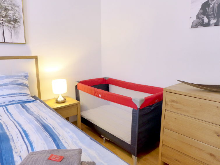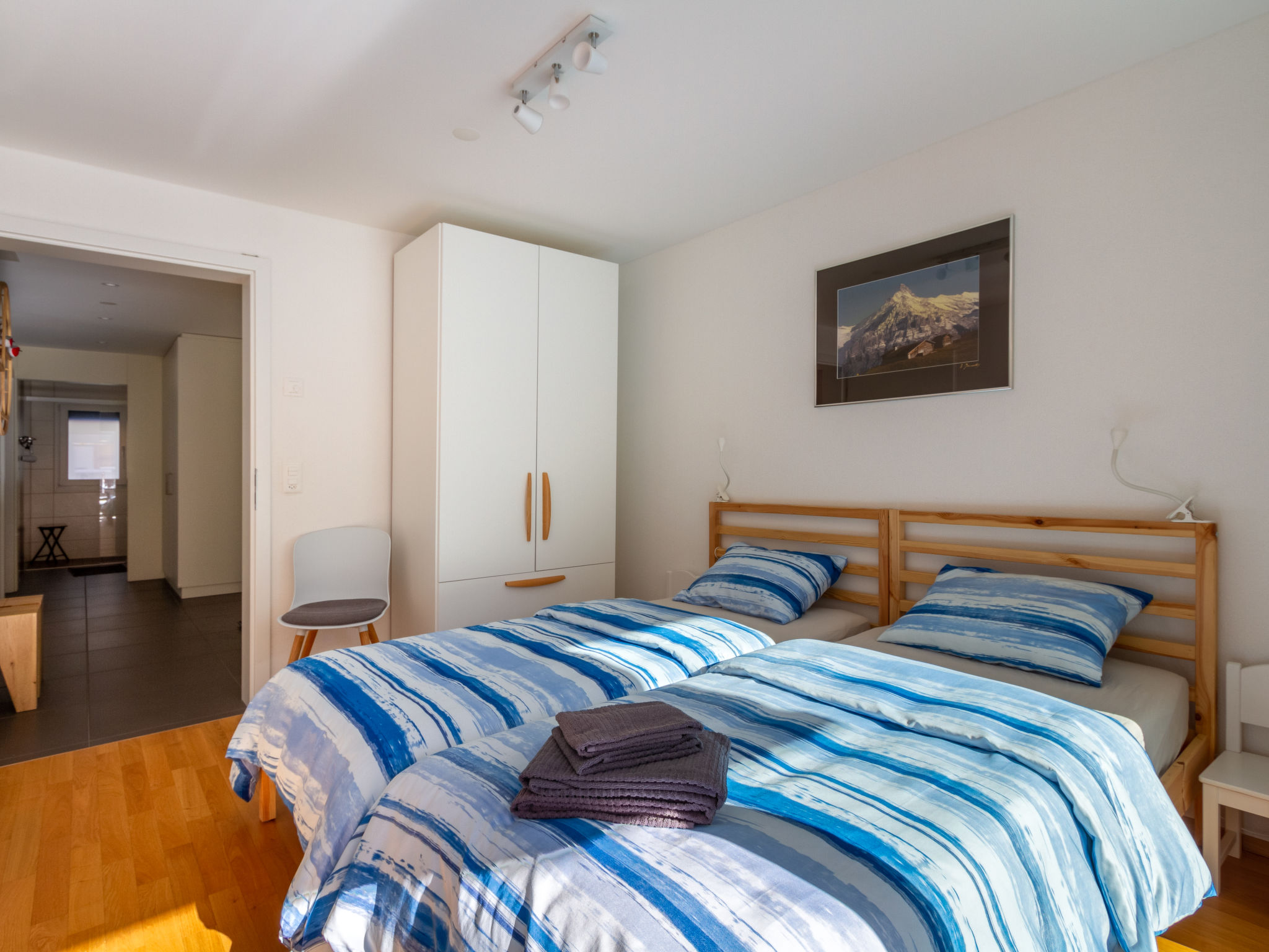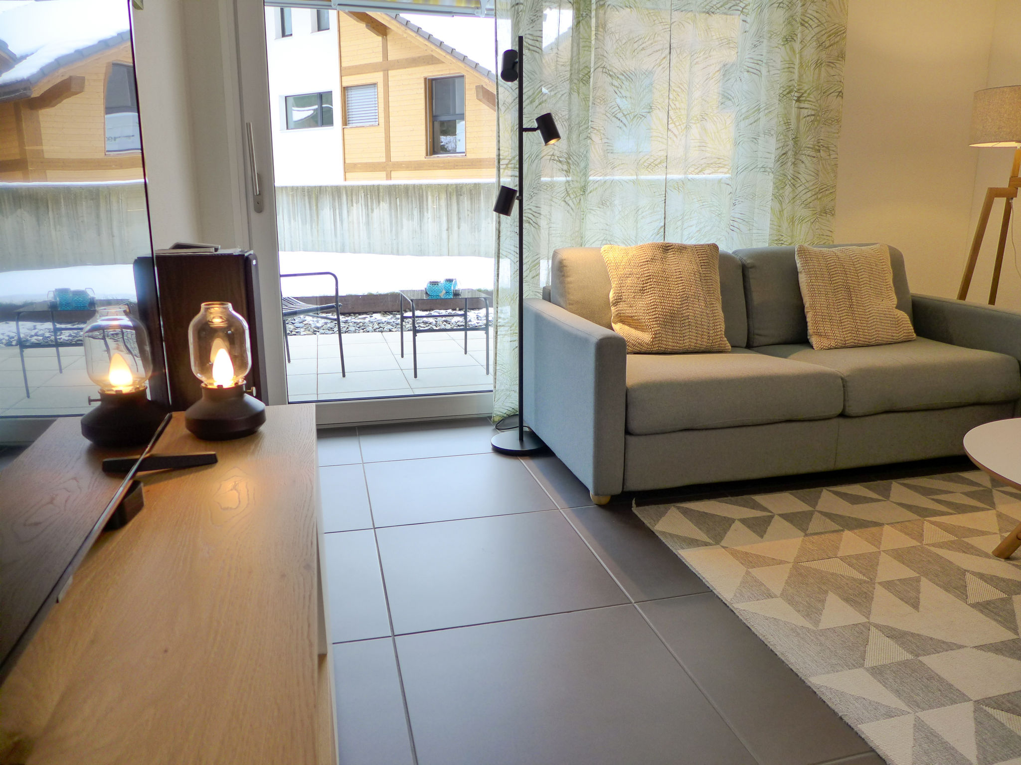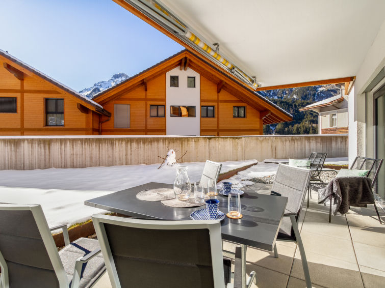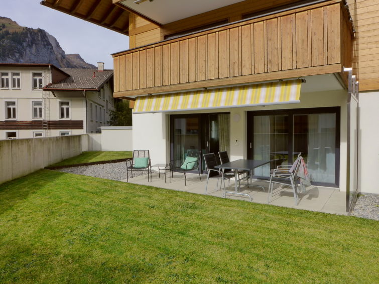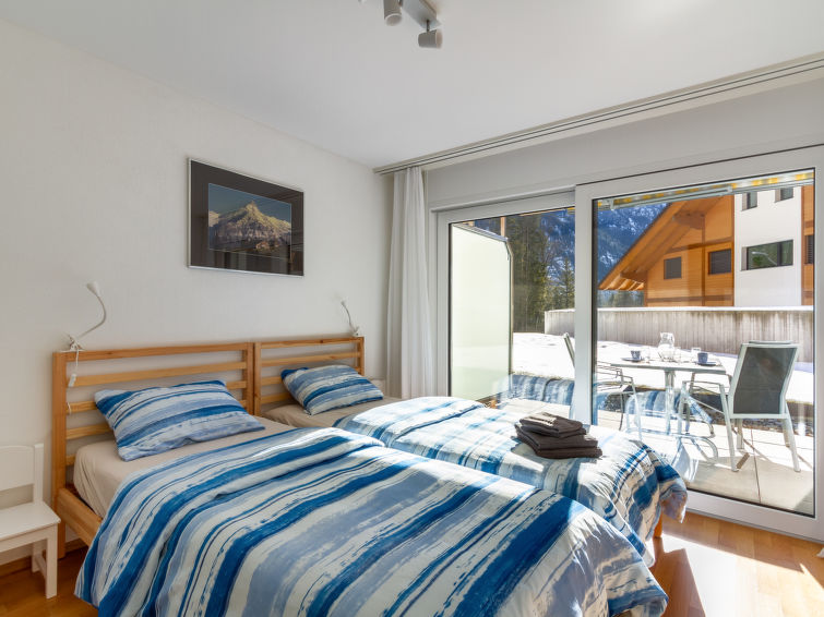 "Terrasse", 3-Zimmer-Wohnung 68 m2, im Erdgeschoss, Südlage. Geräumig und hell, sehr komfortabel und gemütlich eingerichtet: offenes Wohn-/Esszimmer mit Esstisch, Digital-TV, Flachbildschirm, Radio, Stereoanlage, Heimkino und elektrischem Rollladen. Ausgang zur Terrasse. 1 Doppelzimmer mit 1 Doppelbett (180 cm, Länge 200 cm). 1 Zimmer mit 2 Betten (90 cm, Länge 200 cm). Ausgang zur Terrasse. Offene Küche (Backofen, Geschirrspüler, 4 Glaskeramikplatten, Tiefkühler, elektrische Kaffeemaschine, Kapseln für die Kaffeemaschine (Tassimo) extra, Dampfgarer, Racletteofen, Fondue Set (Käse)). Dusche/WC. Fussbodenheizung. Parkettboden, Natursteinboden. Grosse Terrasse, Südlage. Terrassenmöbel. Sehr schöne Sicht auf die Berge und die Landschaft. Zur Verfügung: Bügeleisen, Kinderhochstuhl, Babybett bis 2 Jahre (extra), Haartrockner, Wickelkommode. Internet (Wireless LAN, gratis). Parkplatz (überdacht, 1 Auto). Bitte beachten: geeignet für Familien. Nichtraucher-Unterkunft.