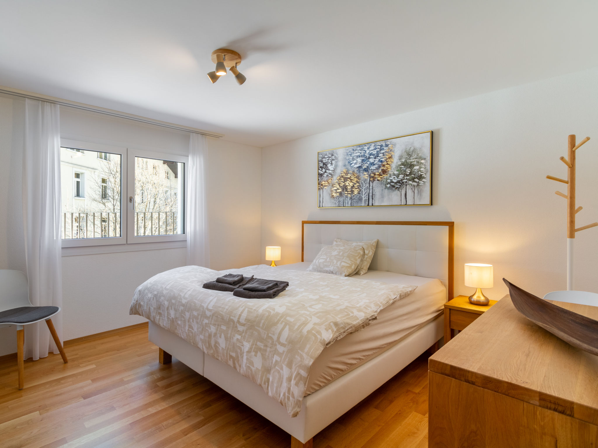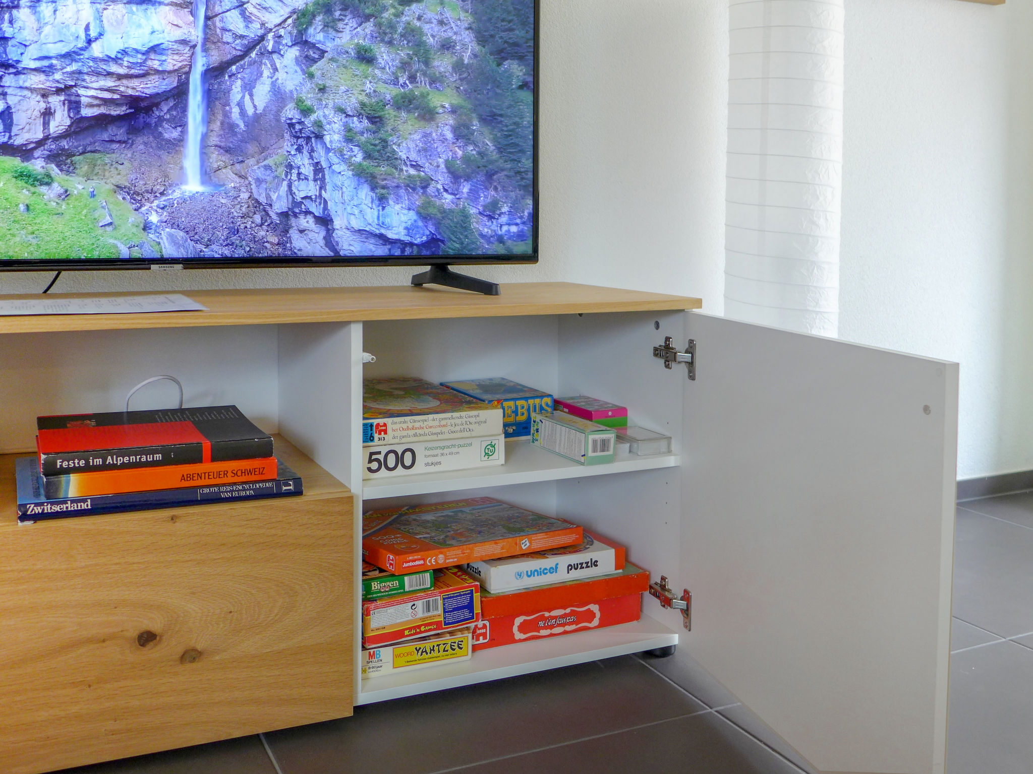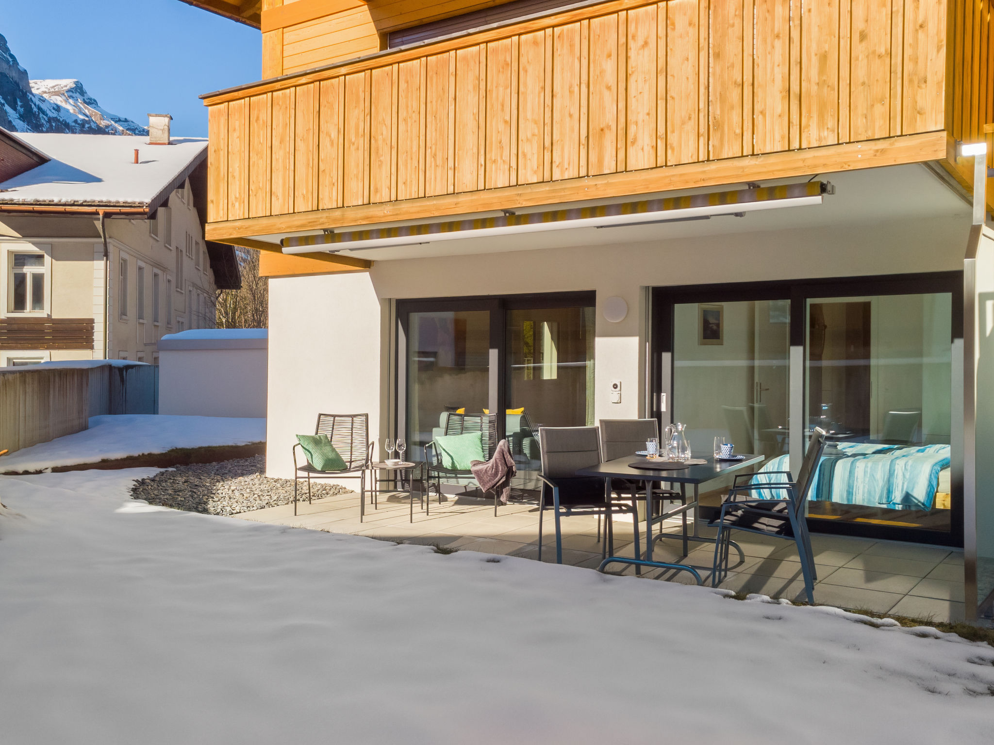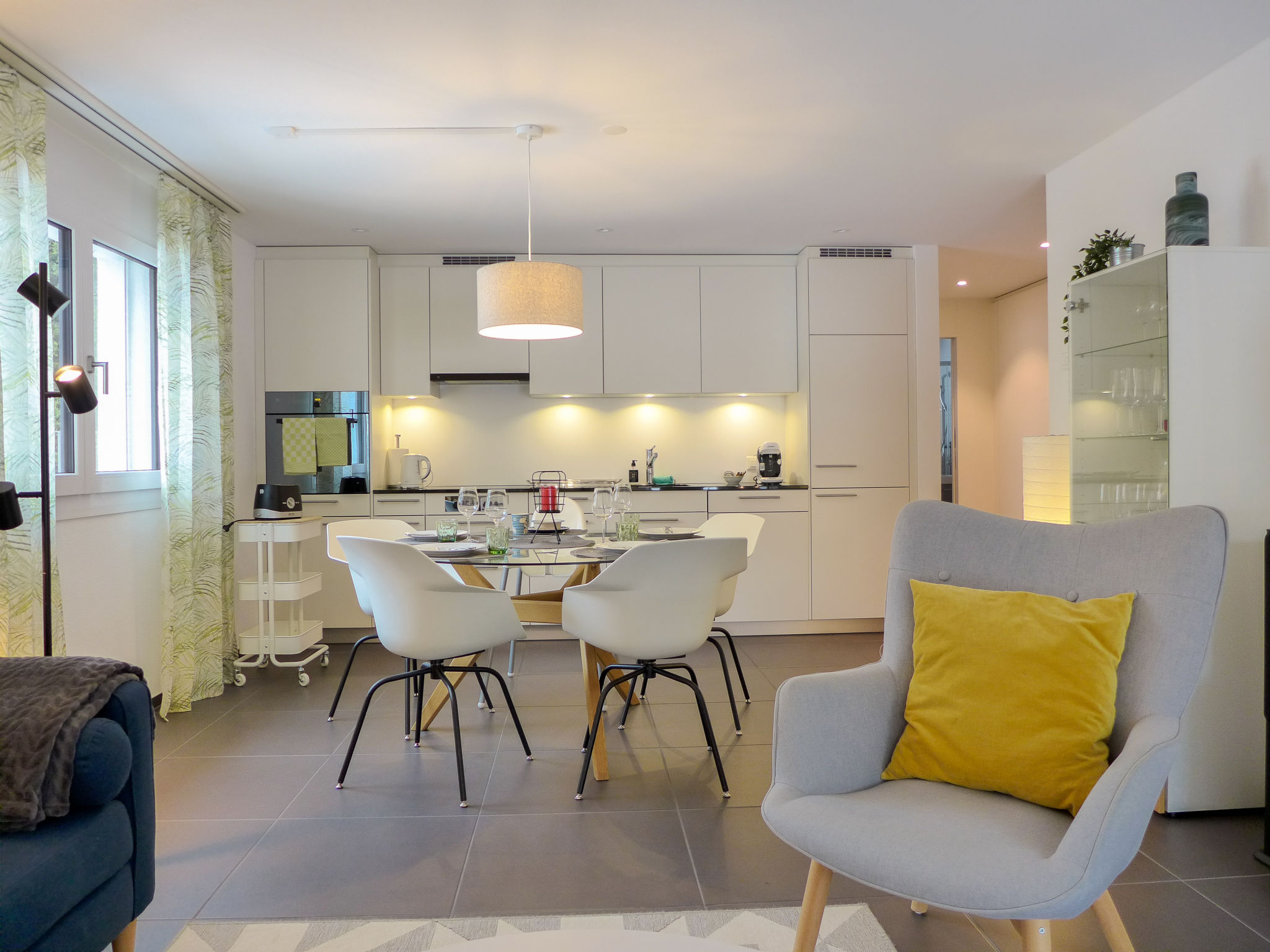 "Terrasse", 3-Zimmer-Wohnung 68 m2, im Erdgeschoss, Südlage. Geräumig und hell, sehr komfortabel und gemütlich eingerichtet: offenes Wohn-/Esszimmer mit Esstisch, Digital-TV, Flachbildschirm, Radio, Stereoanlage, Heimkino und elektrischem Rollladen. Ausgang zur Terrasse. 1 Doppelzimmer mit 1 Doppelbett (180 cm, Länge 200 cm). 1 Zimmer mit 2 Betten (90 cm, Länge 200 cm). Ausgang zur Terrasse. Offene Küche (Backofen, Geschirrspüler, 4 Glaskeramikplatten, Tiefkühler, elektrische Kaffeemaschine, Kapseln für die Kaffeemaschine (Tassimo) extra, Dampfgarer, Racletteofen, Fondue Set (Käse)). Dusche/WC. Fussbodenheizung. Parkettboden, Natursteinboden. Grosse Terrasse, Südlage. Terrassenmöbel. Sehr schöne Sicht auf die Berge und die Landschaft. Zur Verfügung: Bügeleisen, Kinderhochstuhl, Babybett bis 2 Jahre (extra), Haartrockner, Wickelkommode. Internet (Wireless LAN, gratis). Parkplatz (überdacht, 1 Auto). Bitte beachten: geeignet für Familien. Nichtraucher-Unterkunft.