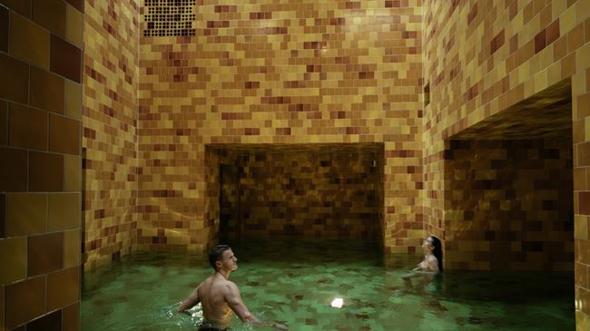 Die öffentlichen Verkehrsmittel (Bahn und Bus) und das Mineralbad & Spa Samedan