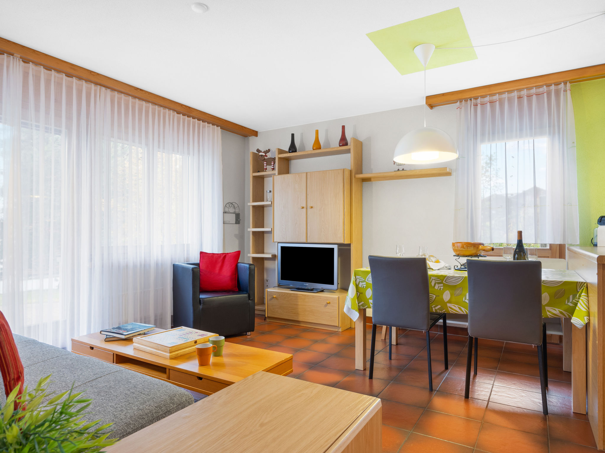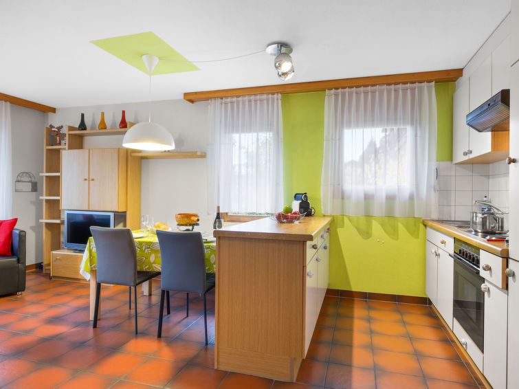 2-Zimmer-Wohnung 45 m2, im Erdgeschoss. Komfortabel und gemütlich eingerichtet: Wohn-/Esszimmer mit 1 Doppeldiwanbett und Kabel-TV (Flachbildschirm), Radio. Ausgang zum Garten, zur Terrasse. 1 Zimmer mit 2 Betten. Offene Küche (4 Kochplatten, Backofen, Tiefkühler, elektrische Kaffeemaschine). Dusche/WC. Terrasse 15 m2, Rasen 35 m2. Terrassenmöbel, Liegestühle (3). Schöne, auf die Berge, die Landschaft und die Ortschaft. Zur Verfügung: Kinderhochstuhl, Babybett. Bitte beachten: Nichtraucher-Unterkunft.
