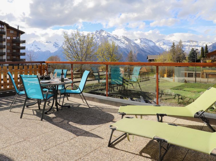 "Domaine des Reines D1A", 3-Zimmer-Wohnung 65 m2 im 1. Stock. Geräumig, komfortabel und schön eingerichtet: Wohn-/Esszimmer mit offenem Kamin, Kabel-TV und DVD. Ausgang zur Terrasse, Richtung Norden. 1 Zimmer mit 1 franz. Bett (160 cm, Länge 200 cm). 1 Zimmer mit 2 Betten (90 cm, Länge 200 cm). Ausgang zur Terrasse, Richtung Westen. Gepäckraum mit begehbarem Kleiderschrank. Offene Küche (Backofen, Geschirrspüler, 4 Glaskeramikplatten, Toaster, Wasserkocher, Mikrowelle, elektrische Kaffeemaschine, Kapseln für die Kaffeemaschine (nespresso) extra, Racletteofen, Fondue Set (Käse)). Ausgang zur Terrasse, Richtung Westen. Bad/WC. Terrasse 60 m2, Nordlage und Westlage. Terrassenmöbel, Liegestühle (6). Schöne Sicht auf die Berge. Zur Verfügung: Haartrockner. Internet (Wireless LAN, gratis). Parkplatz (überdacht), Höhe 210 cm, Breite 260 cm. Bitte beachten: Nichtraucher-Unterkunft.