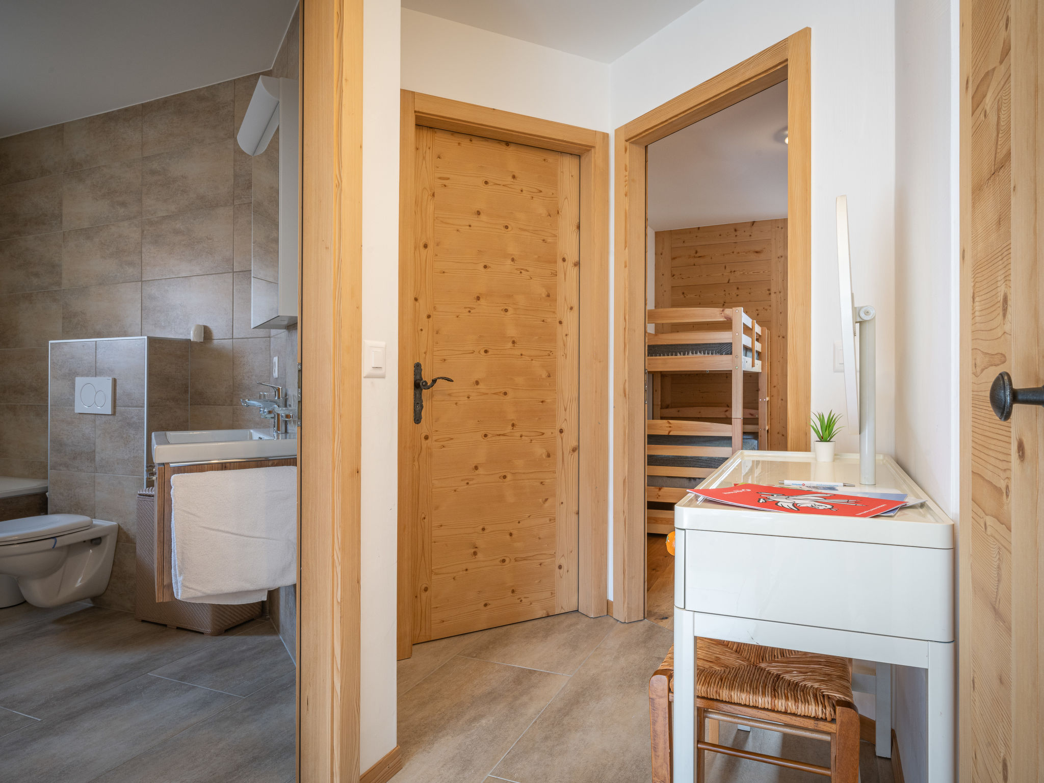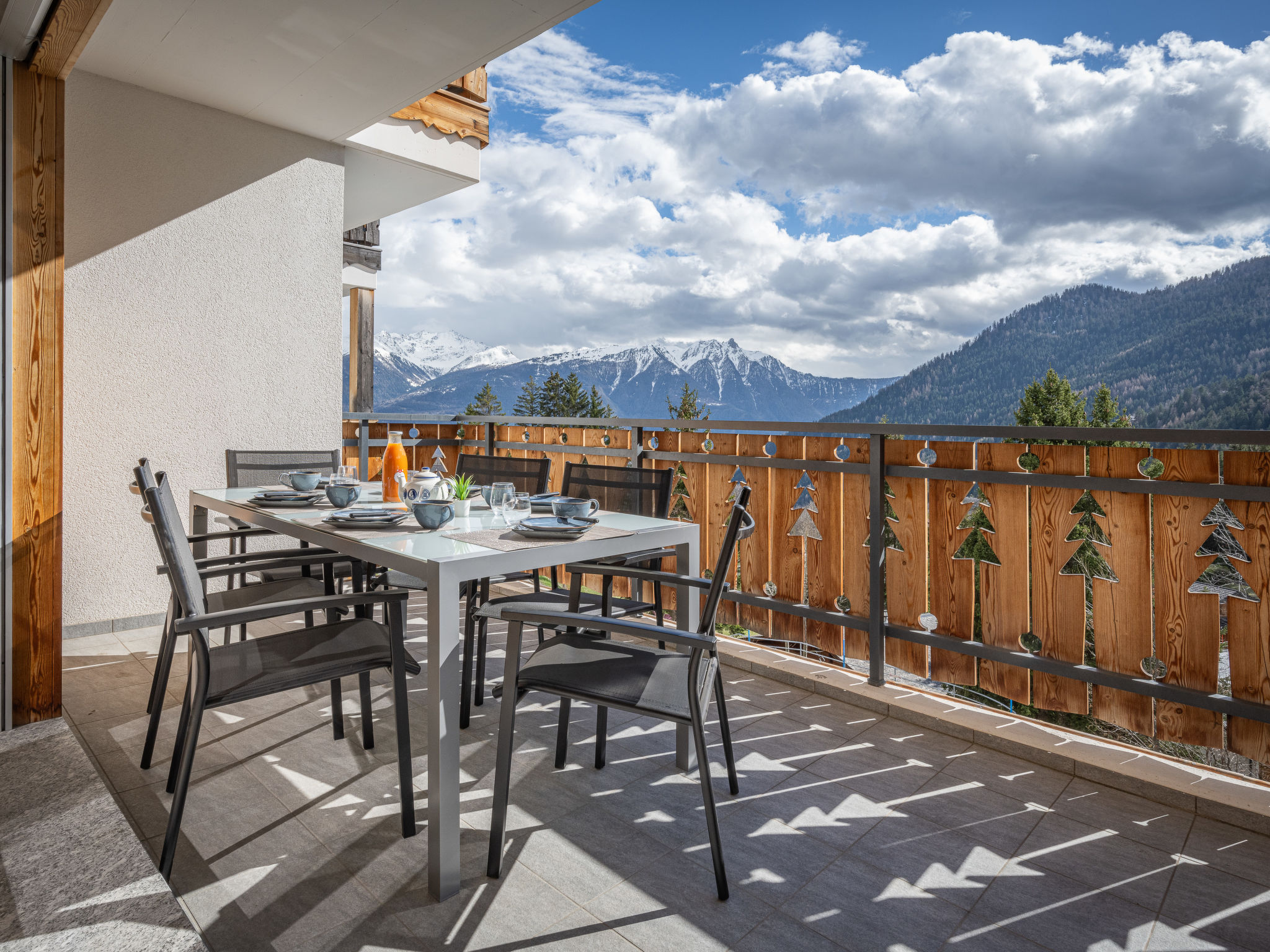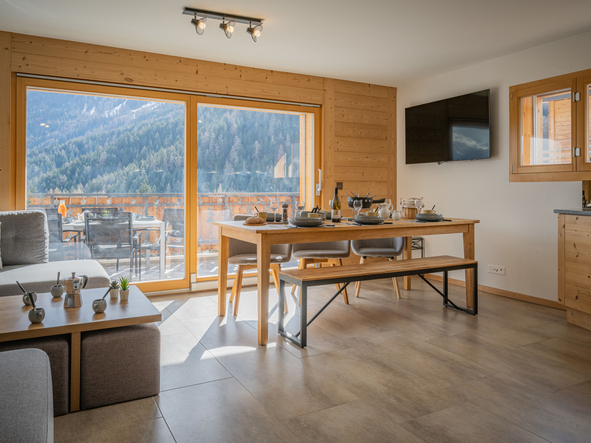 "L' O 12", 3-Zimmer-Wohnung 90 m2 im 3. Stock, Südlage. Geräumig und hell, komfortabel und modern eingerichtet: Eingang. Wohn-/Esszimmer mit Kabel-TV. Ausgang zum Balkon, Richtung Süden. 1 Zimmer mit 1 franz. Bett (190 cm, Länge 200 cm), Bad/WC und Kabel-TV. 1 Kinderzimmer mit 2 x 2 Etagenbetten (90 cm, Länge 200 cm). Offene Küche (Geschirrspüler, 4 Glaskeramikplatten, Toaster, Wasserkocher, Tiefkühler, elektrische Kaffeemaschine, Kapseln für die Kaffeemaschine (Delizio) extra, Racletteofen, Fondue Set (Chinoise, Käse)) mit Esstisch. Bad/WC, sep. WC. Grosser Balkon 12 m2, Südlage. Balkonmöbel, Liegestühle (2). Sehr schöne Sicht auf die Berge. Zur Verfügung: Waschmaschine, Wäschetrockner, Bügeleisen, Haartrockner. Internet (Wireless LAN, gratis). Parkplatz Nr. 38 (1 Auto), Garage Nr. 2 (1 Auto), Höhe 200 cm, Breite 230 cm. Bitte beachten: geeignet für Familien. Nichtraucher-Unterkunft.