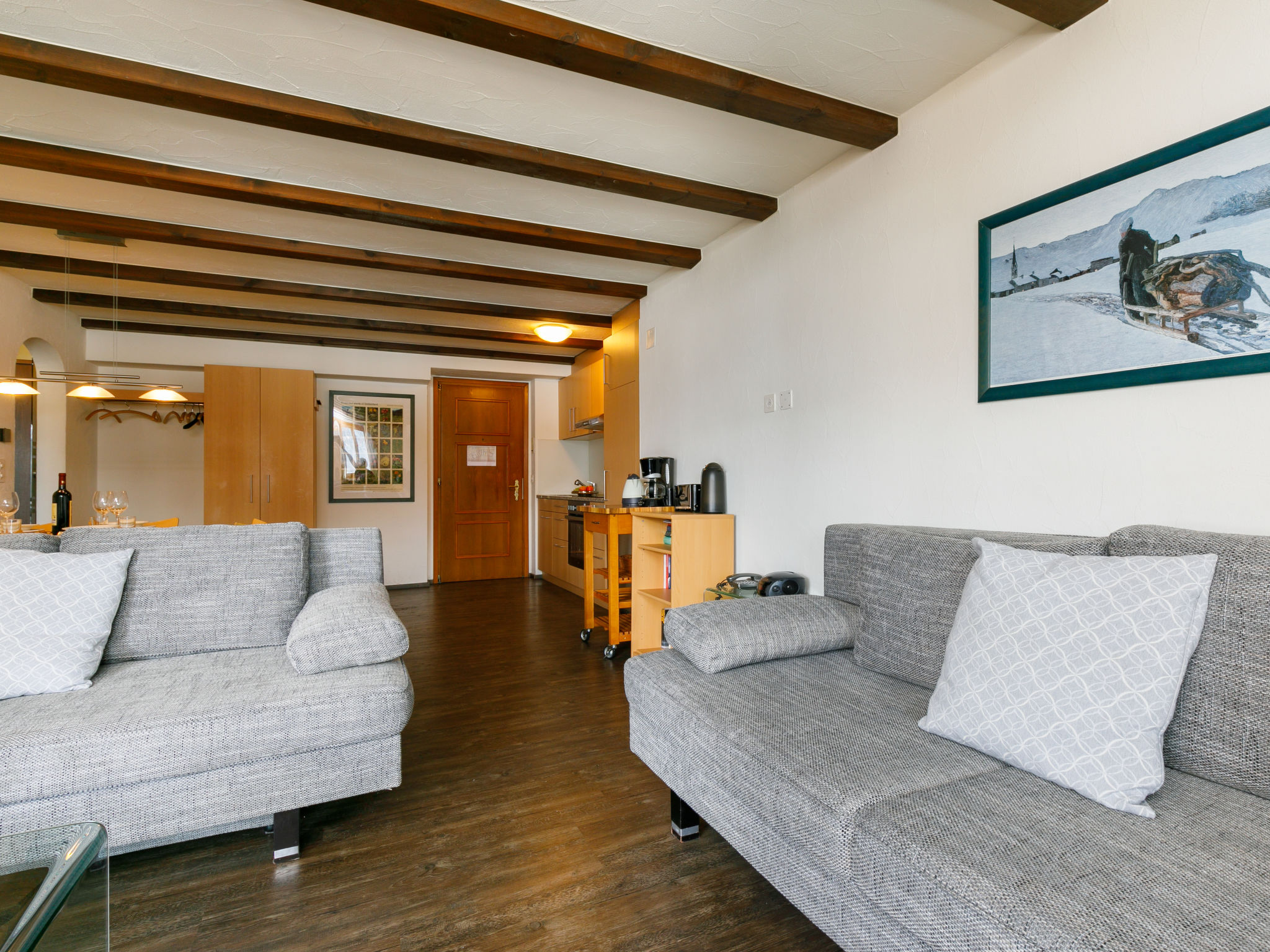 "Residenza Chesa Margun 79-3", 2-Zimmer-Wohnung 65 m2. Geräumig, sehr schön und gemütlich eingerichtet: Wohn-/Esszimmer mit 2 Diwanbetten, Digital-TV, Flachbildschirm und Radio. Ausgang zum Balkon. 1 Doppelzimmer. Grosse, offene Küche (Backofen, Geschirrspüler, 4 Glaskeramikplatten, elektrische Kaffeemaschine) mit Esstisch. Bad/WC. Balkon, Südlage. Schöne Sicht auf die Berge und die Ortschaft. Zur Verfügung: Internet (Wireless LAN, gratis). Garage.