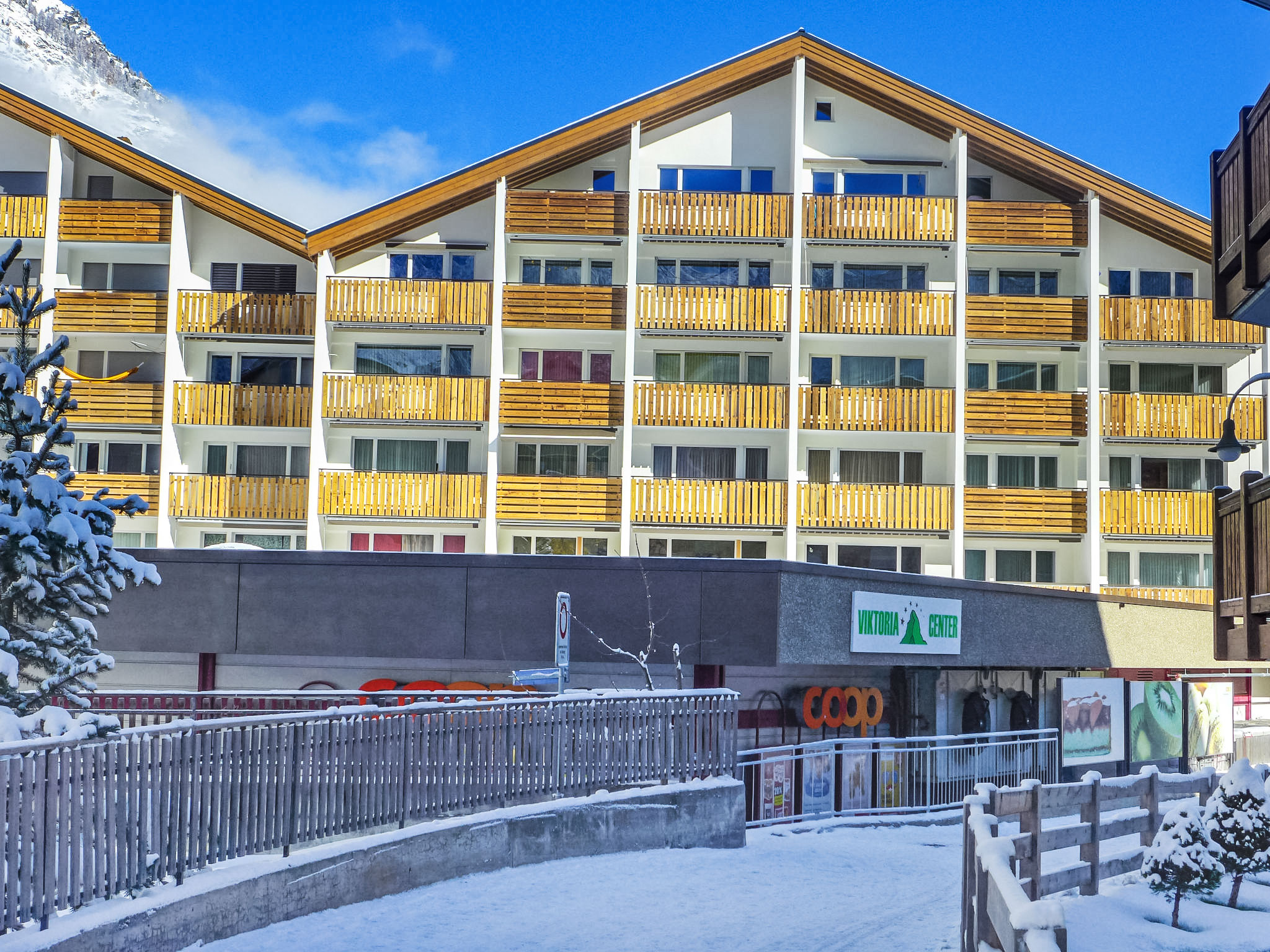 Grosses Mehrfamilienhaus "Viktoria B", auf 5 Stockwerken. Im Ortszentrum von Zermatt, zentrale, sonnige Lage. Im Hause: Fahrstuhl, Skiraum, Zentralheizung. Supermarkt, Restaurant 5 m, Bar 5 m, Bäckerei 25 m, Bushaltestelle "Bahnhof" 60 m, Bahnstation "Bahnhof Zermatt" 60 m. Bergeisenbahn, Skiverleih 5 m, Skibushaltestelle 60 m, Skischule 280 m, Kinderskischule.