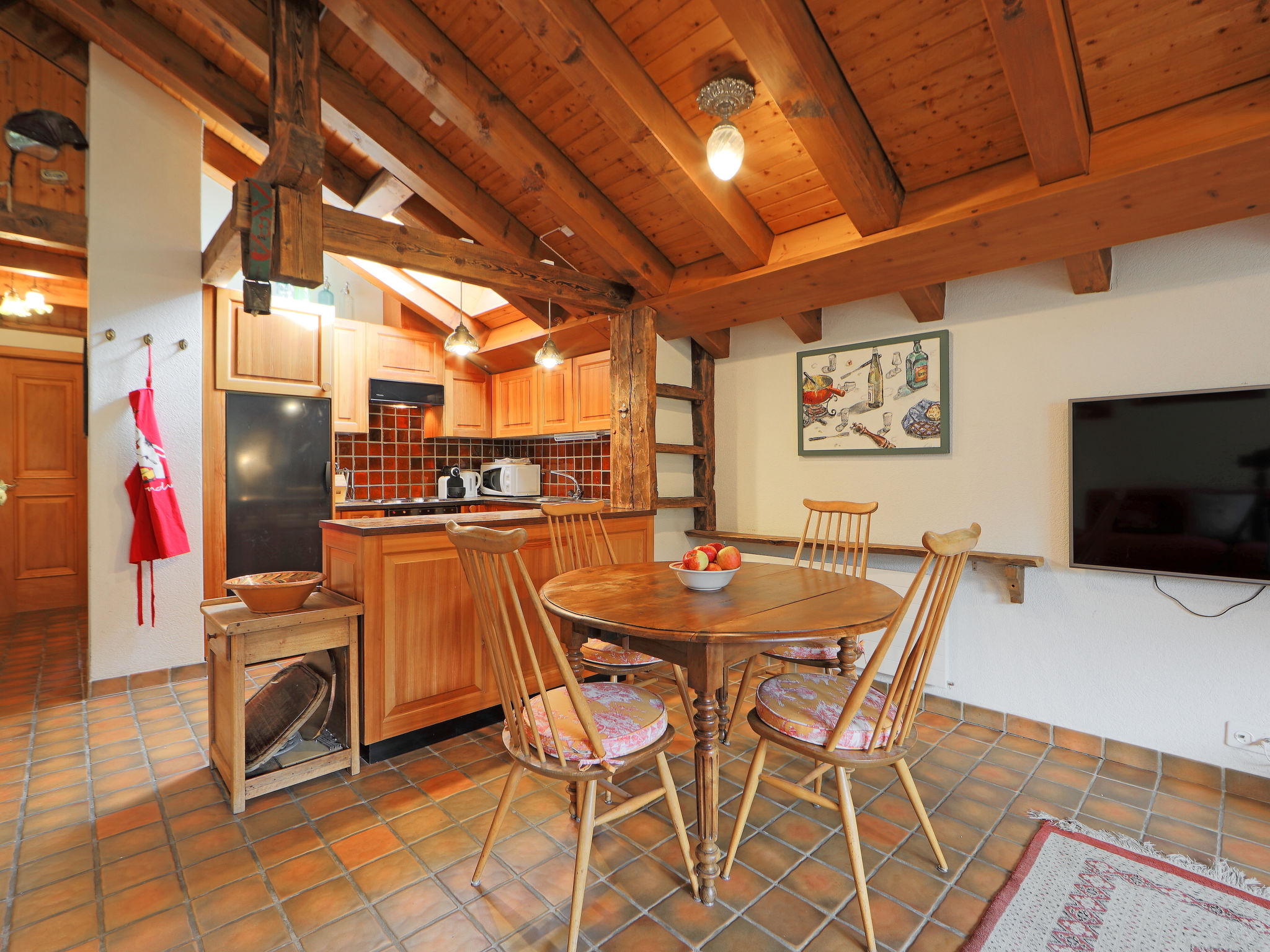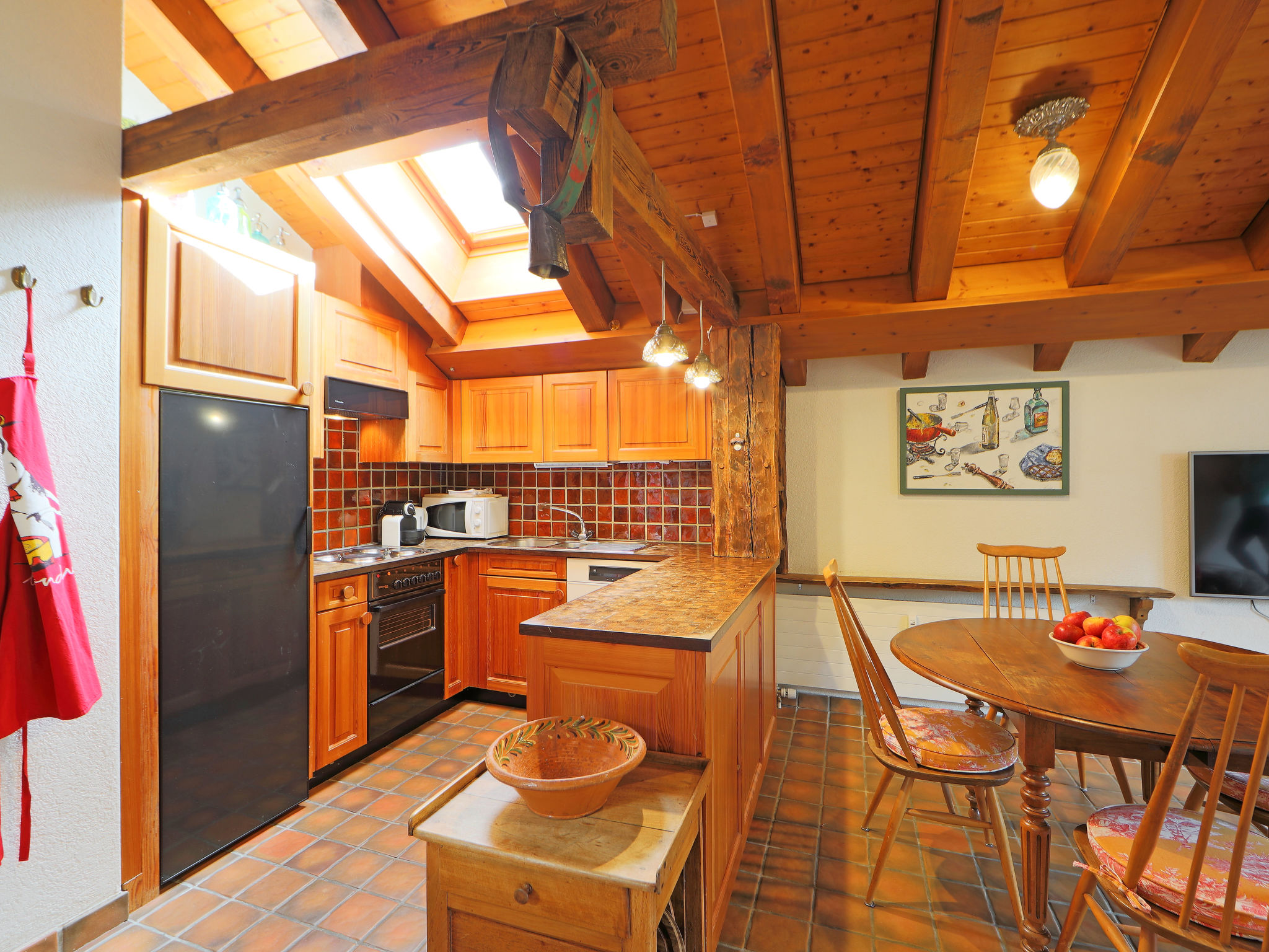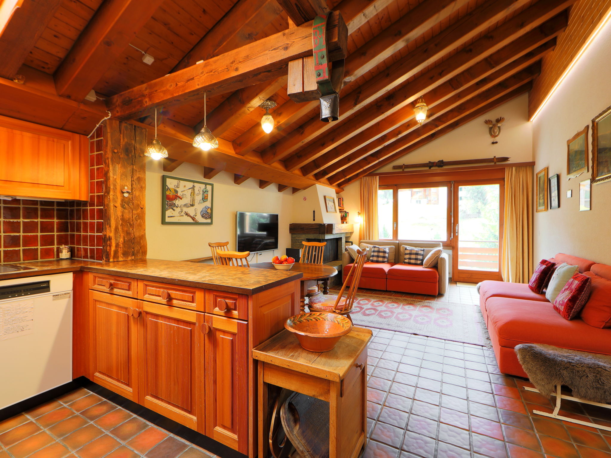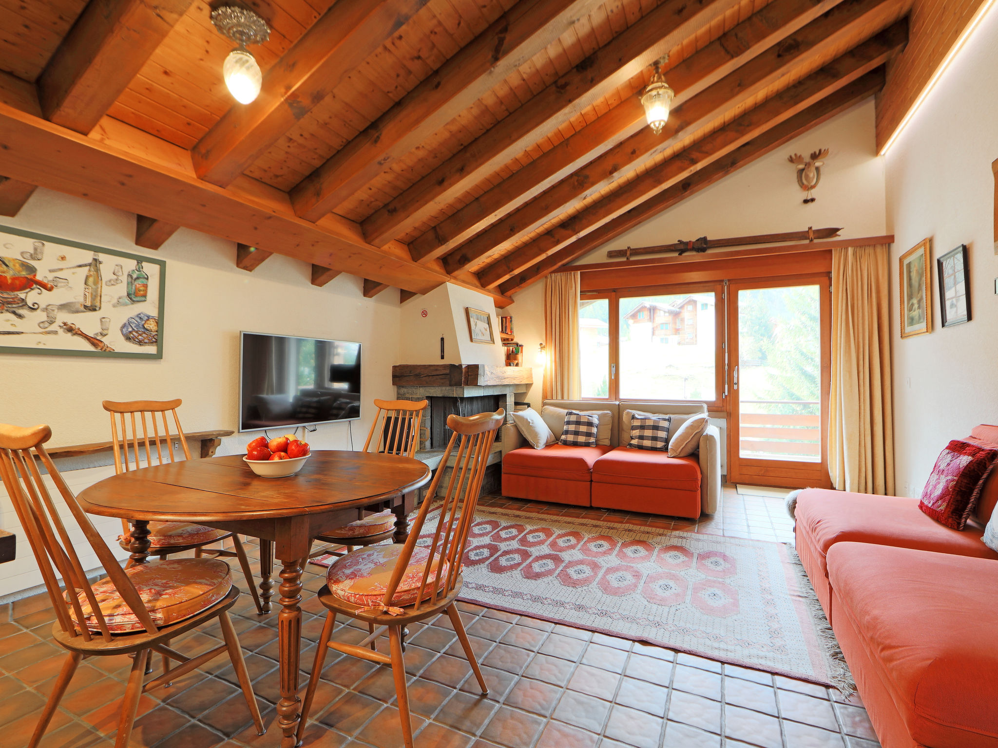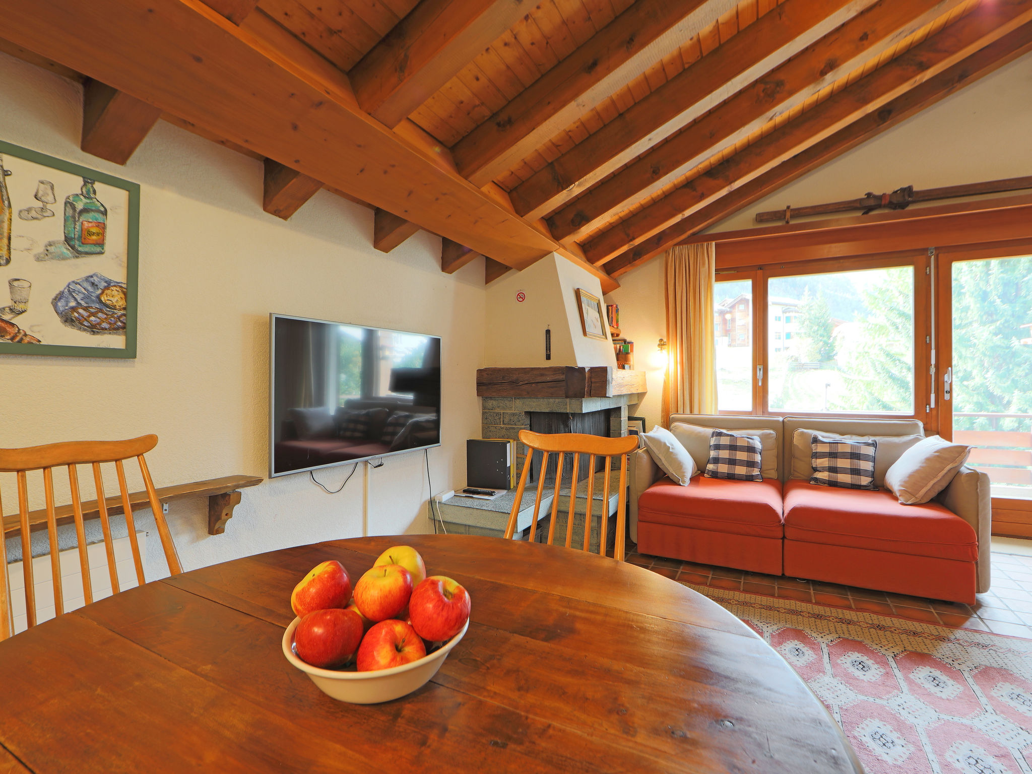2-Zimmer-Wohnung 65 m2, im Dachgeschoss. Teilweise abgeschrägt, einfach und gemütlich eingerichtet: Wohn-/Schlafzimmer mit 2 Diwanbetten (80 cm, Länge 200 cm), offenem Kamin (nur Deko), Esstisch und TV. Ausgang zum Balkon. 1 Zimmer mit 2 Betten (90 cm, Länge 210 cm). Offene Küche (4 Kochplatten, Backofen, Geschirrspüler, Toaster, Wasserkocher, Mikrowelle, Tiefkühler, elektrische Kaffeemaschine, Racletteofen, Fondue Set (Käse)). Bad/WC. Balkon. Balkonmöbel. Schöne Sicht auf die Berge und Matterhorn. Zur Verfügung: Haartrockner. Internet (Wireless LAN, gratis). Bitte beachten: Nichtraucher-Unterkunft.