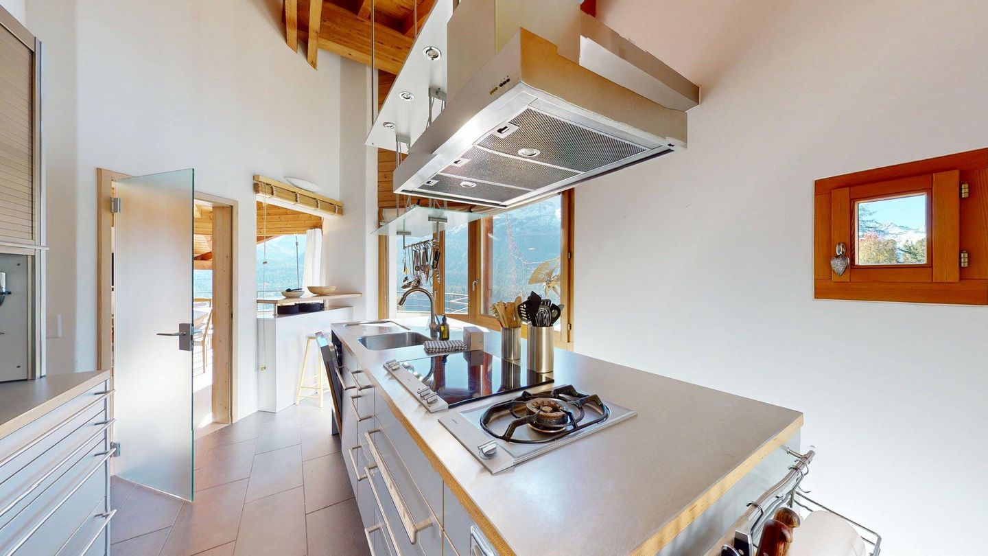 Das grosszügige, lichtdurchflutete Wohn- und Esszimmer bietet einen atemberaubenden Ausblick auf die Engadiner Bergwelt und öffnet sich zu einem sonnigen Balkon – der perfekte Ort, um entspannte Stunden zu geniessen. Die geschlossene, modern ausgestattete Küche lädt zu kulinarischen Momenten ein und ist bestens ausgestattet.