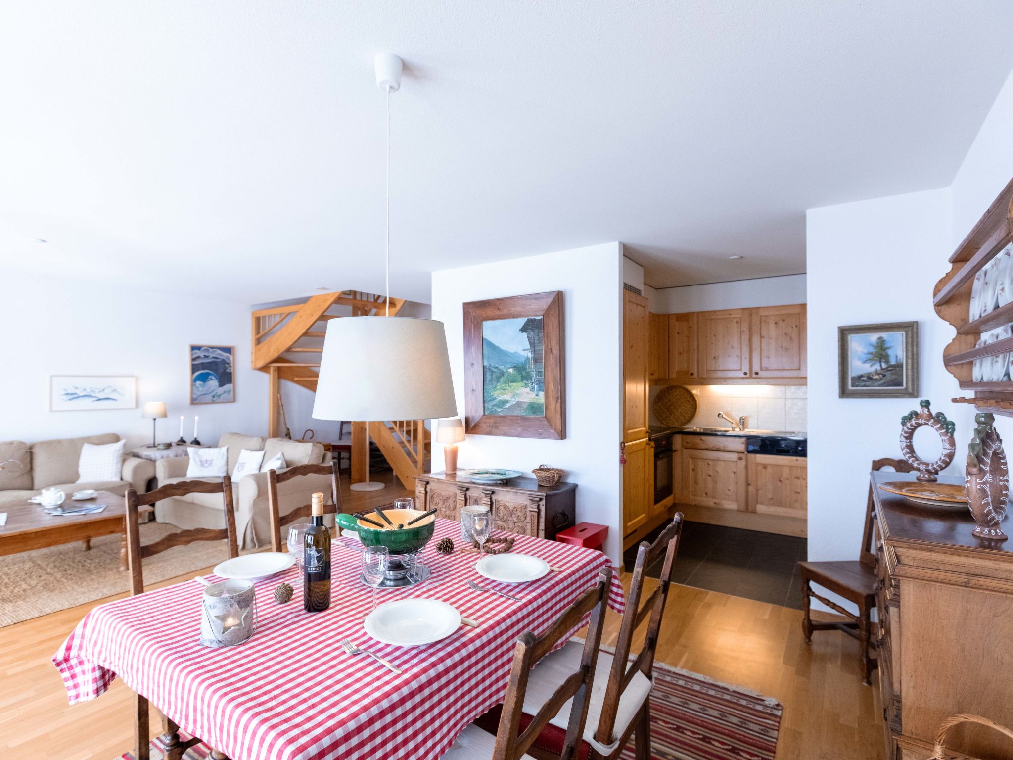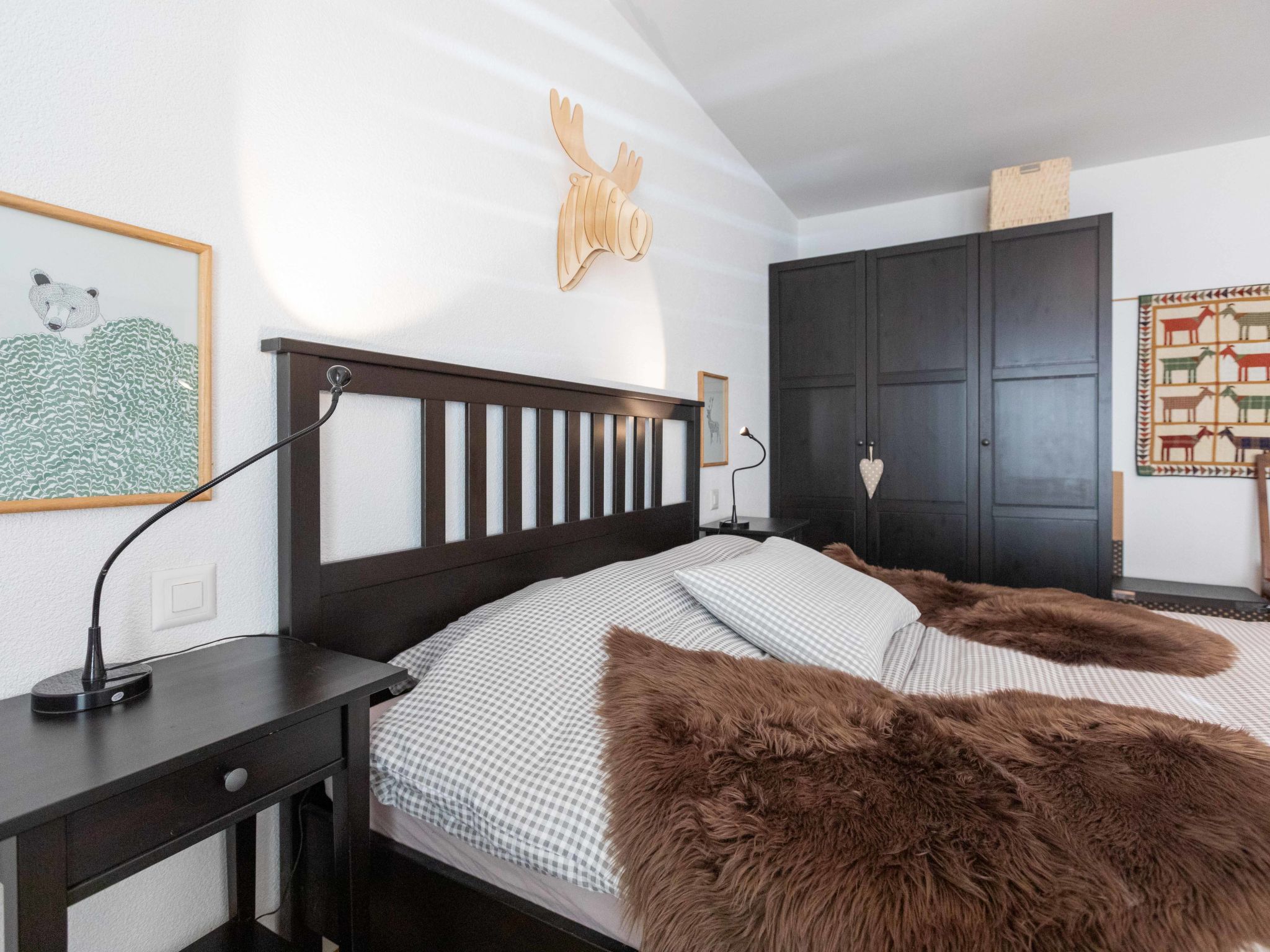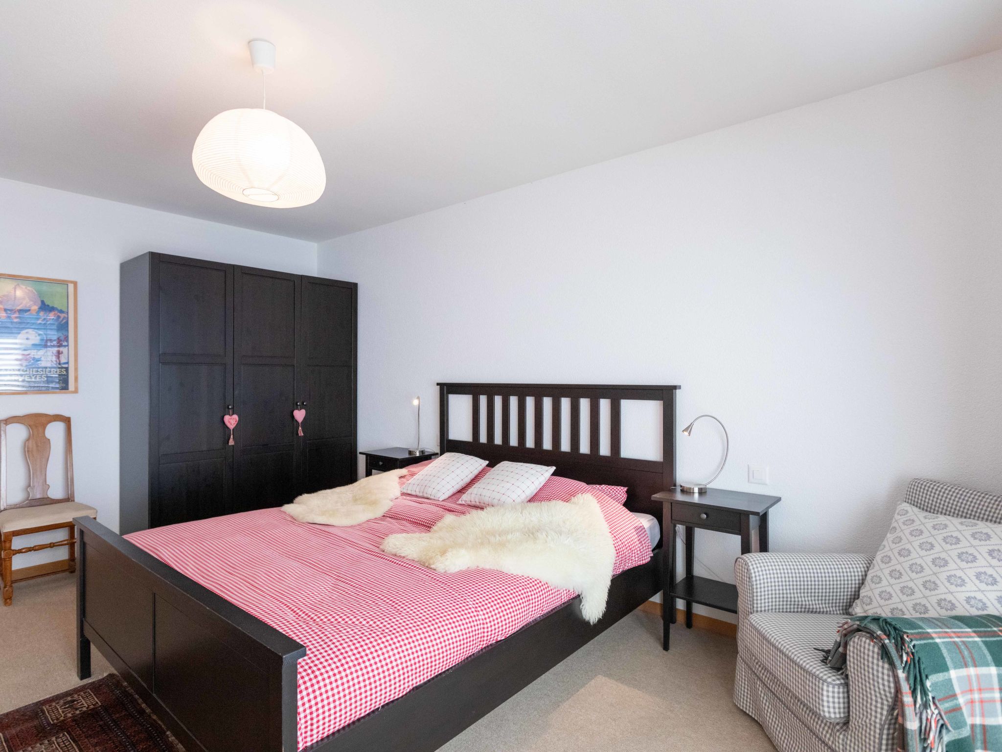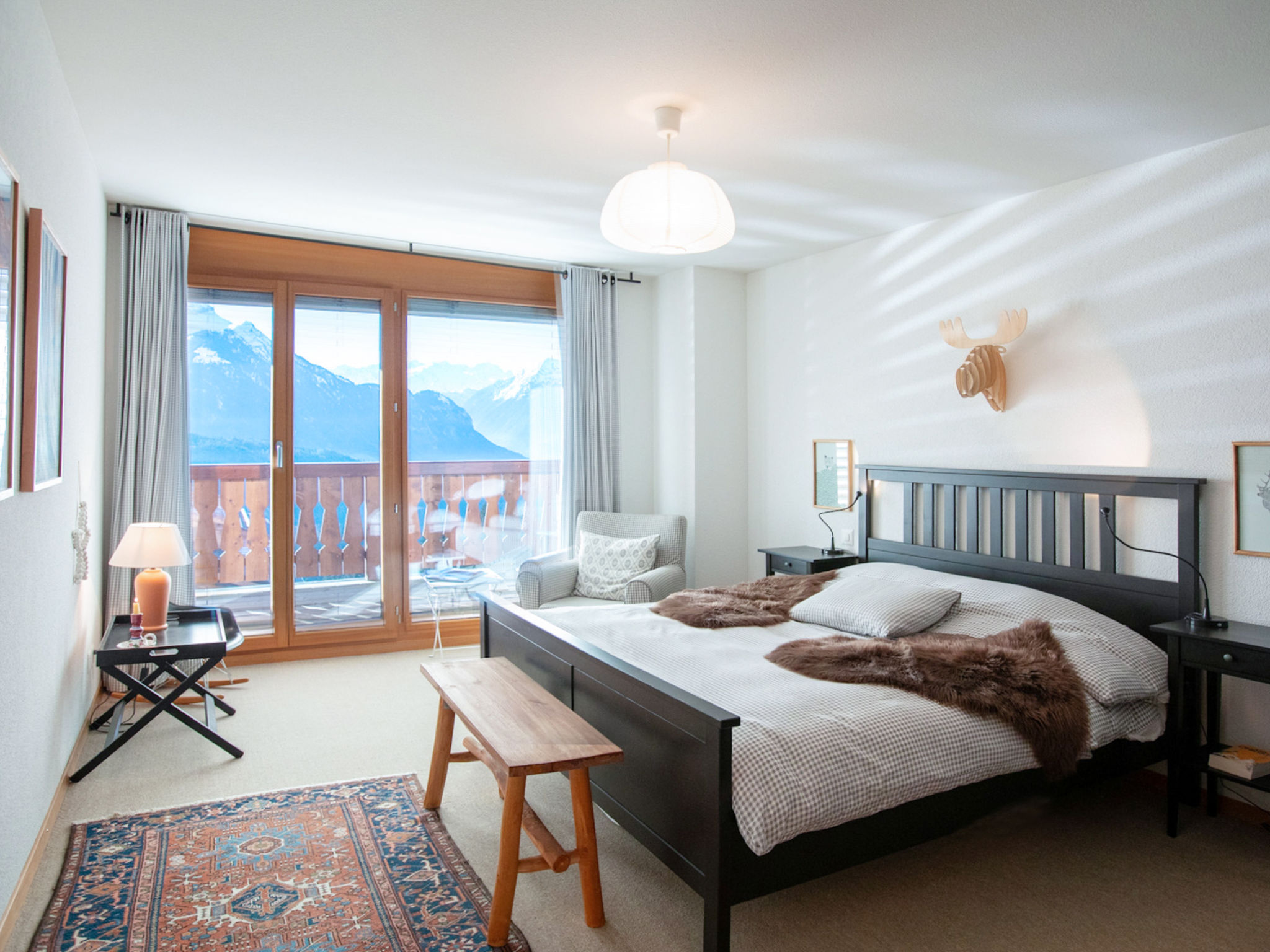"Matin Calme A2", 3-Zimmer-Wohnung 99 m2 auf 2 Stockwerken, im Erdgeschoss, Südwestlage. Zweckmässig und komfortabel eingerichtet: Wohn-/Esszimmer mit offenem Kamin, Esstisch und TV (Flachbildschirm). Ausgang zum Garten, Richtung Süden und Richtung Südwesten. Offene Küche (Backofen, Geschirrspüler, 4 Glaskeramikplatten, Toaster, Wasserkocher, Tiefkühler, elektrische Kaffeemaschine, Kapseln für die Kaffeemaschine (Nespresso) extra, Racletteofen, Fondue Set (Käse)). Sep. WC. Obergeschoss: 1 Zimmer mit 1 franz. Bett (1 x 160 cm, Länge 200 cm). Ausgang zum Balkon, Richtung Südwesten. 1 Zimmer mit 1 franz. Bett (1 x 160 cm, Länge 200 cm). Ausgang zum Balkon, Richtung Südwesten. Bad/WC. Balkon, Südwestlage, Garten, Südwestlage. Balkonmöbel. Sehr schöne Sicht. Zur Verfügung: Waschmaschine, Wäschetrockner, Bügeleisen, Haartrockner. Internet (Wireless LAN, gratis). Garage Nr. 5 (1 Auto). Bitte beachten: Nichtraucher-Unterkunft, Parkplatz nur für kleine Wagen.