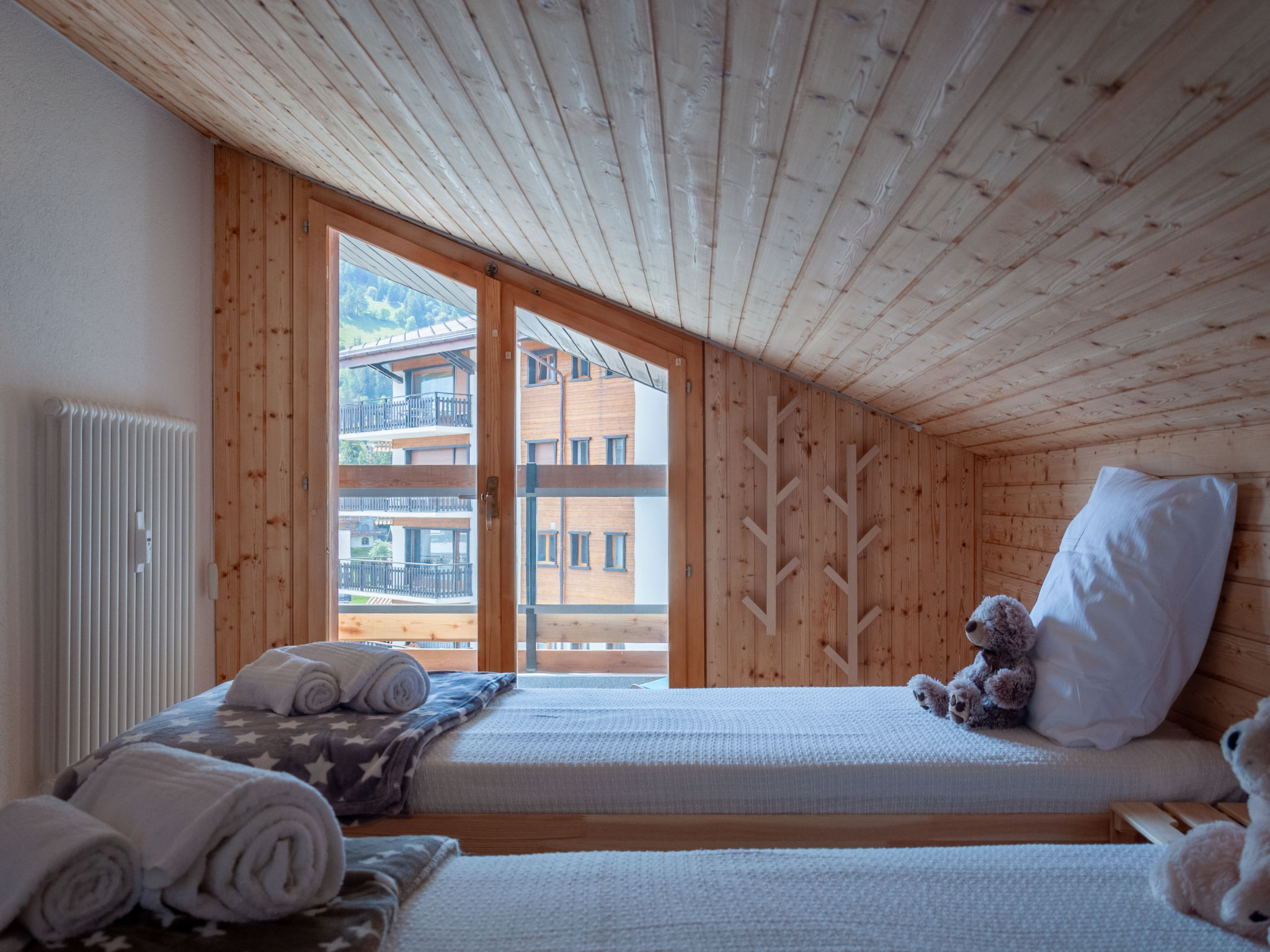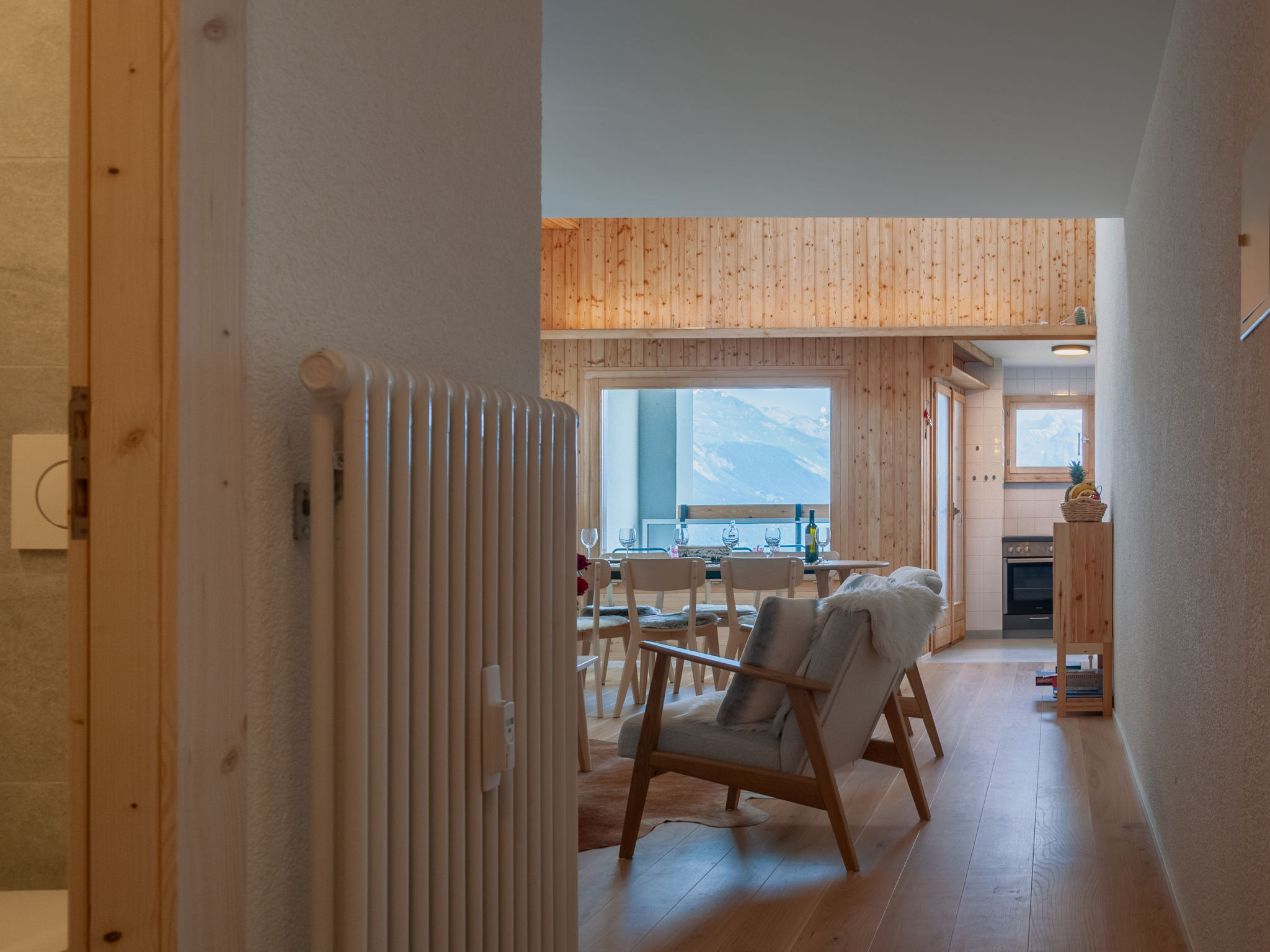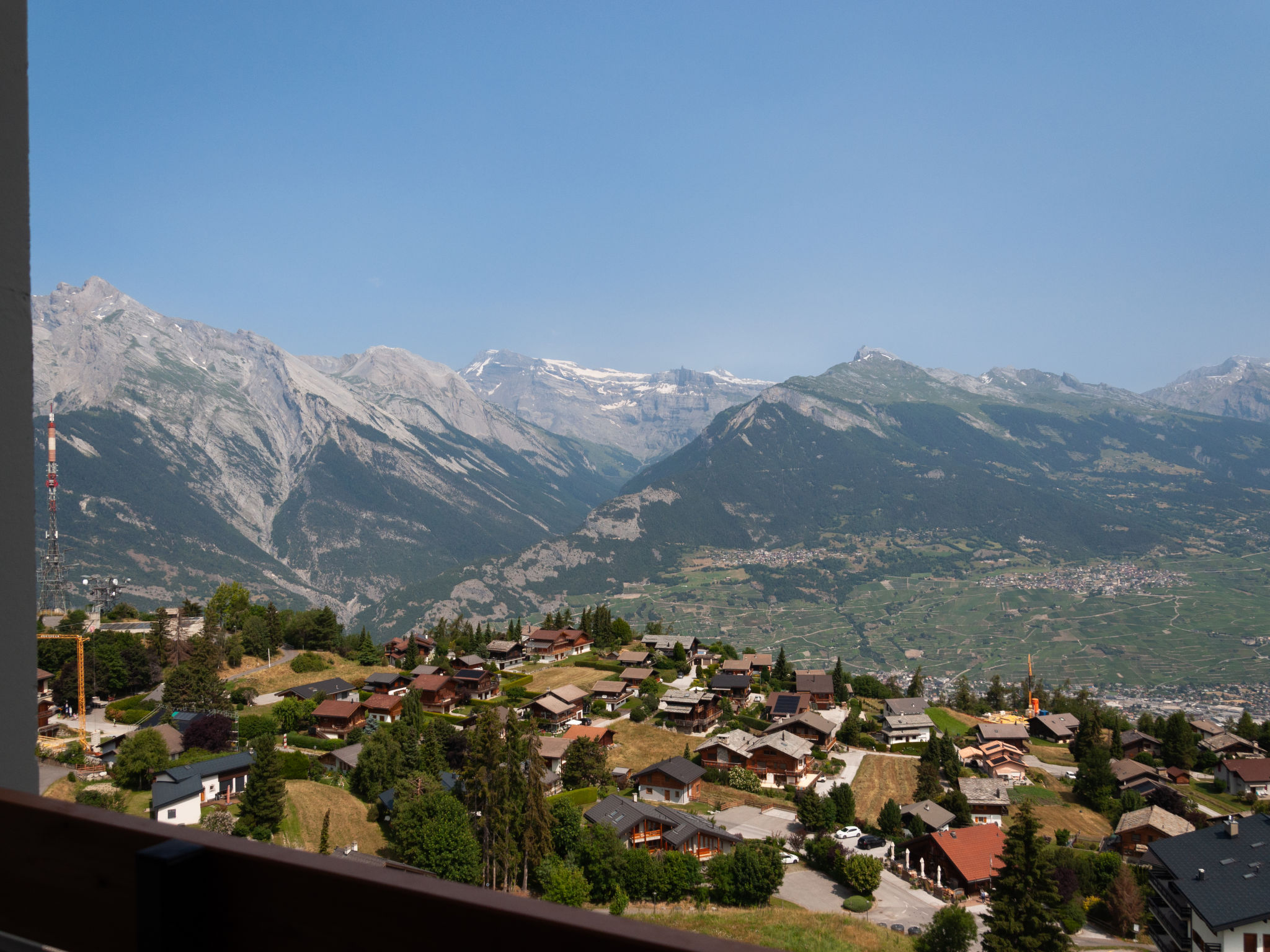 "Haut de Cry 16", 3-Zimmer-Wohnung 83 m2 auf 2 Stockwerken im 4. Stock. Eingang. Wohn-/Esszimmer mit offenem Kamin (nur Deko). Ausgang zum Balkon, Richtung Norden. 1 Zimmer mit 1 franz. Bett (160 cm, Länge 200 cm), Dusche/WC. Ausgang zum Balkon, Richtung Süden. Offene Küche (Backofen, Geschirrspüler, 4 Glaskeramikplatten, Toaster, Wasserkocher, elektrische Kaffeemaschine, Kapseln für die Kaffeemaschine (Nespresso) extra, Fondue Set (Käse)). Sep. WC. E-Heizung. Obergeschoss: 1 abgeschrägtes Kinderzimmer, Deckenhöhe 100 - 180 cm mit 2 Betten (80 cm, Länge 200 cm). Ausgang zum Balkon, Richtung Süden. Abgeschrägte, offene Galerie mit 1 Doppeldiwanbett (140 cm, Länge 200 cm). Dusche. Kleiner Balkon 5 m2, Nordlage Balkon 5 m2, Südlage. Balkonmöbel. Schöne Sicht auf die Berge und das Tal. Zur Verfügung: Internet (Wireless LAN, gratis). Bitte beachten: Nichtraucher-Unterkunft. Anstelle eines abgeschlossenen Schlafzimmers befinden sich manche Schlafplätze in einem offenen Bereich (Galerie, Nische etc.). 898542