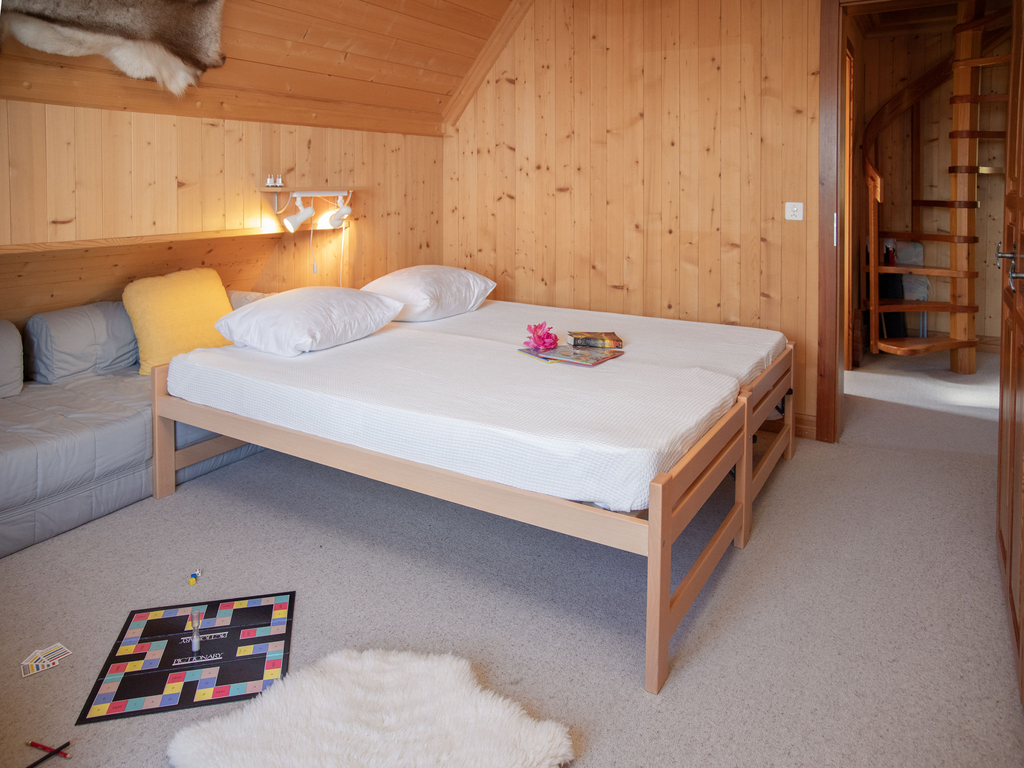 "Chalet Les Portes", 4-Zimmer-Chalet 135 m2 auf 3 Stockwerken, Nordostlage. Komfortabel und geschmackvoll eingerichtet: Wohn-/Esszimmer mit offenem Kamin und TV. Ausgang zur Terrasse, Richtung Nordosten. Offene Küche (4 Kochplatten, Backofen, Geschirrspüler, Toaster, Wasserkocher, elektrische Kaffeemaschine, Kapseln für die Kaffeemaschine (Nespresso), Racletteofen, Fondue Set (Käse)). Dusche/WC, sep. WC. Obergeschoss: 1 Zimmer mit 1 Doppelbett (160 cm, Länge 200 cm). Ausgang zum Balkon. 1 Zimmer mit 3 Betten (90 cm, Länge 200 cm). Ausgang zum Balkon. Dusche/WC. Dachgeschoss: 1 abgeschrägtes Zimmer mit 1 Doppelbett (2 x 90 cm, Länge 200 cm). Balkon, Terrasse. Terrassenmöbel. Herrliche Panoramasicht auf die Berge, die Skipiste und die Landschaft. Zur Verfügung: Waschmaschine, Haartrockner. Internet (WLAN, gratis). Bitte beachten: Nichtraucher-Unterkunft.