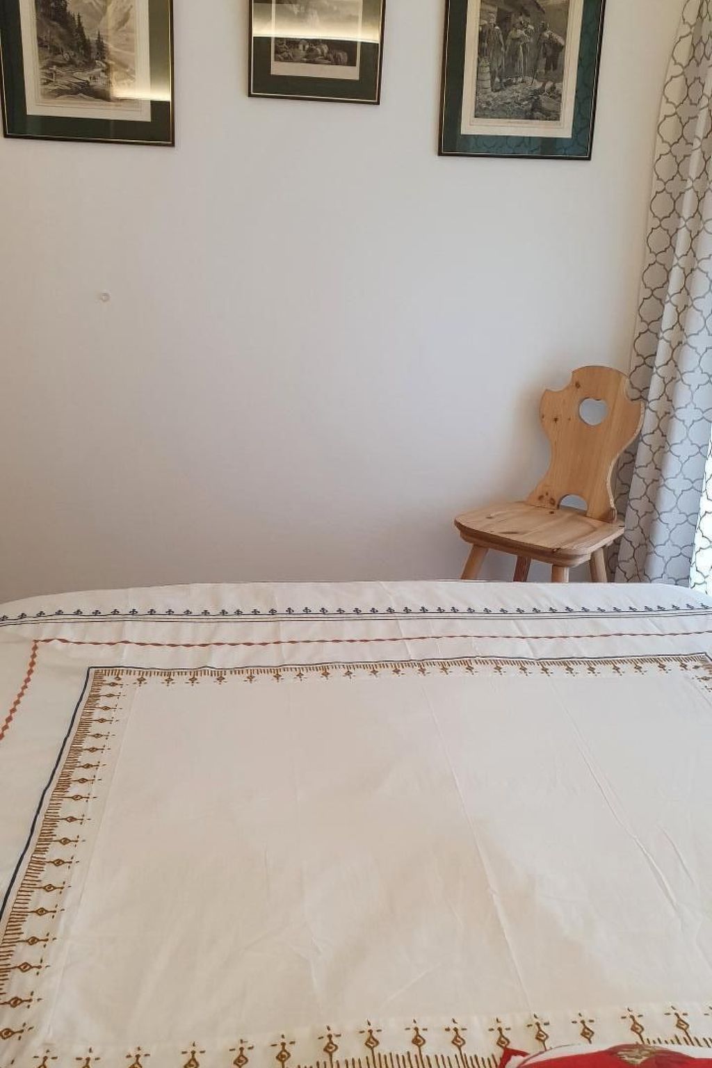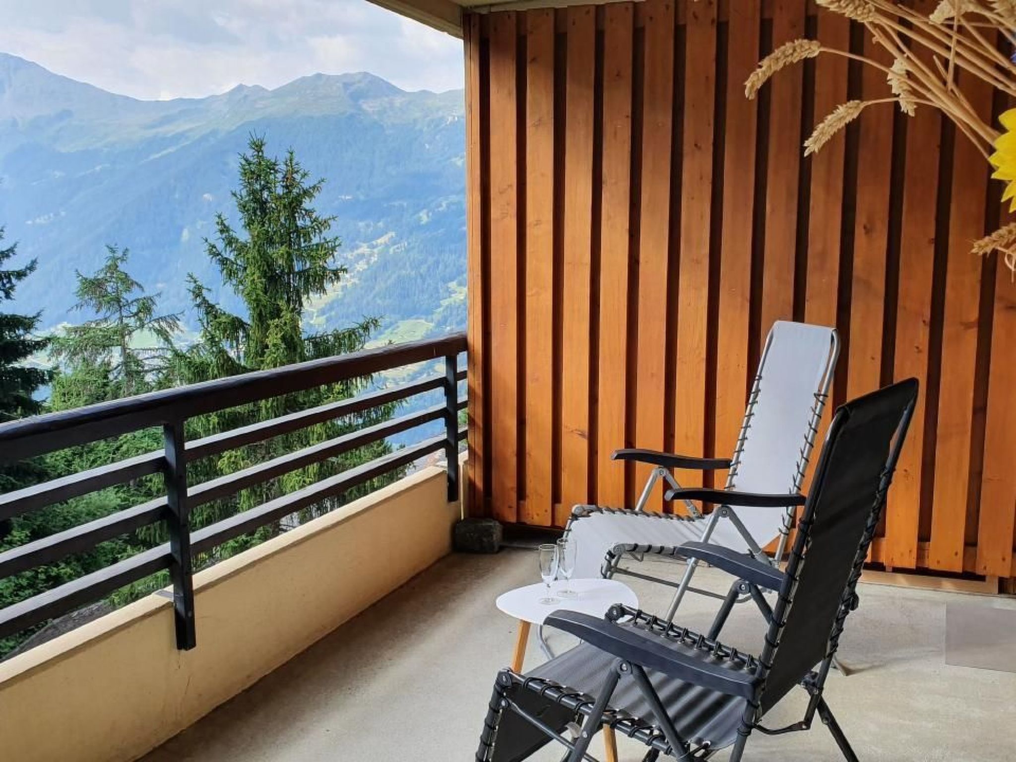- Schlafzimmer 1: Bergblick, Elektrisches Bett 140×200, Badezimmer (Waschbecken, Dusche, WC), kleiner Schrank.