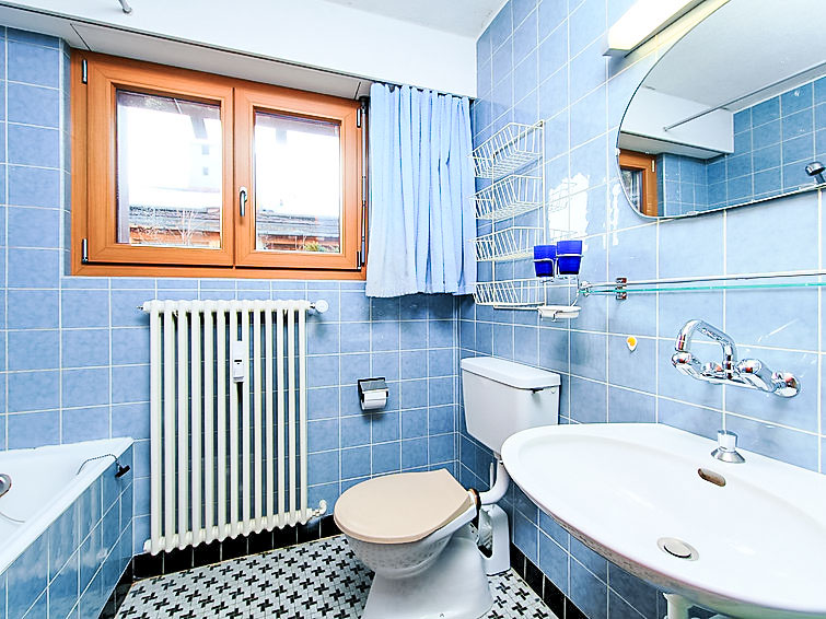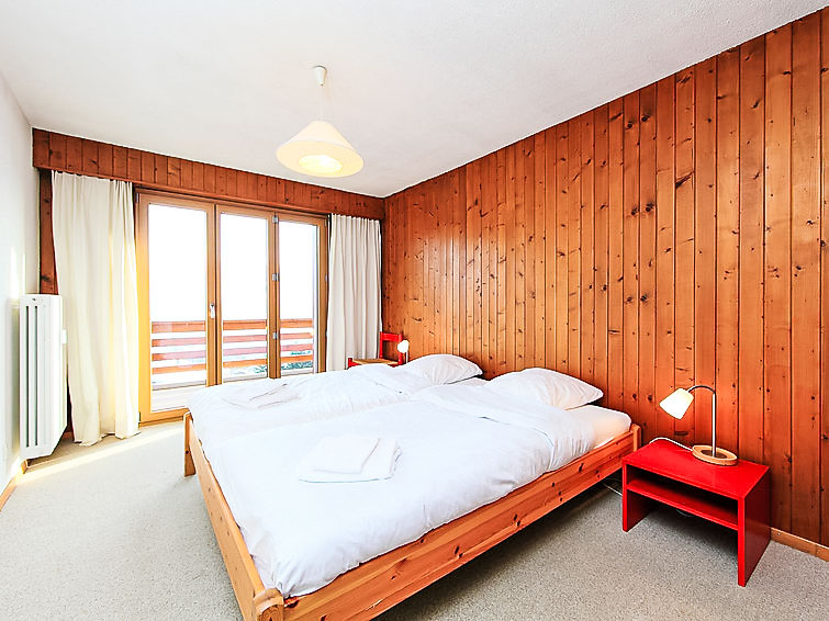 "Porthos 37", 4-Zimmer-Wohnung 75 m2 im 2. Stock, Südlage. Zweckmässig eingerichtet: Wohn-/Esszimmer mit Esstisch und Kabel-TV. Ausgang zum Balkon, Richtung Süden. 1 Zimmer, Richtung Norden mit 1 x 2 Etagenbetten (80 cm, Länge 190 cm). 1 grosses Zimmer, Richtung Süden mit 1 Doppelbett (2 x 90 cm, Länge 190 cm). 1 kleines Zimmer, Richtung Westen mit 1 Doppelbett (2 x 90 cm, Länge 190 cm). Ausgang zum Balkon, Richtung Süden. Küche (3 Kochplatten, Backofen, Geschirrspüler, Toaster, Wasserkocher, Mikrowelle, Racletteofen, Fondue Set (Chinoise, Käse)). Bad/WC, sep. WC. Grosser Balkon, Südlage. Balkonmöbel, Liegestühle (4). Schöne Panoramasicht auf die Berge und die Landschaft. Zur Verfügung: Haartrockner. Internet (Wireless LAN, gratis). Garage Nr. 9 in 800 m, Höhe 215 cm. Bitte beachten: Nichtraucher-Unterkunft. Maximal 1 Haustier/Hund erlaubt. 143.403.003.10