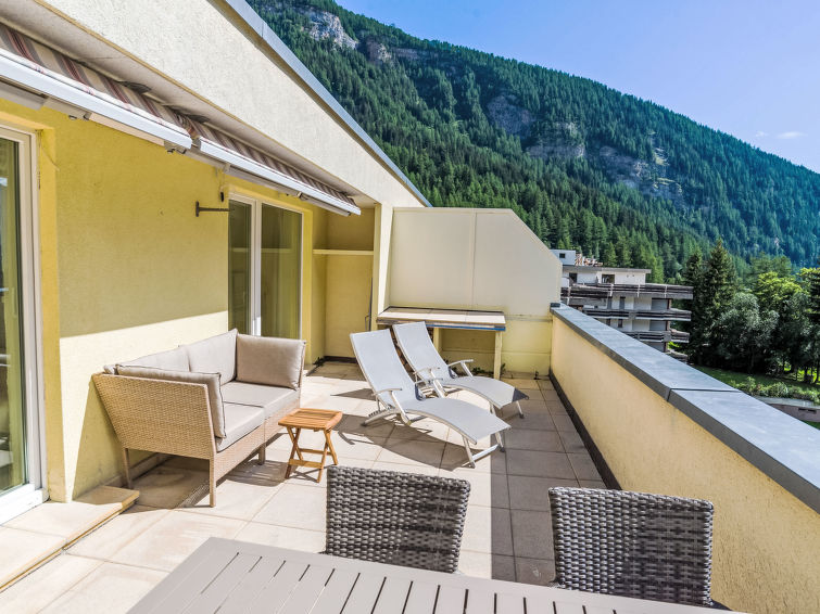 "Cristal 67", 2-Zimmer-Attikawohnung 52 m2 im 5. Stock. Renoviert, schön und gemütlich eingerichtet: Wohn-/Esszimmer mit 1 Diwanbett, offenem Kamin, Esstisch und Kabel-TV. Ausgang zur Terrasse. 1 Doppelzimmer mit 1 Doppelbett (1 x 90 cm, Länge 200 cm). Ausgang zur Terrasse. Offene Küche (Backofen, Geschirrspüler, 4 Glaskeramikplatten, elektrische Kaffeemaschine). Dusche/WC. Parkettboden. Grosse Terrasse. Terrassenmöbel. Panoramasicht auf die Berge und die Ortschaft. Zur Verfügung: Haartrockner. Internet (Wireless LAN, gratis). Bitte beachten: Nichtraucher-Unterkunft.