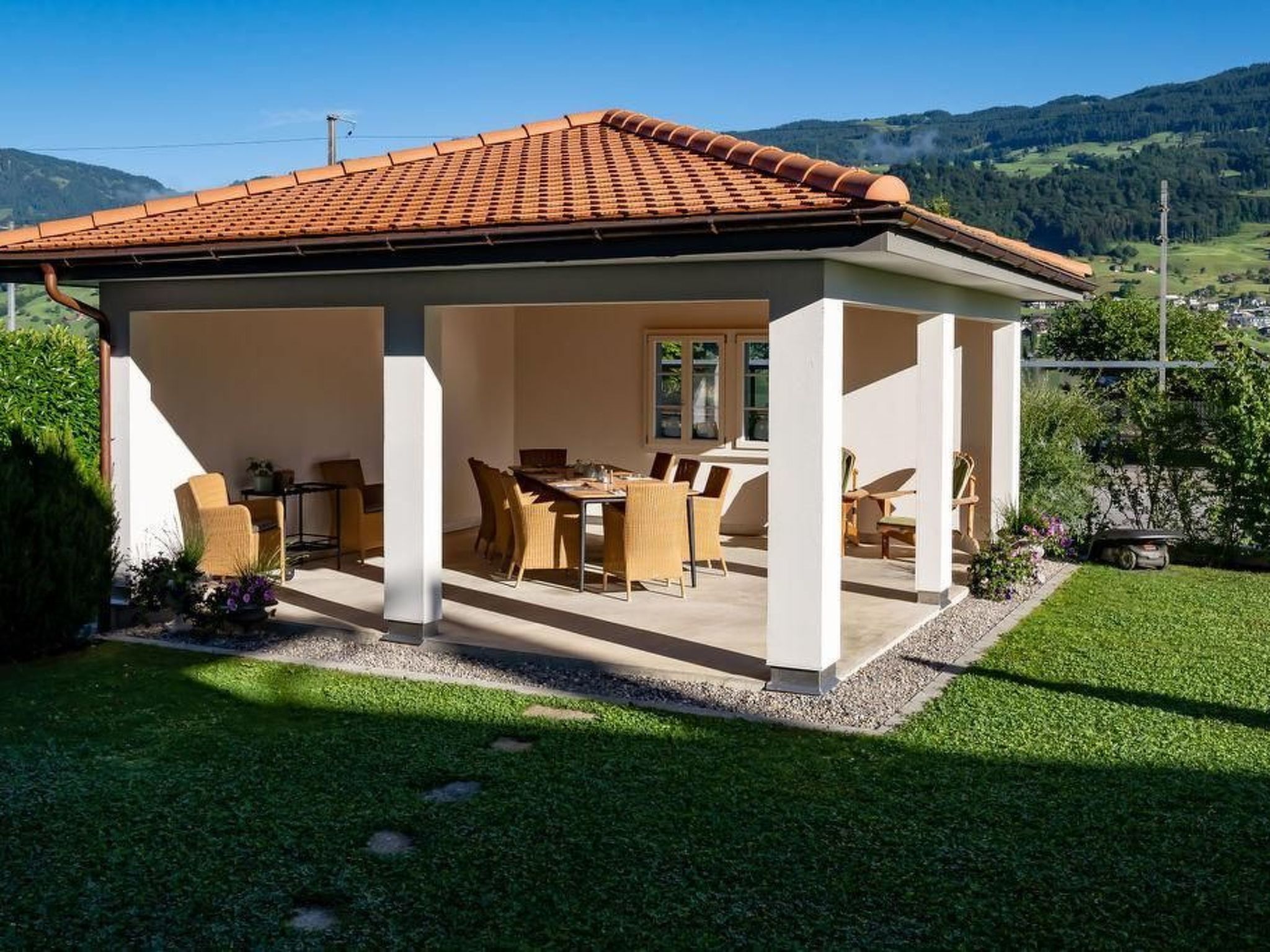 Auch der Außenbereich des Anwesens überzeugt mit beeindruckenden Features. Eine geräumige Gartenlaube bietet die Möglichkeit, in den wärmeren Monaten das Frühstück im Freien zu genießen oder in der kühlen Brise ein Buch zu lesen. Für Gäste, die mit dem Auto anreisen, gibt es drei kostenlose Parkplätze direkt am Haus sowie zwei zusätzliche Parkmöglichkeiten in der benachbarten Einstellhalle gegen Gebühr.