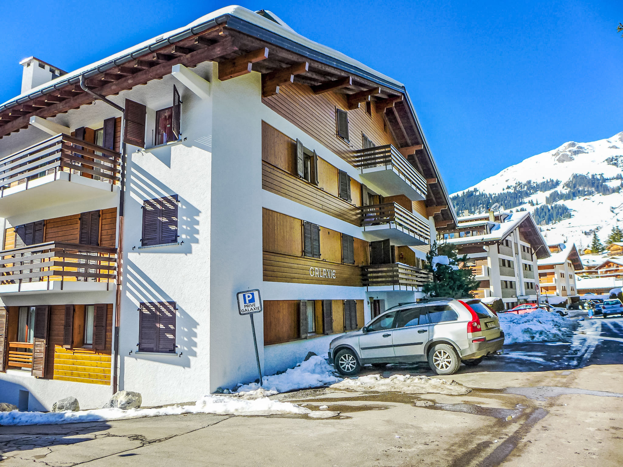 Appartementhaus "Galaxie", auf 4 Stockwerken. 20 Wohnungen in der Residenz. Im Ort, 300 m vom Zentrum von la station, ruhige Lage. Im Hause: Fahrstuhl, Skiraum, Zentralheizung. Zufahrt bis zum Haus. Öffentliche Parkplätze 800 m. Einkaufsgeschäft, Supermarkt, Restaurant, Bar 300 m, Bushaltestelle "Praz Michaud" 200 m, Hallenbad 800 m. Golfplatz (18 Loch) 1.2 km, Tennis 1 km, Reitstall 1 km, Sportzentrum 1 km, Skilift 1.2 km, Sessellift 2.5 km, Gondelbahn 800 m, Skisportanlagen 1 km, Skischule 1 km, Ski-Kindergarten 500 m, Schlittelbahn 800 m.