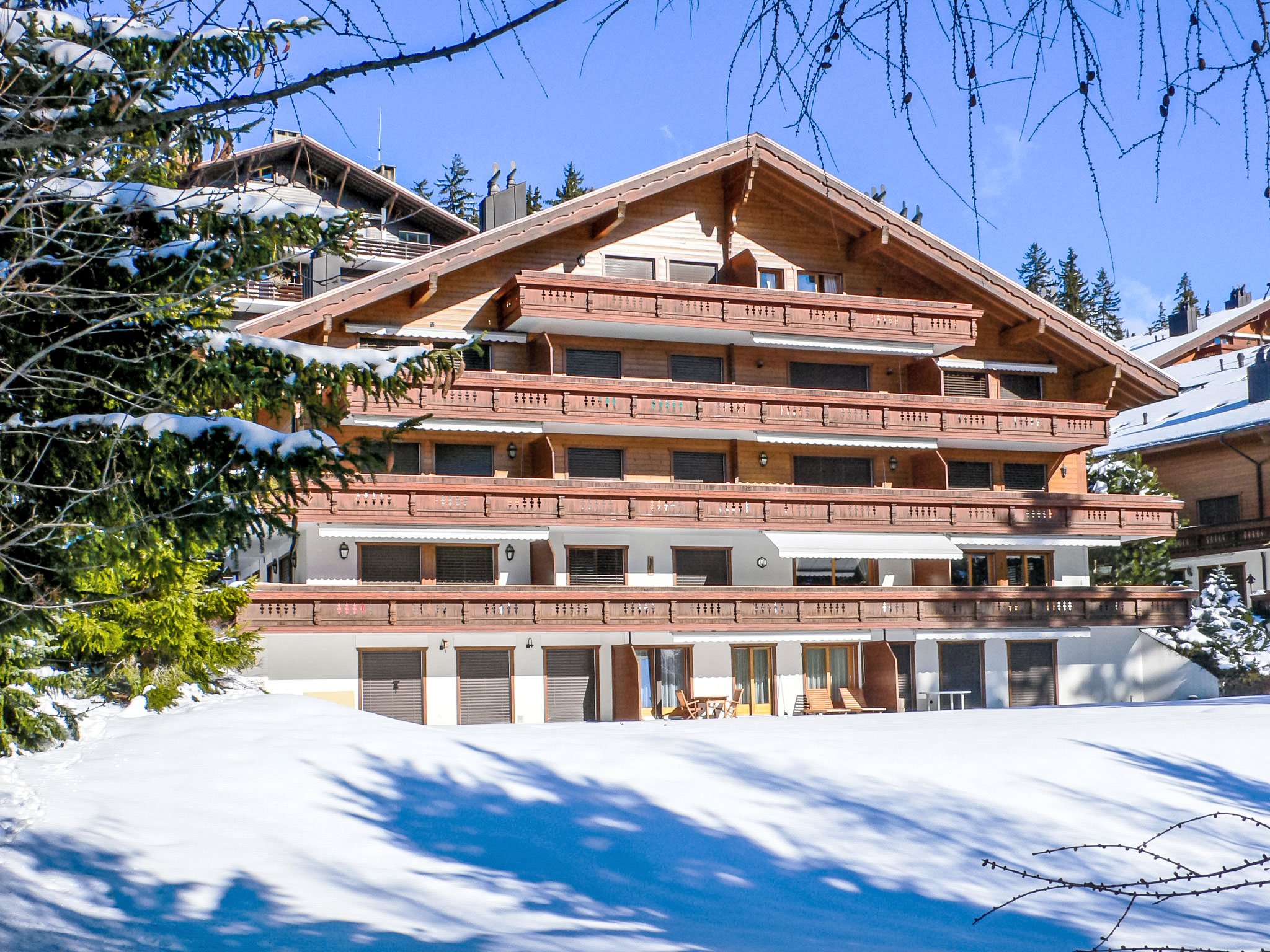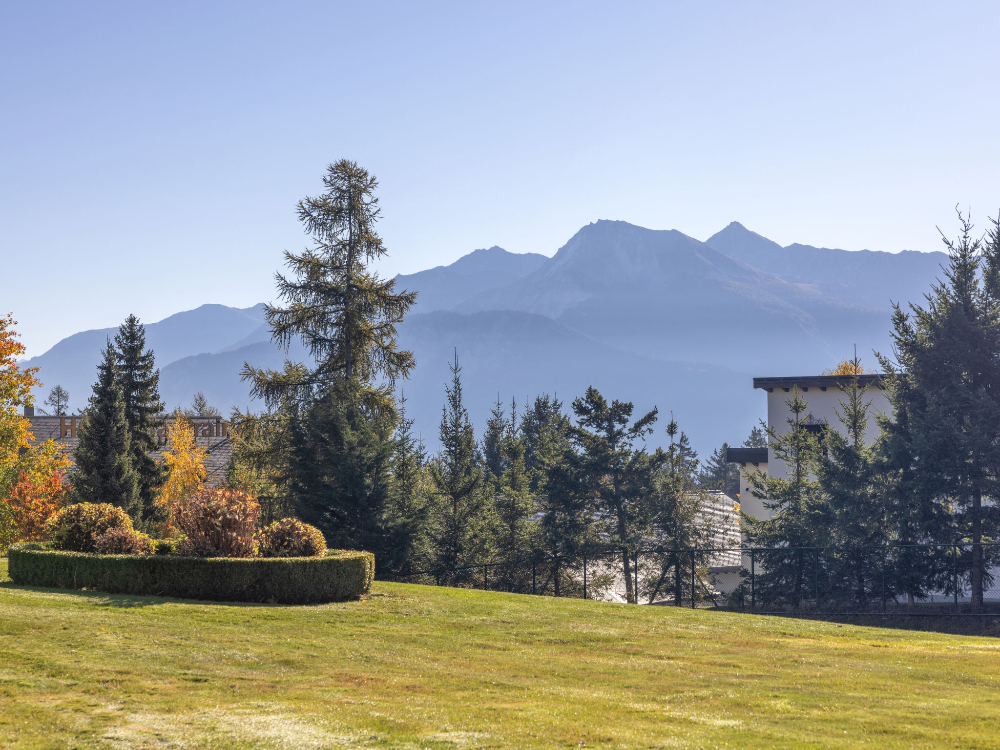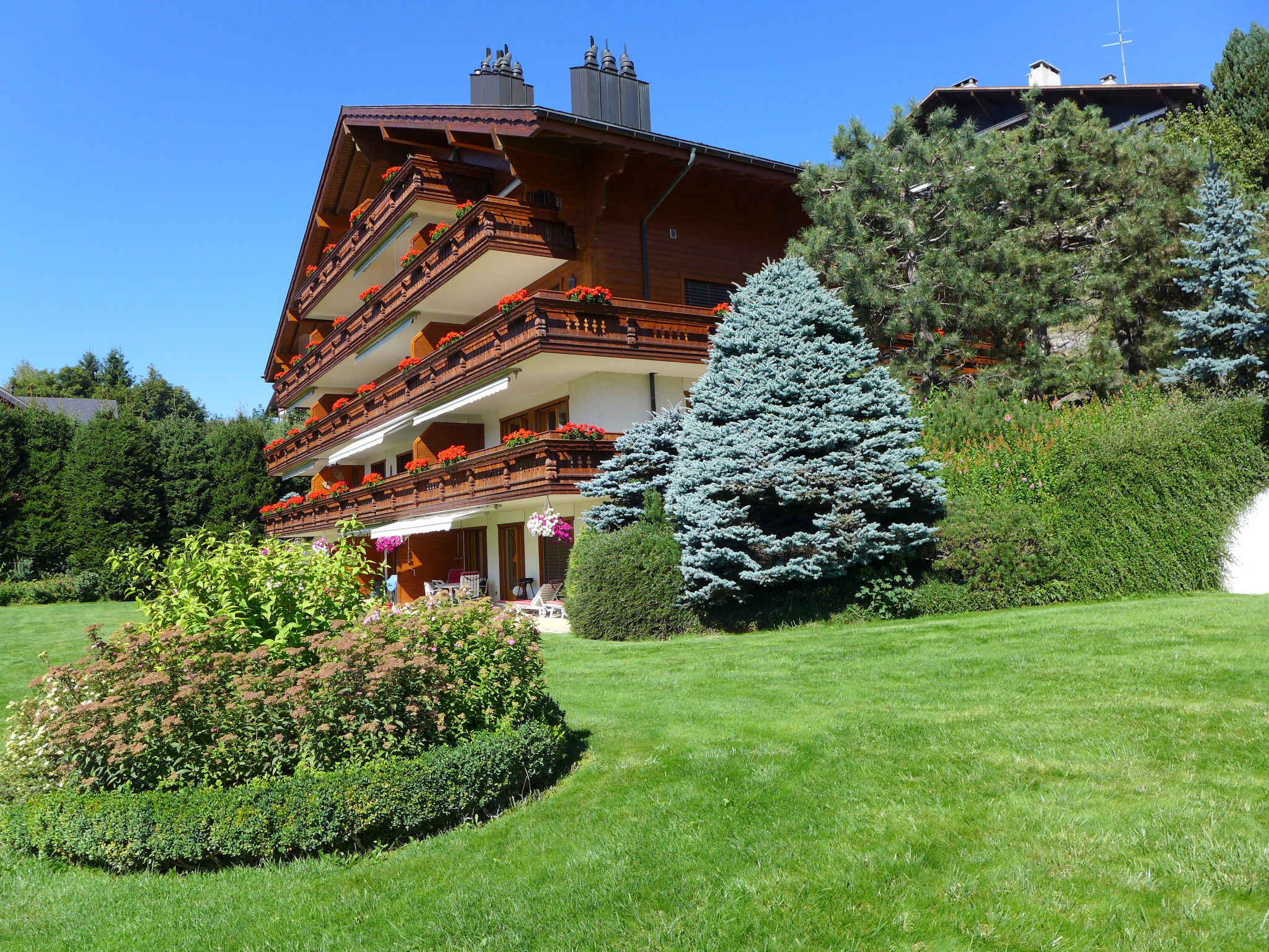 Schöne, gemütliche, komfortable Residenz "Les Pierres C". Im Ort, 600 m vom Zentrum von Montana, ruhige, sonnige Lage, 700 m vom See, 1.5 km vom Skigebiet, Richtung Süden. Zur Alleinbenutzung: kleiner Garten mit Rasen. In der Anlage: Fahrstuhl, Skiraum, Zentralheizung, Waschmaschine, Wäschetrockner (zur Mitbenutzung, extra). Gemeinschaftsgarage. Einkaufsgeschäft, Supermarkt, Restaurant 600 m, Bäckerei 700 m, Bushaltestelle "Primeroses" 140 m, Bahnstation "Funiculaire Montana Gare" 1.1 km, Grasstrand "Lac Moubra" 1 km, Badesee "Moubra" 700 m. Golfplatz (18 Loch) 2 km, Tennis, Tennishalle 700 m, Skisportanlagen 1.4 km, Langlaufloipe 600 m, Eisfeld 800 m. Bekannte Seen in der Umgebung sind gut erreichbar: Lac Grenon 900 m, Etang Long 1.5 km. Bitte beachten: Gratis Skibus.