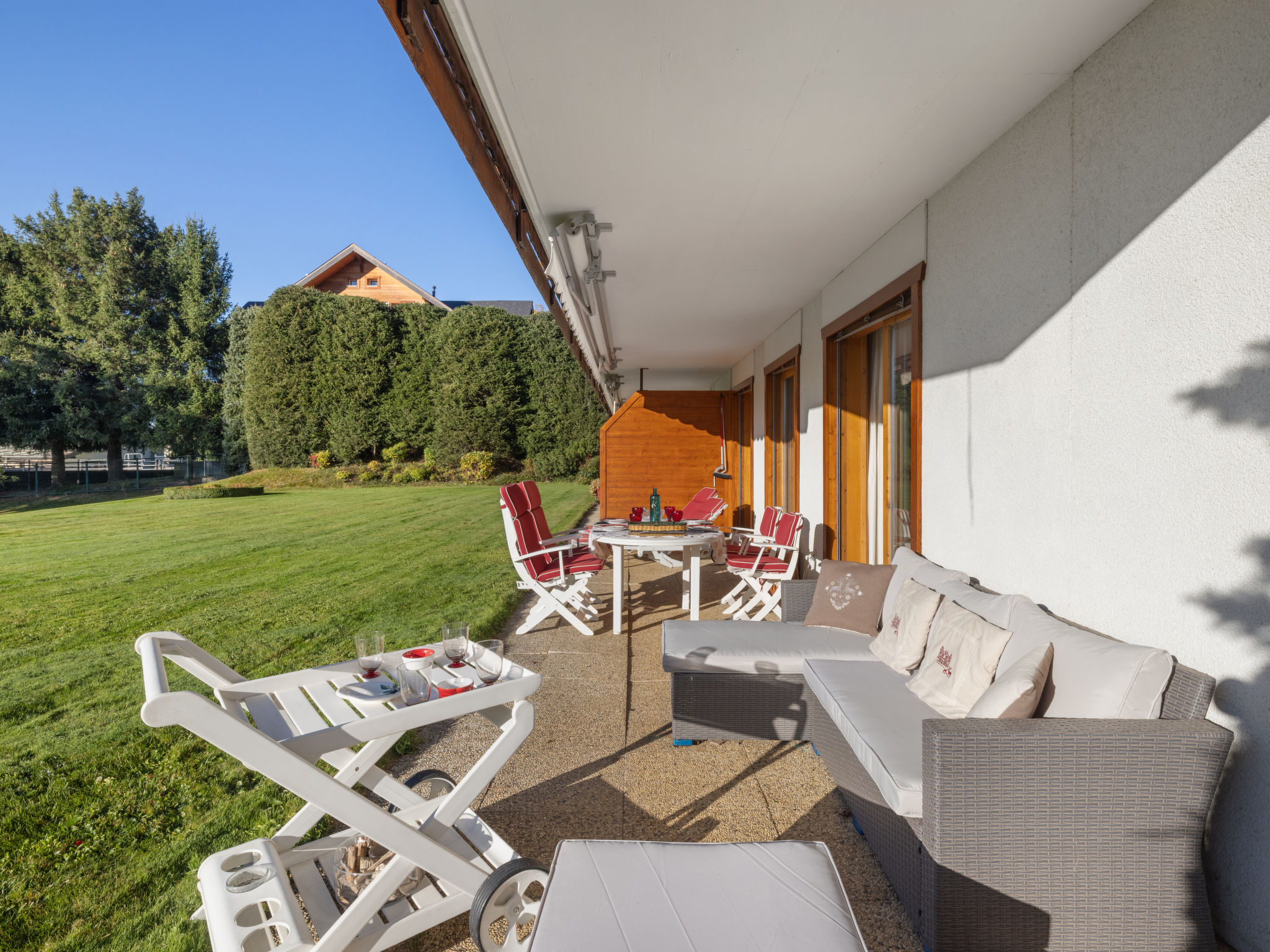 "Les Pierres C 3", 2-Zimmer-Wohnung 70 m2, im Erdgeschoss. Teilweise renoviert im Jahre 2020, komfortabel und gemütlich eingerichtet: Wohn-/Esszimmer mit Schiebetür mit 1 Doppeldiwanbett (140 cm, Länge 200 cm), Kabel-TV und DVD. Ausgang zur Terrasse. 1 Zimmer mit 1 franz. Bett (160 cm, Länge 200 cm), Bad/WC, Doppelwaschbecken und Kabel-TV. Ausgang zur Terrasse. Offene Küche (Backofen, Geschirrspüler, 4 Glaskeramikplatten, Toaster, Wasserkocher, Mikrowelle, elektrische Kaffeemaschine, Kapseln für die Kaffeemaschine (Nespresso) extra, Racletteofen, Fondue Set (Käse)). Dusche/WC. Terrasse 25 m2, Südlage. Terrassenmöbel, Liegestühle (2). Schöne Sicht auf die Berge, die Landschaft und den Wald. Zur Verfügung: Haartrockner. Internet (WLAN, gratis). Garage, Höhe 205 cm, Breite 200 cm. Bitte beachten: Nichtraucher-Unterkunft.