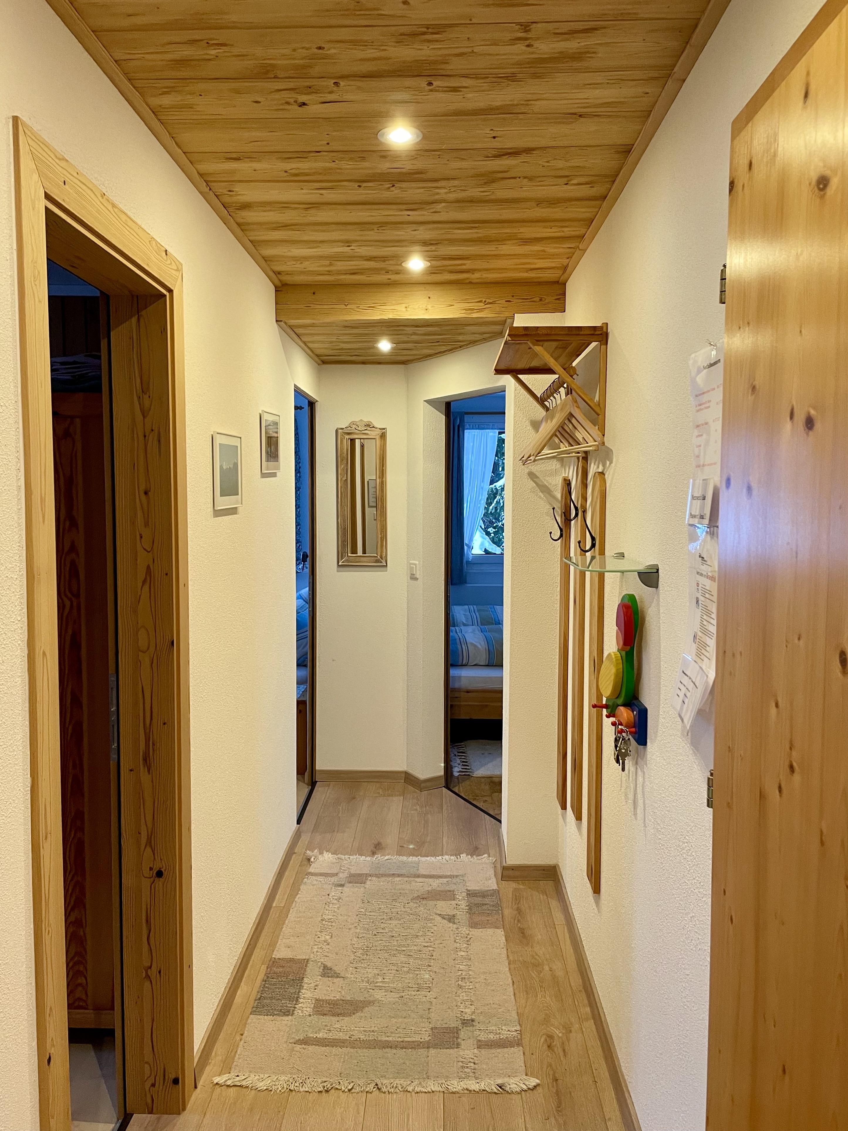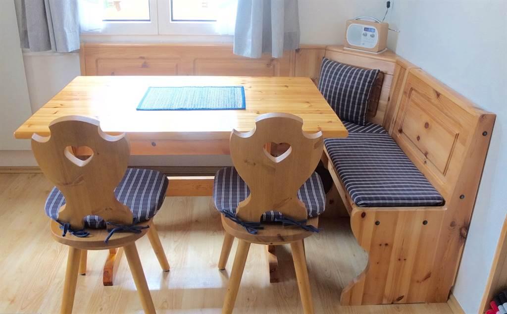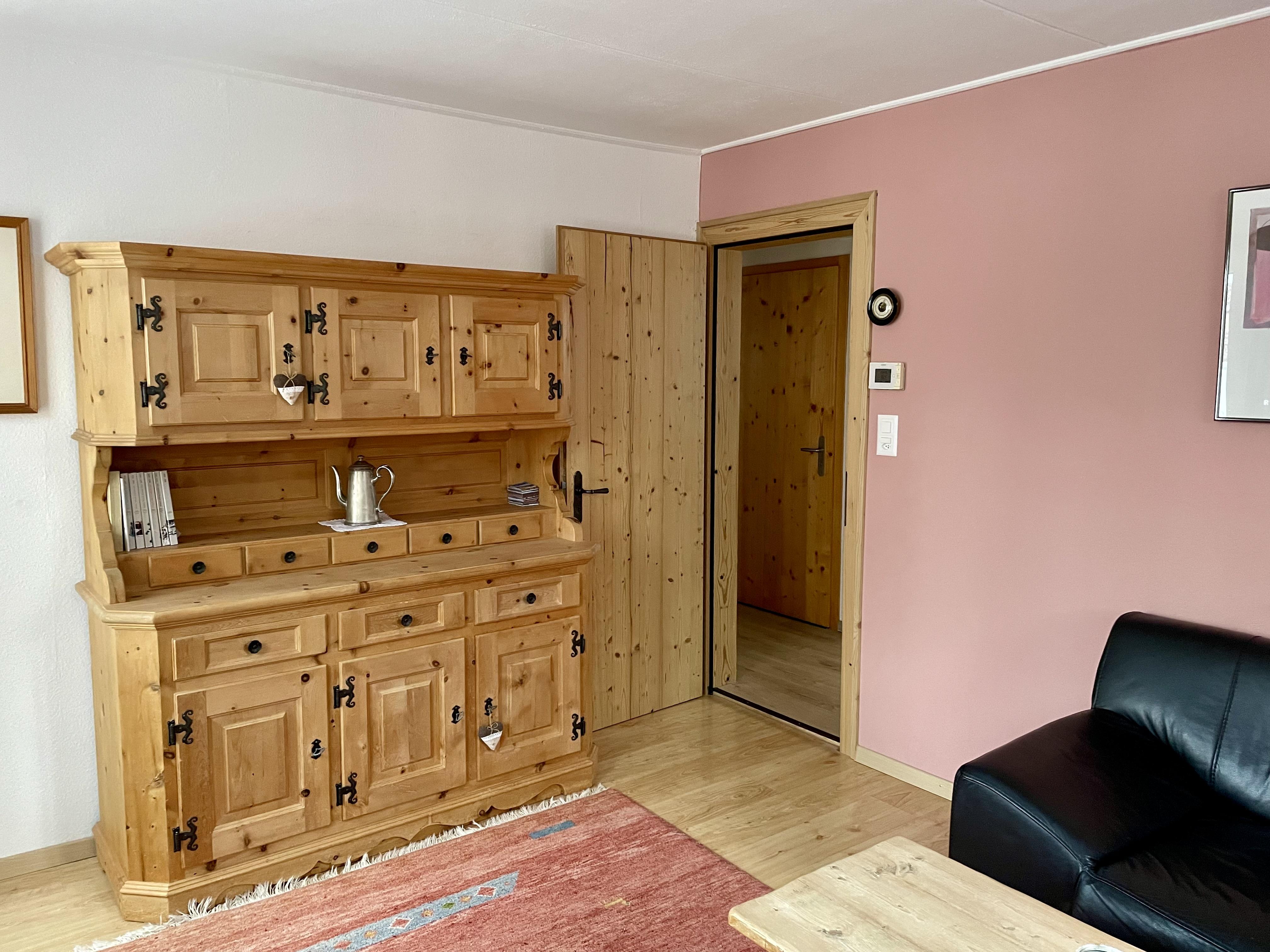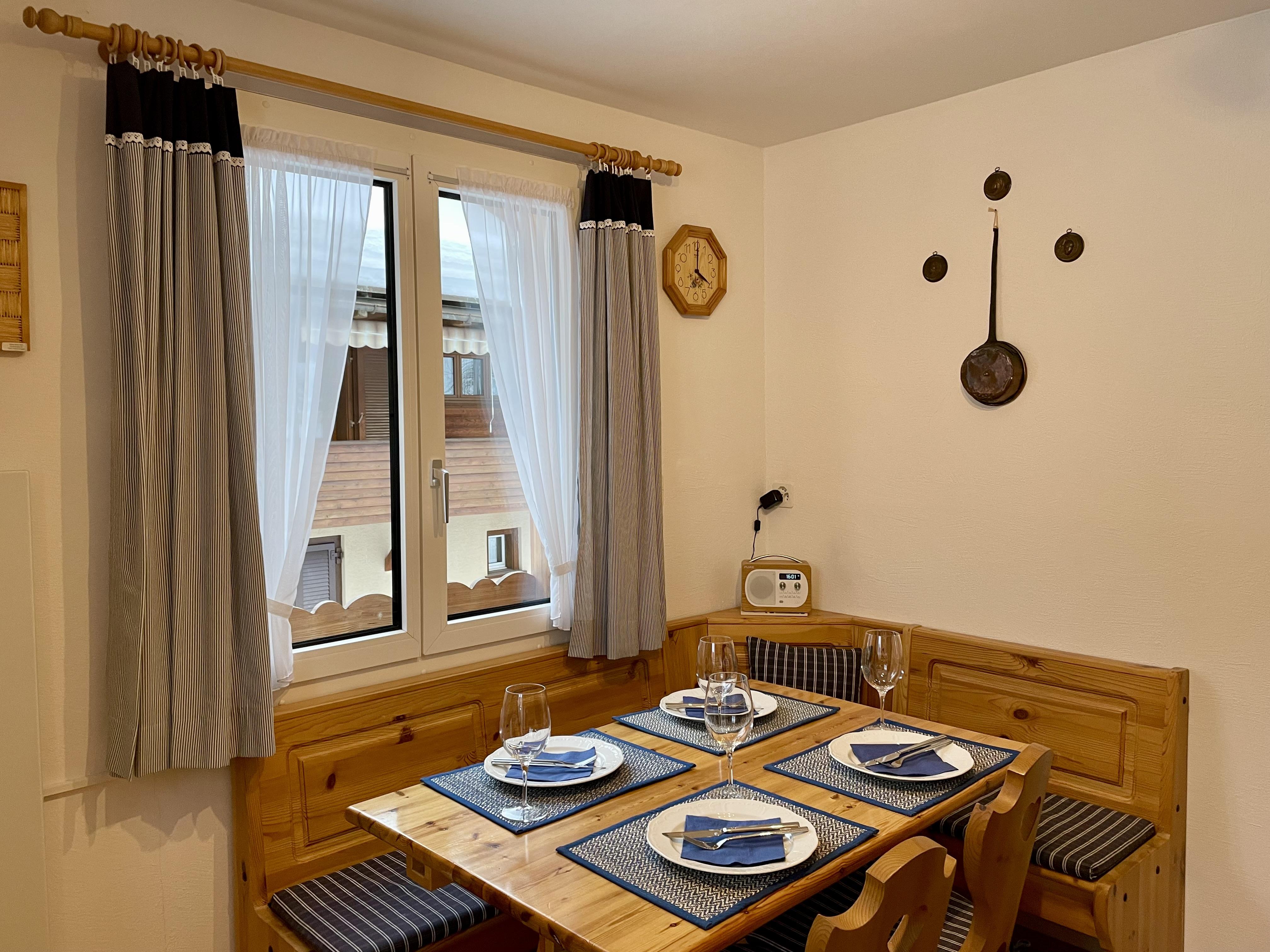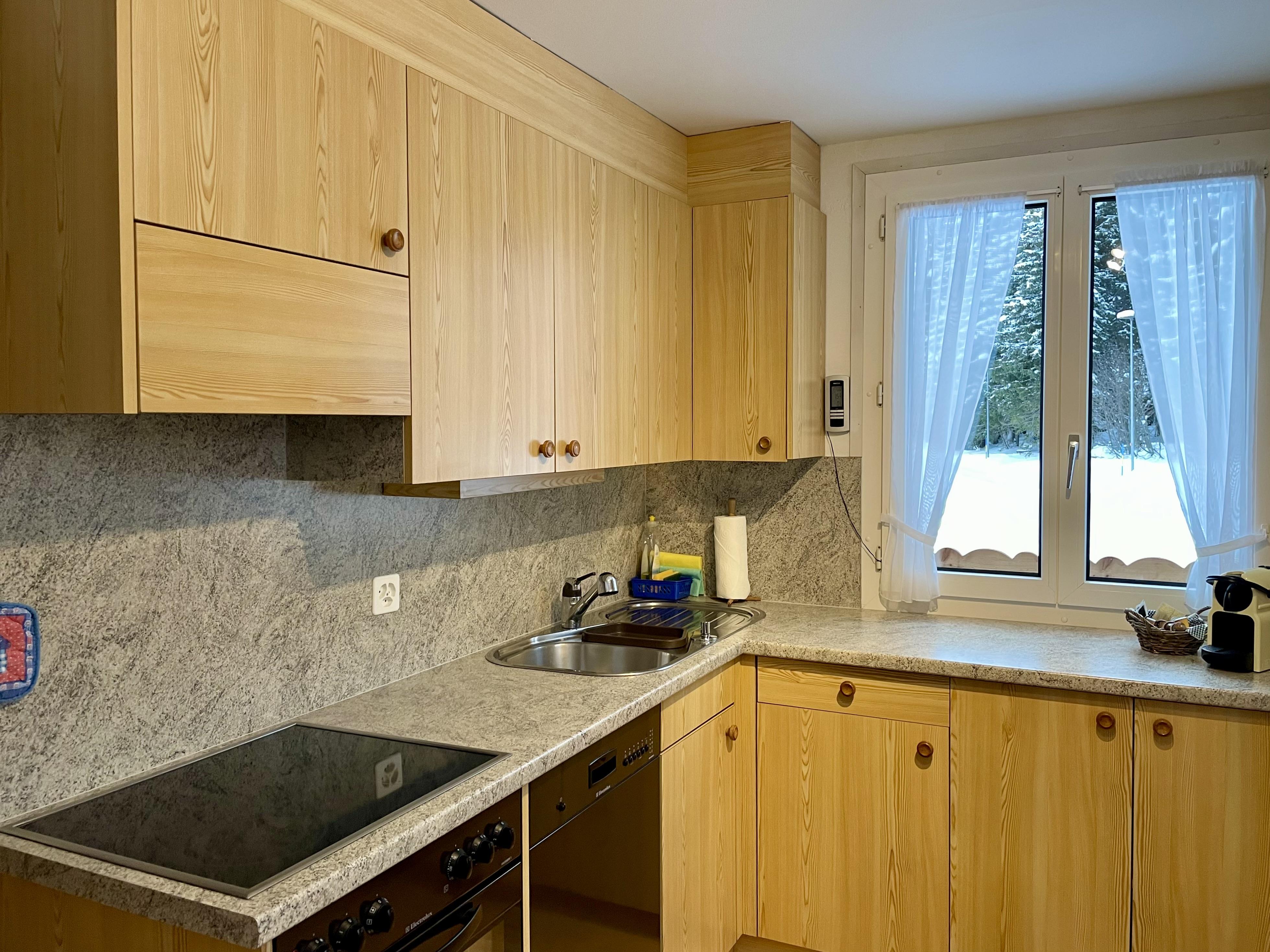 Zur Einrichtung: Die gemütliche Wohnküche ist gut eingerichtet mit Glaskeramik ,Backofen,Spülmaschine Kaffeeautomat und ein grosser Eisschrank mit Tiefkühlfach.Natürlich fehlen Fondue und Raclett Geschirr auch nicht . Eine gemütliche Essecke ist vorhanden.