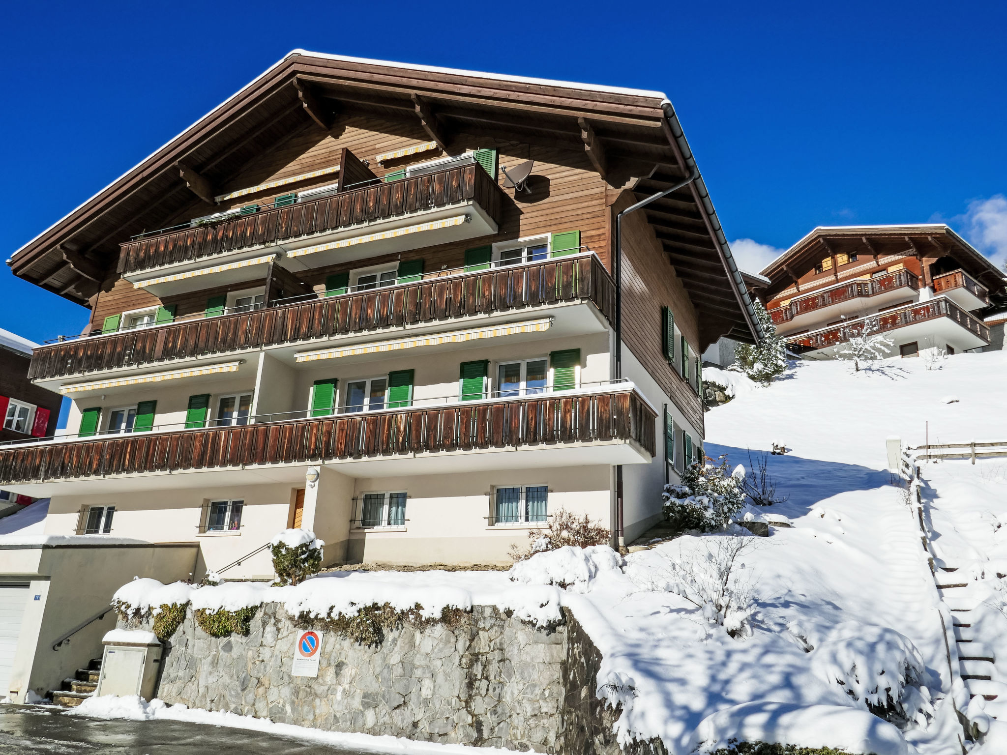 Mehrfamilienhaus "Chalet zur Höhe". Im Ortsteil Chapf, 1.2 km vom Zentrum, ruhige, sonnige Lage, in einer Sackgasse, Richtung Süden. Im Hause: Skiraum, Zentralheizung. Im Winter bitte Schneeketten mitbringen. Treppenweg bis zum Haus. Parkplatz Nr. BE3850 beim Haus. Einkaufszentrum 1.2 km, Restaurant, Bar 300 m, Fahrradverleih 1.2 km, Zentrum zu Fuss in 20 Minuten erreichbar, Bushaltestelle "Lauberhorn" 300 m, Bahnstation "Grindelwald Dorf" 1.8 km, Freibad 3 km, Hallenbad 1.7 km. Golfplatz (9 Loch) 3.5 km, Tennis 2.5 km, Minigolf 1.4 km, Sportzentrum 1.7 km, Bergeisenbahn 1.8 km, Gondelbahn 1.3 km, Skiverleih 1.3 km, Skibushaltestelle 50 m, Langlaufloipe 2.5 km, Kinderspielplatz 1.7 km. Bekannte Seen in der Umgebung sind gut erreichbar: Thuner-/Brienzersee 20 km. Bitte beachten: kein Fahrstuhl vorhanden. Gratis Skibus. Die Schlüsselübergabe findet bei der Agentur Interhome in Grindelwald statt.