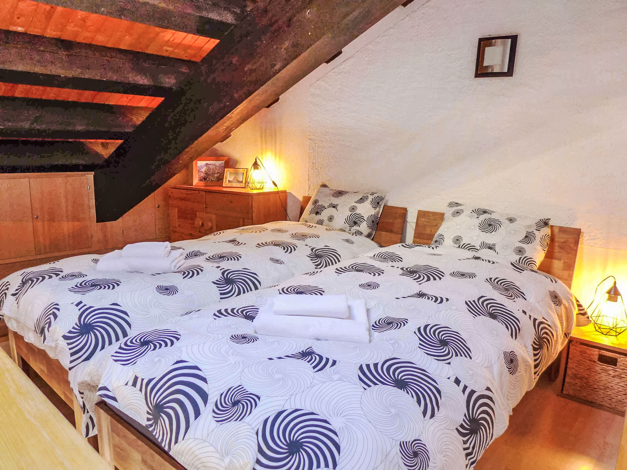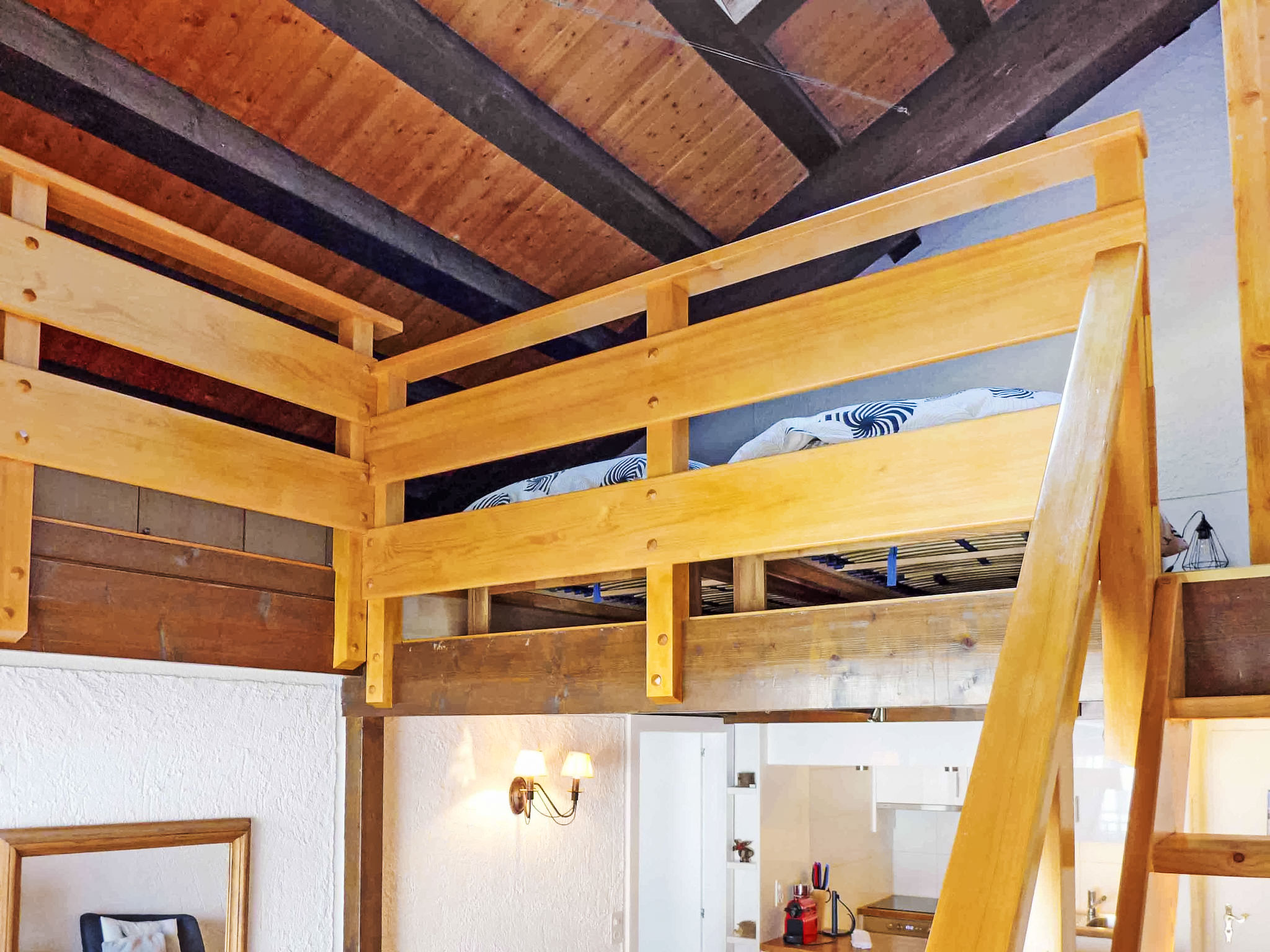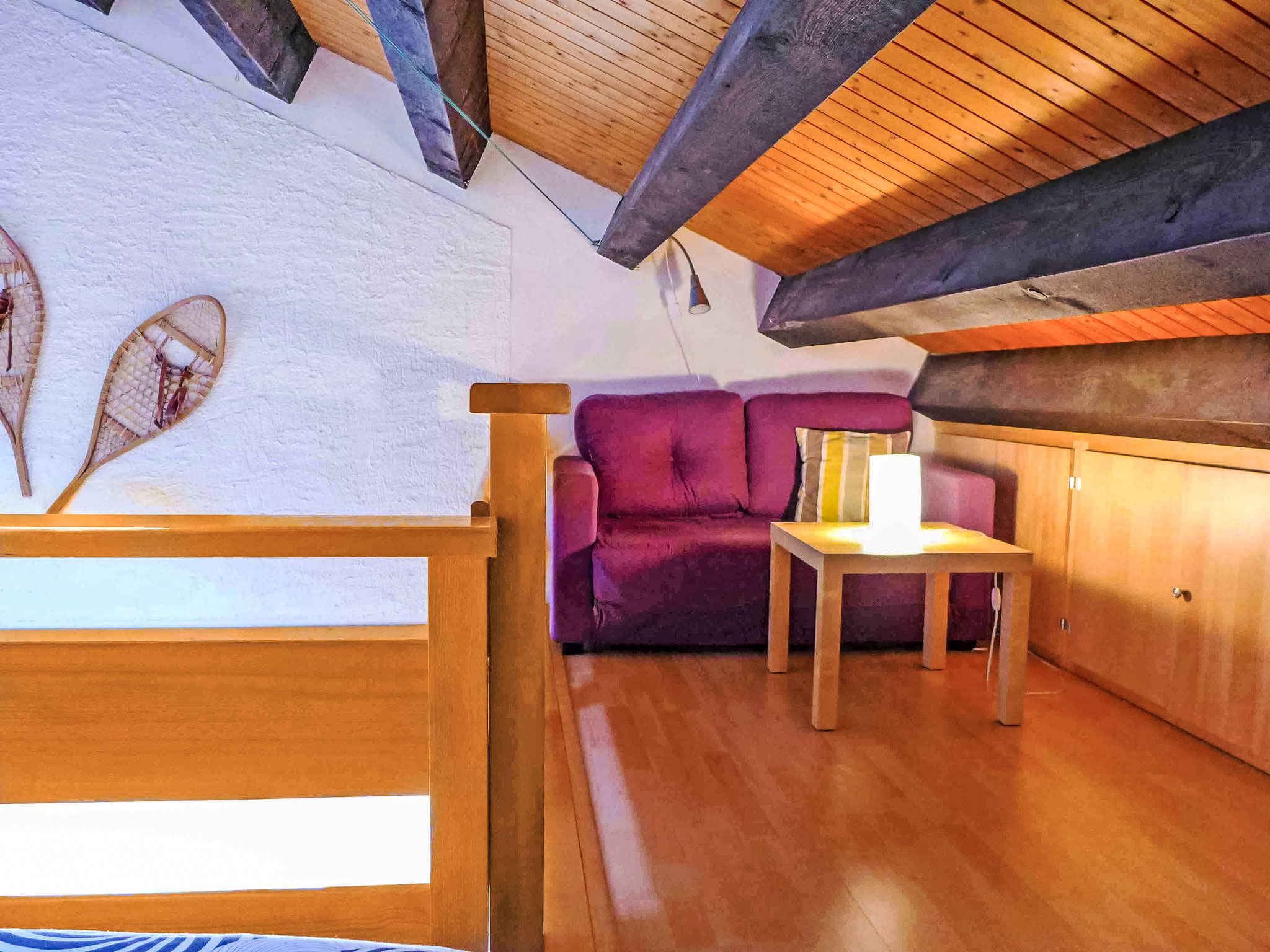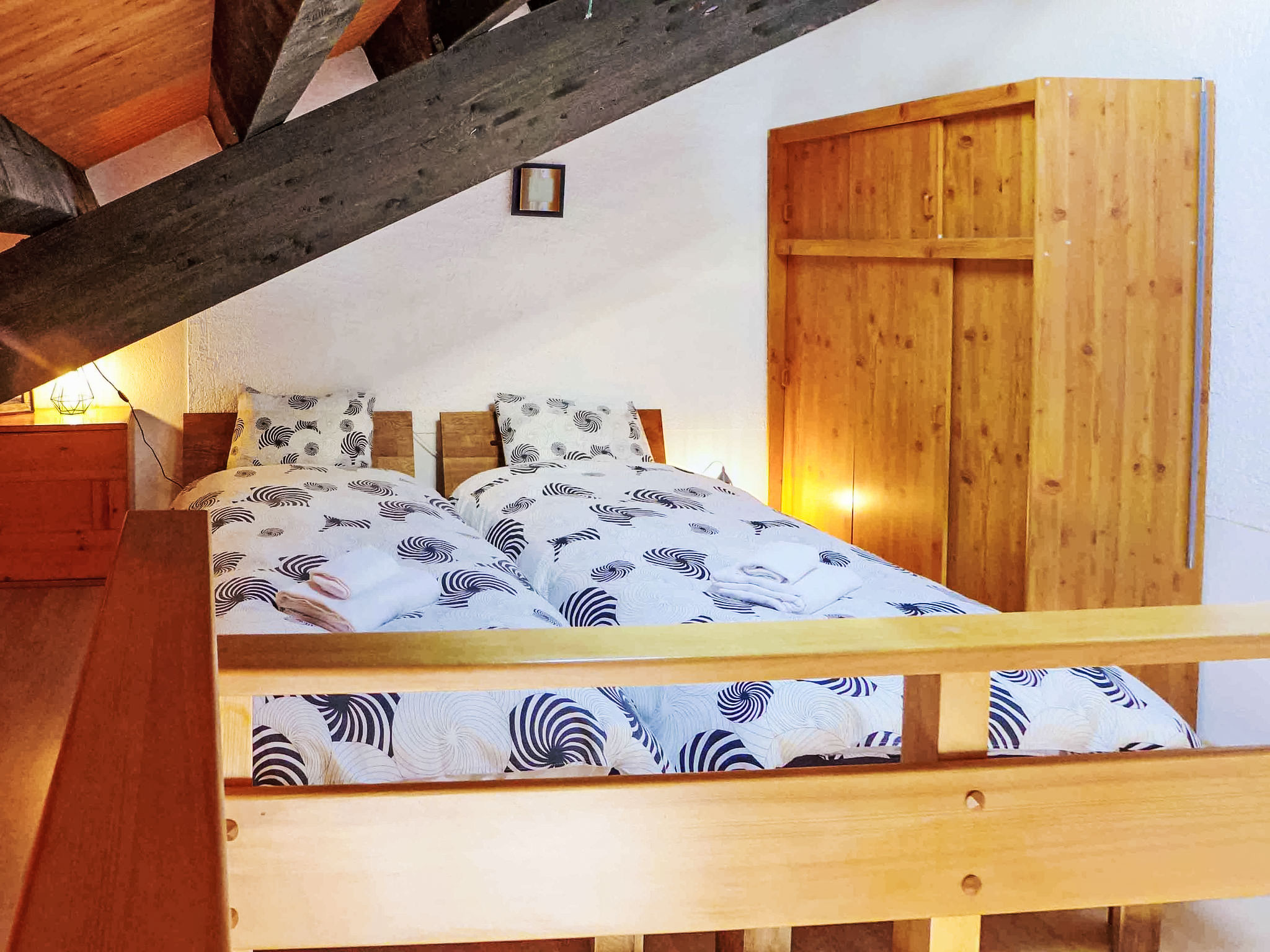 "Le Tsaumiau A 17", 2-Zimmer-Wohnung 65 m2 auf 2 Stockwerken im 2. Stock. Wohnzimmer mit Kabel-TV und Flachbildschirm. Abgeschrägte Galerie mit 2 Betten (90 cm, Länge 200 cm). 1 Zimmer mit 1 franz. Bett (160 cm, Länge 200 cm). Ausgang zum Balkon, Richtung Osten. Wohnküche (Geschirrspüler, 4 Glaskeramikplatten, Toaster, Wasserkocher, elektrische Kaffeemaschine, Kapseln für die Kaffeemaschine (NESPRESSO) extra, Racletteofen, Kombinationsmikrowelle, Fondue Set (Chinoise, Käse)) mit Esstisch. Bad, sep. WC. Grosser Balkon, Ostlage. Balkonmöbel. Seitliche Sicht auf die Berge und die Landschaft. Zur Verfügung: Kinderhochstuhl, Babybett bis 2 Jahre, Haartrockner. Internet (WLAN, gratis). Garage Nr. 17, Höhe 230 cm, Breite 290 cm. Bitte beachten: Nichtraucher-Unterkunft. Faltbares Babybett, ohne Bettwäsche und ohne Decke. Anstelle eines abgeschlossenen Schlafzimmers befinden sich manche Schlafplätze in einem offenen Bereich (Galerie, Nische etc.).