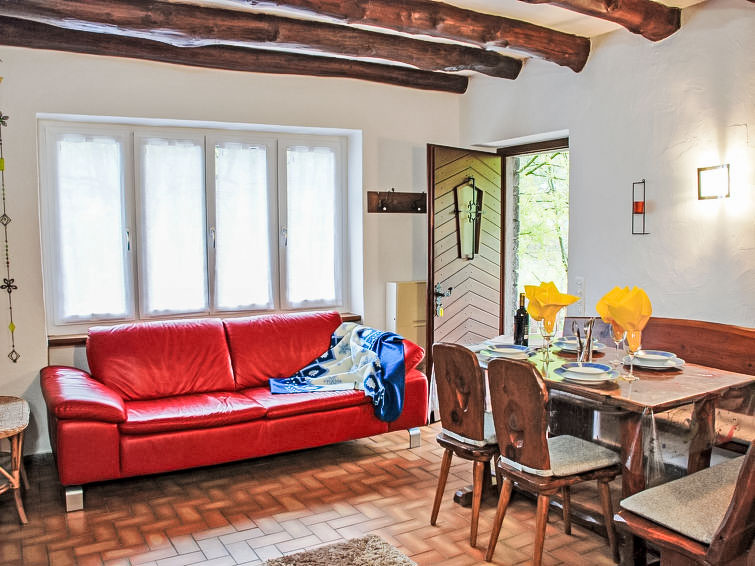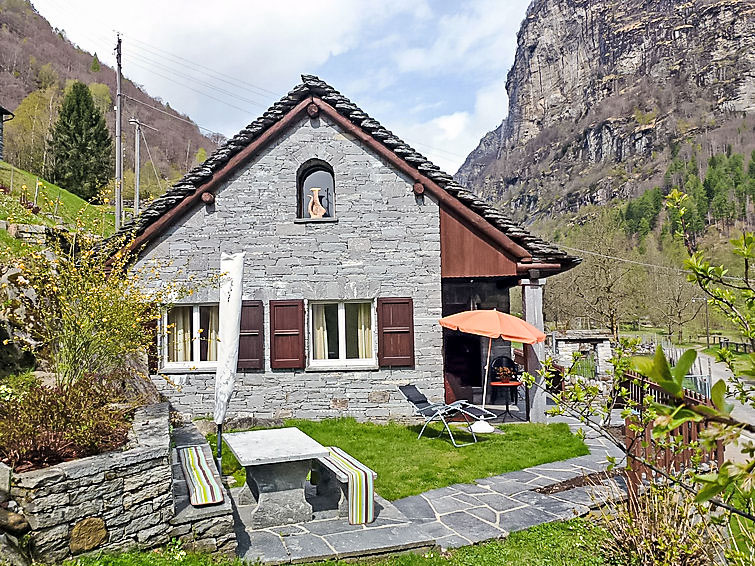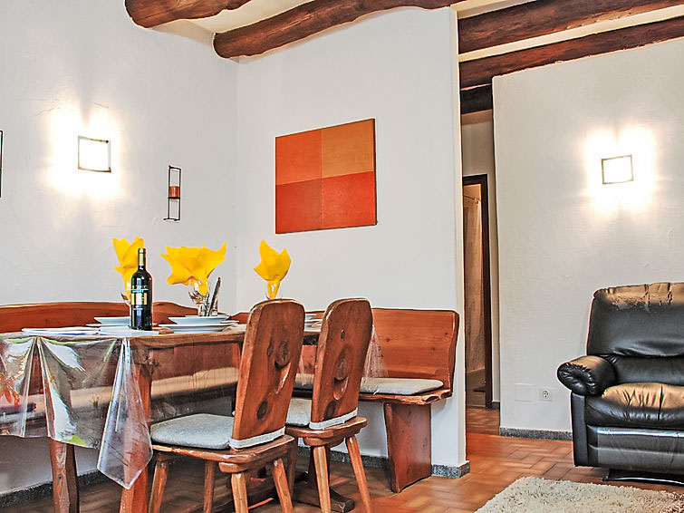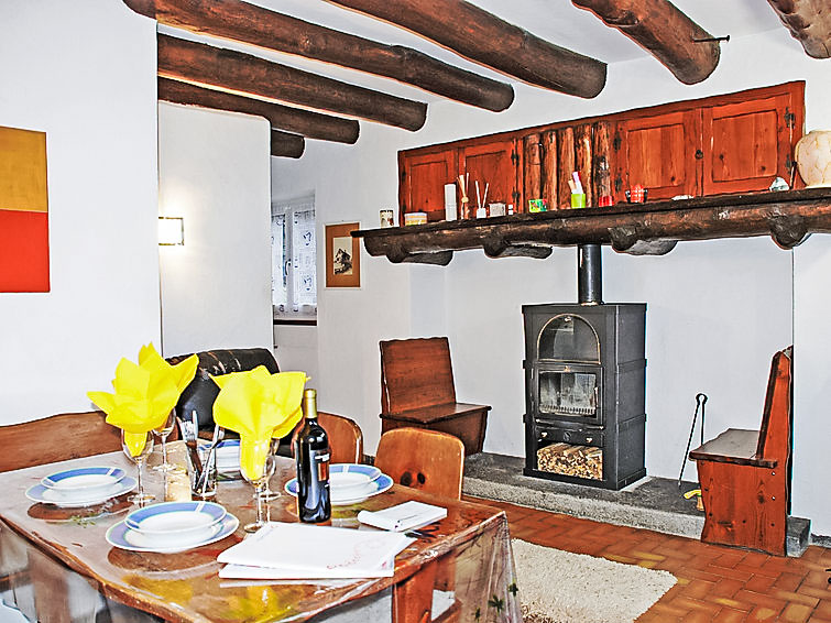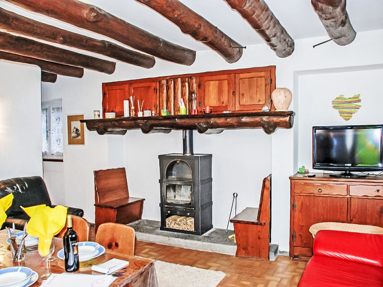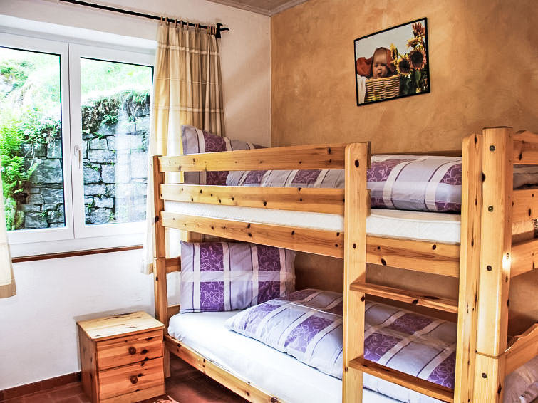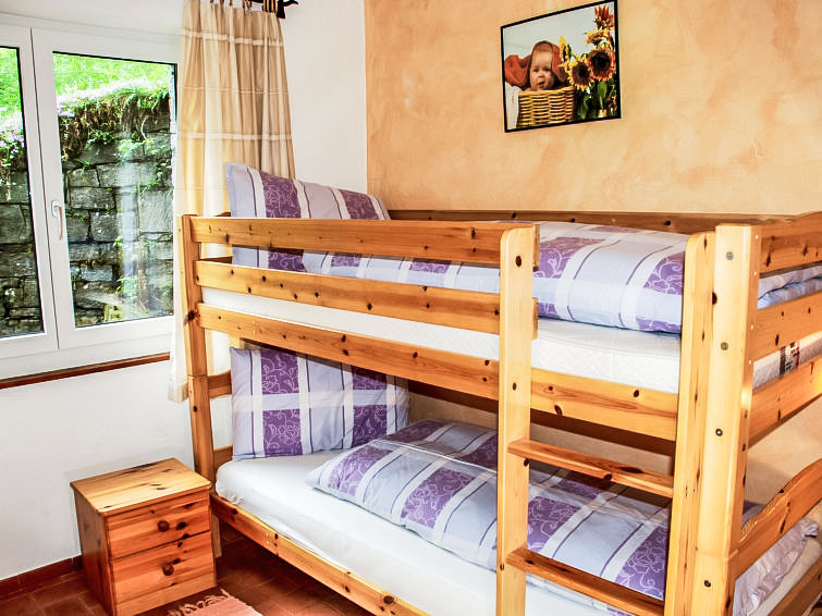 "La Rustica", 3-Zimmer-Haus. Zweckmässig und komfortabel eingerichtet: Wohn-/Esszimmer mit Schwedenofen, Kabel-TV, Flachbildschirm und Radio. Ausgang zum Gartensitzplatz. 1 Doppelzimmer mit 1 Doppelbett (2 x 90 cm, Länge 200 cm), E-Heizofen. 1 Zimmer mit 1 x 2 Etagenbetten (90 cm, Länge 200 cm), 1 Wandschrankbett (90 cm, Länge 200 cm), E-Heizofen. Offene Küche (4 Kochplatten, Backofen, elektrische Kaffeemaschine). Dusche/WC. Gartensitzplatz. Balkonmöbel, Liegestühle (2). Sicht auf die Berge. Zur Verfügung: Babybett bis 2 Jahre (extra). Maximal 2 Haustiere/Hunde erlaubt. Boiler 100 l. NL-00004314