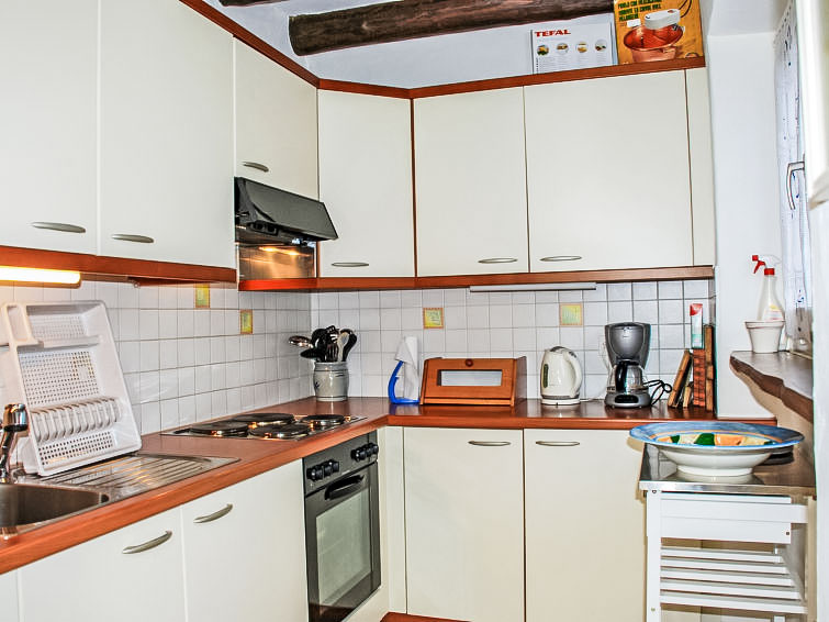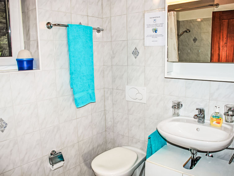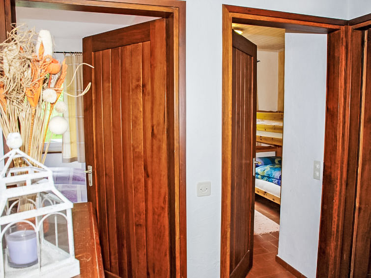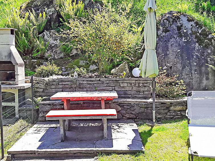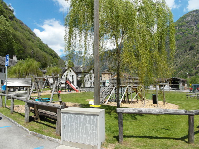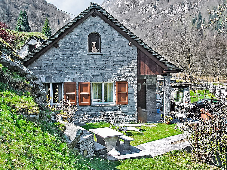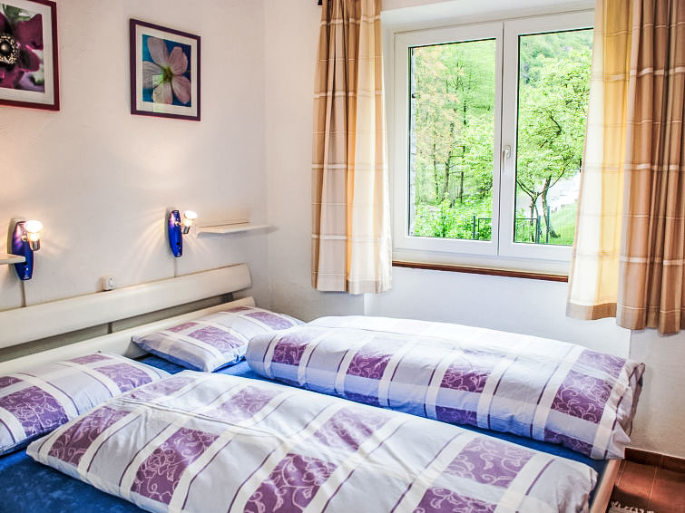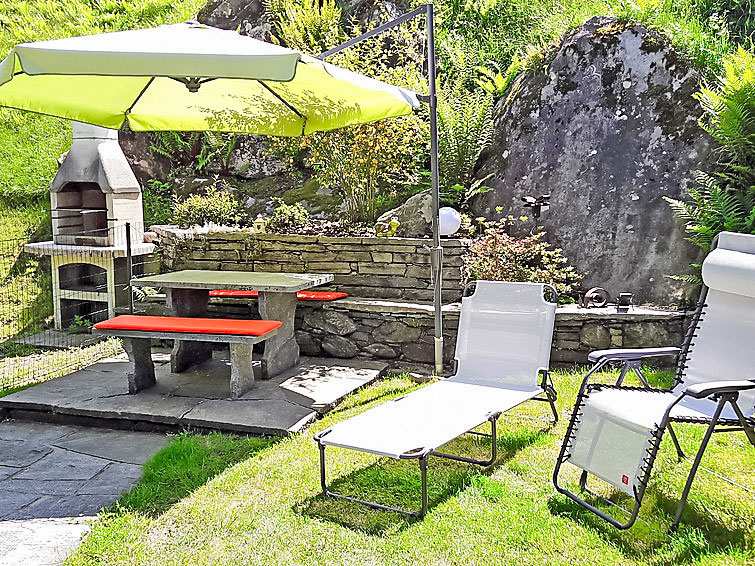 "La Rustica", 3-Zimmer-Haus. Zweckmässig und komfortabel eingerichtet: Wohn-/Esszimmer mit Schwedenofen, Kabel-TV, Flachbildschirm und Radio. Ausgang zum Gartensitzplatz. 1 Doppelzimmer mit 1 Doppelbett (2 x 90 cm, Länge 200 cm), E-Heizofen. 1 Zimmer mit 1 x 2 Etagenbetten (90 cm, Länge 200 cm), 1 Wandschrankbett (90 cm, Länge 200 cm), E-Heizofen. Offene Küche (4 Kochplatten, Backofen, elektrische Kaffeemaschine). Dusche/WC. Gartensitzplatz. Balkonmöbel, Liegestühle (2). Sicht auf die Berge. Zur Verfügung: Babybett bis 2 Jahre (extra). Maximal 2 Haustiere/Hunde erlaubt. Boiler 100 l. NL-00004314