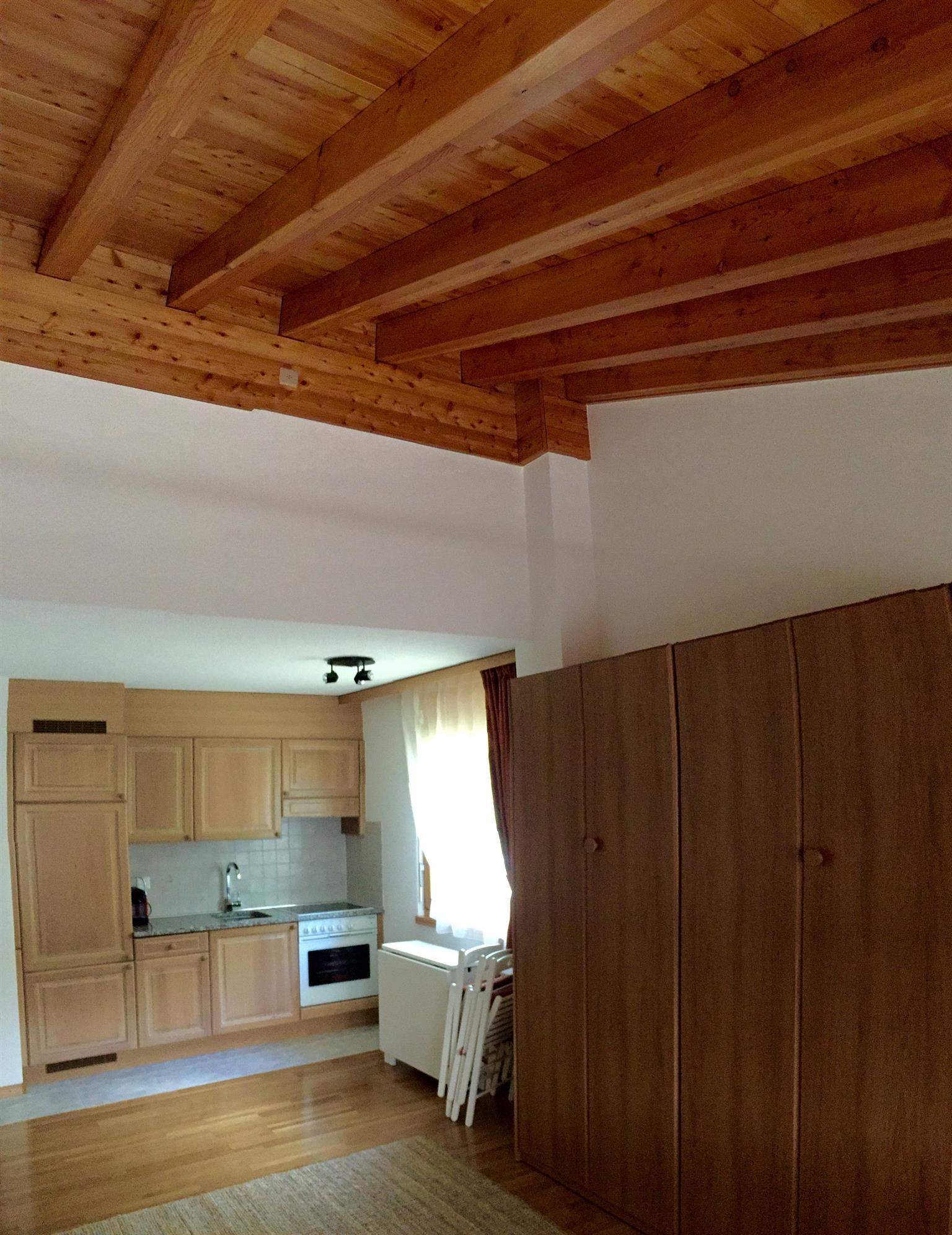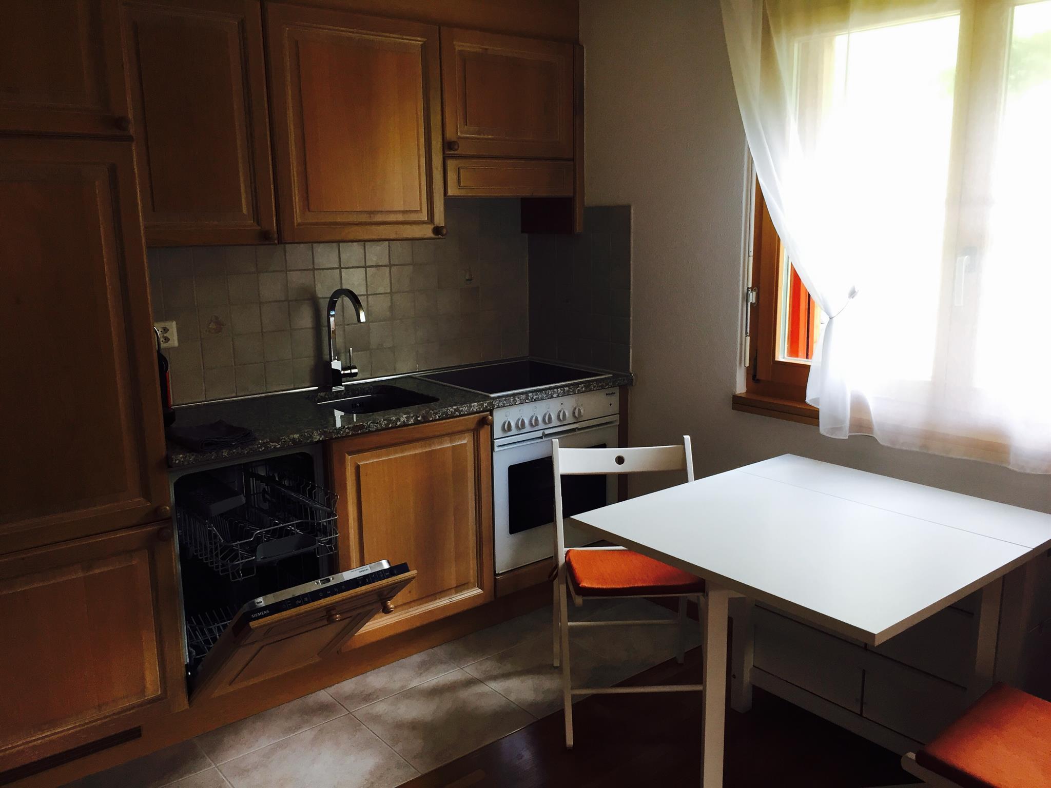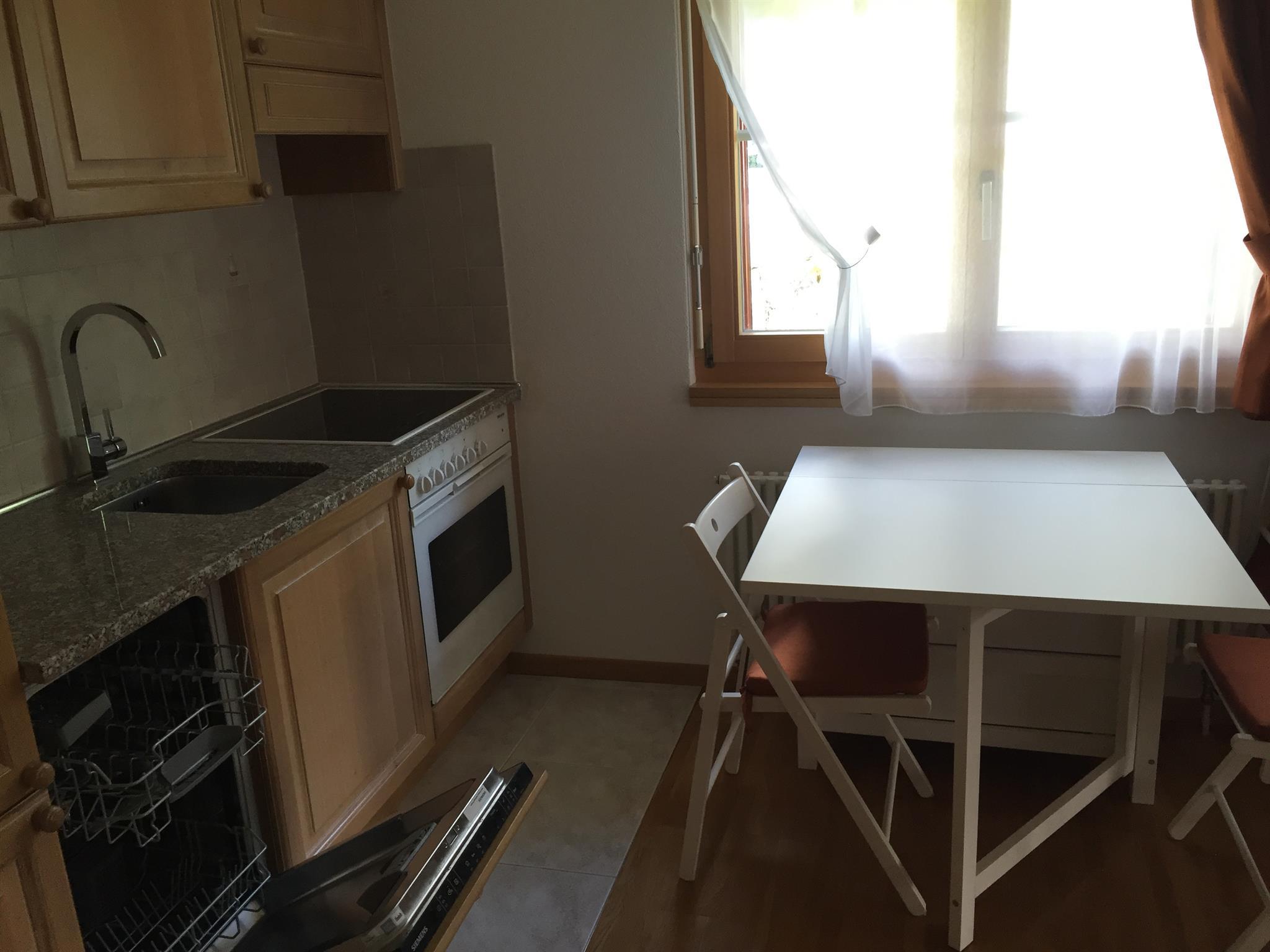 1-Zimmerwohnung (28m2) in der 4. Etage: Wohn-/Ess-/Schlafzimmer mit 2 Schrankbetten, Flat-TV, gratis W-Lan, BlueTooth Sound-System, offene Küche mit Geschirrspüler, Bad/WC, Nord-West-Balkon mit Panorama-Aussicht auf die Berge. Garage im Haus inklusive. Haustiere sind nicht erlaubt. Nichtraucher-Wohnung.