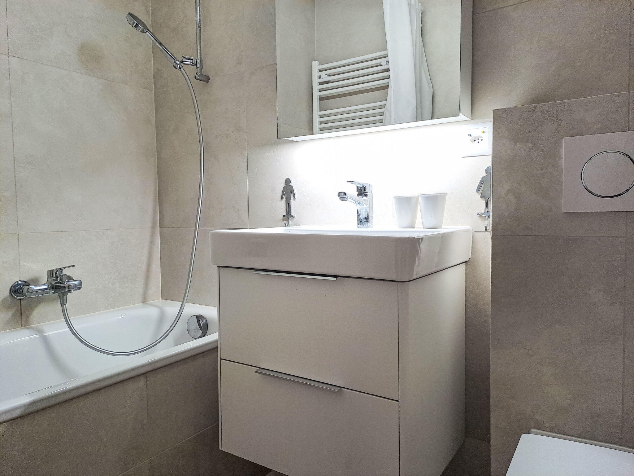 "Apollo 2", 2-Zimmer-Wohnung 30 m2, im Erdgeschoss. Einfach und zweckmässig eingerichtet: Wohn-/Esszimmer mit TV. Ausgang zur Terrasse. 1 Zimmer mit 1 Doppelbett (160 cm, Länge 200 cm). Offene Küche (Backofen, Geschirrspüler, 4 Glaskeramikplatten, Wasserkocher, elektrische Kaffeemaschine, Kapseln für die Kaffeemaschine (Nespresso), Racletteofen, Fondue Set (Käse)). Bad/WC. Kleine Terrasse. Terrassenmöbel. Schöne Sicht auf die Berge und die Landschaft. Gratis. Parkplatz beim Haus. Bitte beachten: Nichtraucher-Unterkunft.
