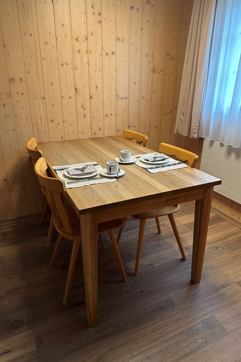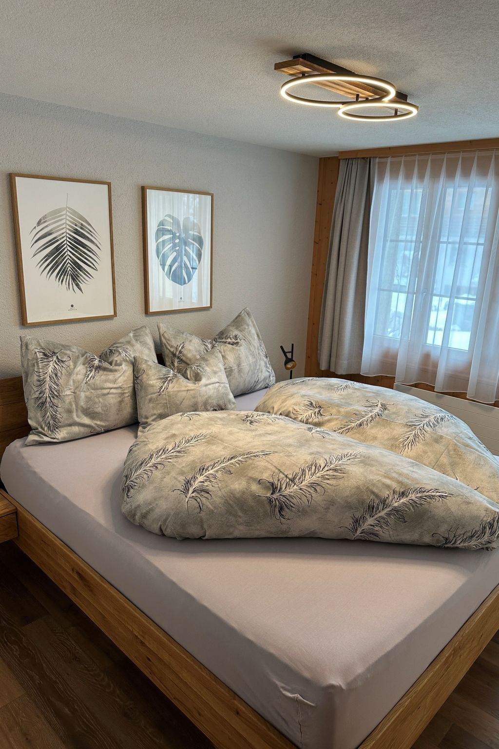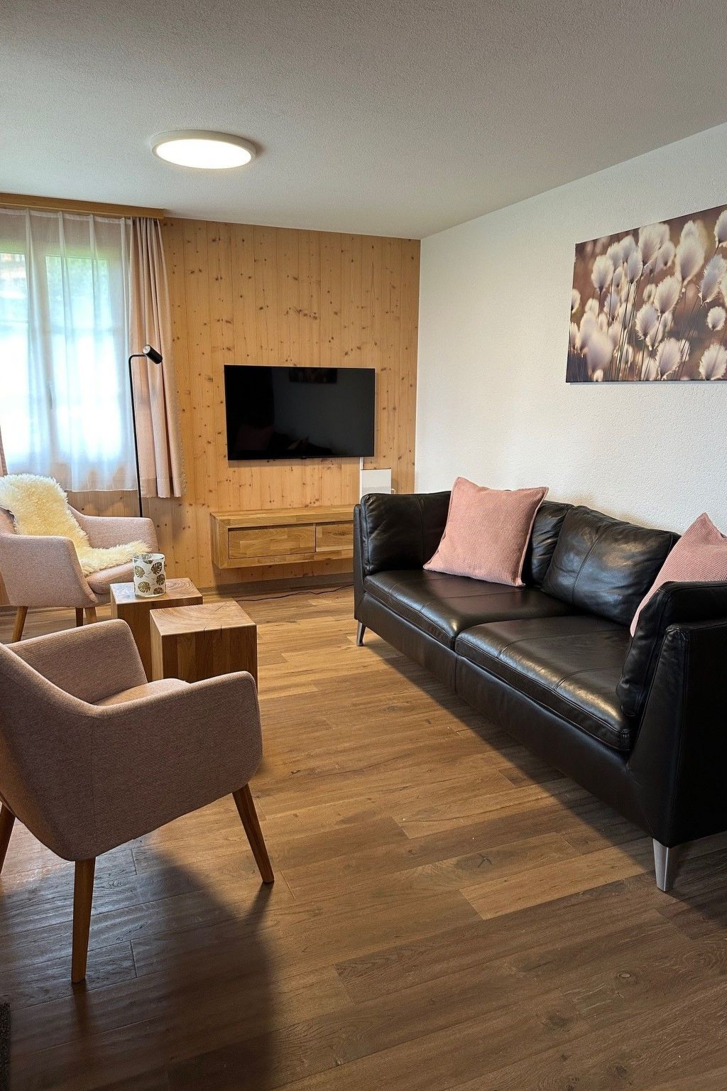 Innen besticht die Wohnung durch eine hochwertige Ausstattung, die keine Wünsche offenlässt: Eine gut ausgestattete Küche mit Glaskeramik-Kochfeld, Kühlschrank, Backofen sowie einer Auswahl an Kaffeemaschinen (Filter und Kapsel), einem Wasserkocher, einem Käsefondue-Set und einem Raclette Ofen. Im Wohnzimmer lädt eine bequeme Lederpolstergruppe zum Entspannen ein, ergänzt durch Stoffsessel, Beistelltische, Swisscom TV und WLAN. Die Schlafzimmer sind einladend gestaltet, eines mit einem Doppelbett, das andere mit zwei Einzelbetten, die zu einem großen Bett kombiniert werden können, neben praktischen Kleiderständern und Nachttischen.