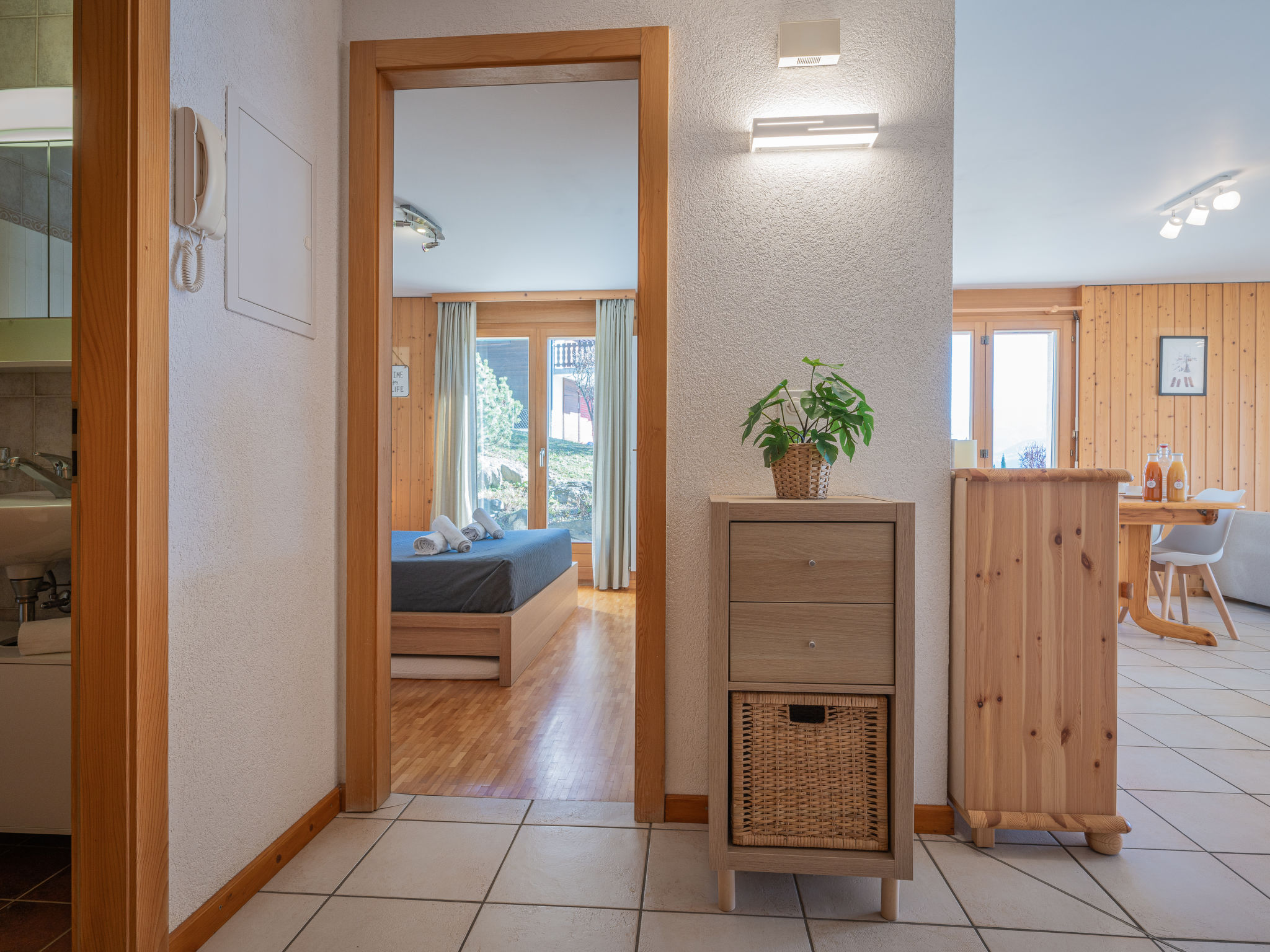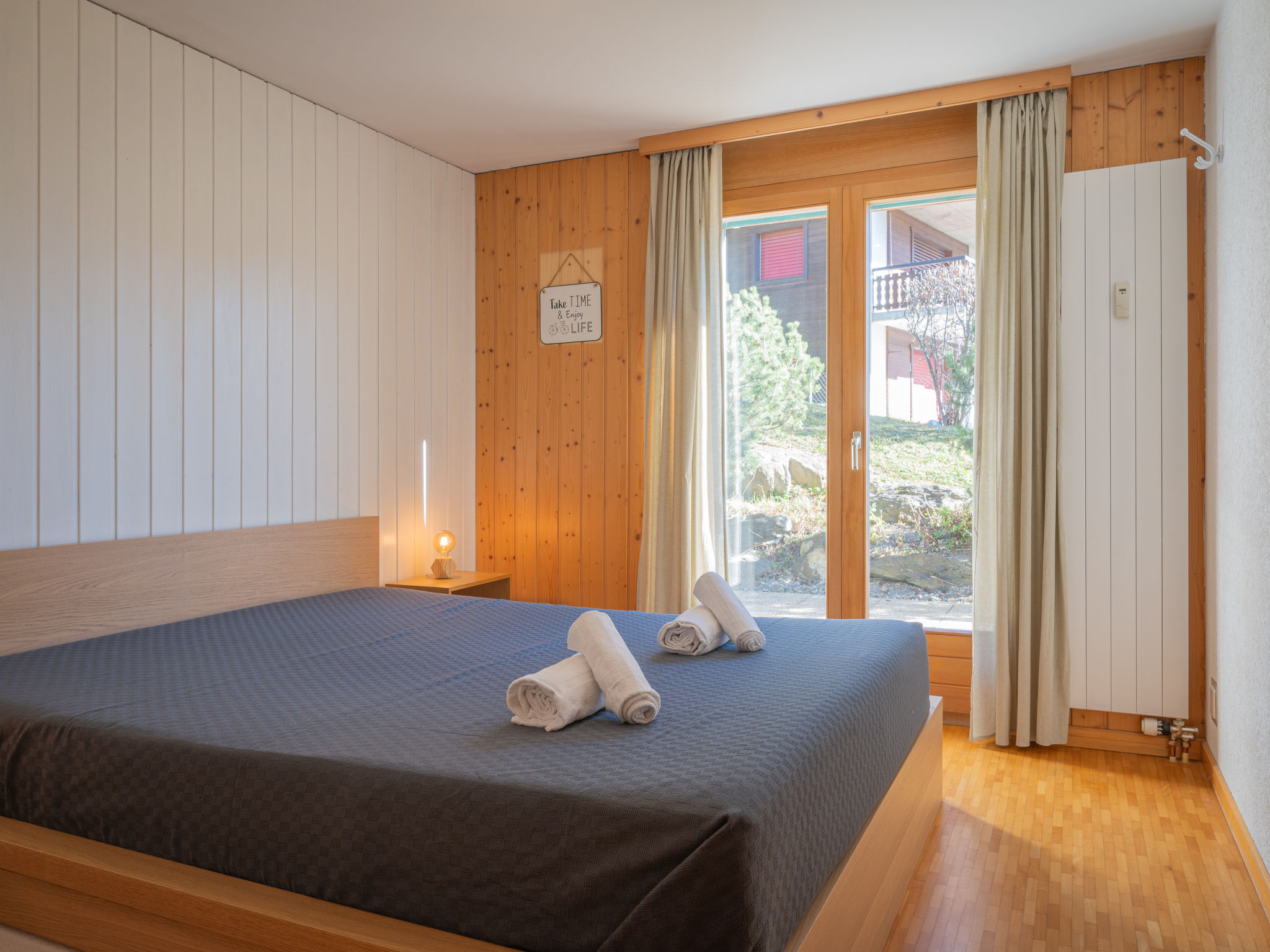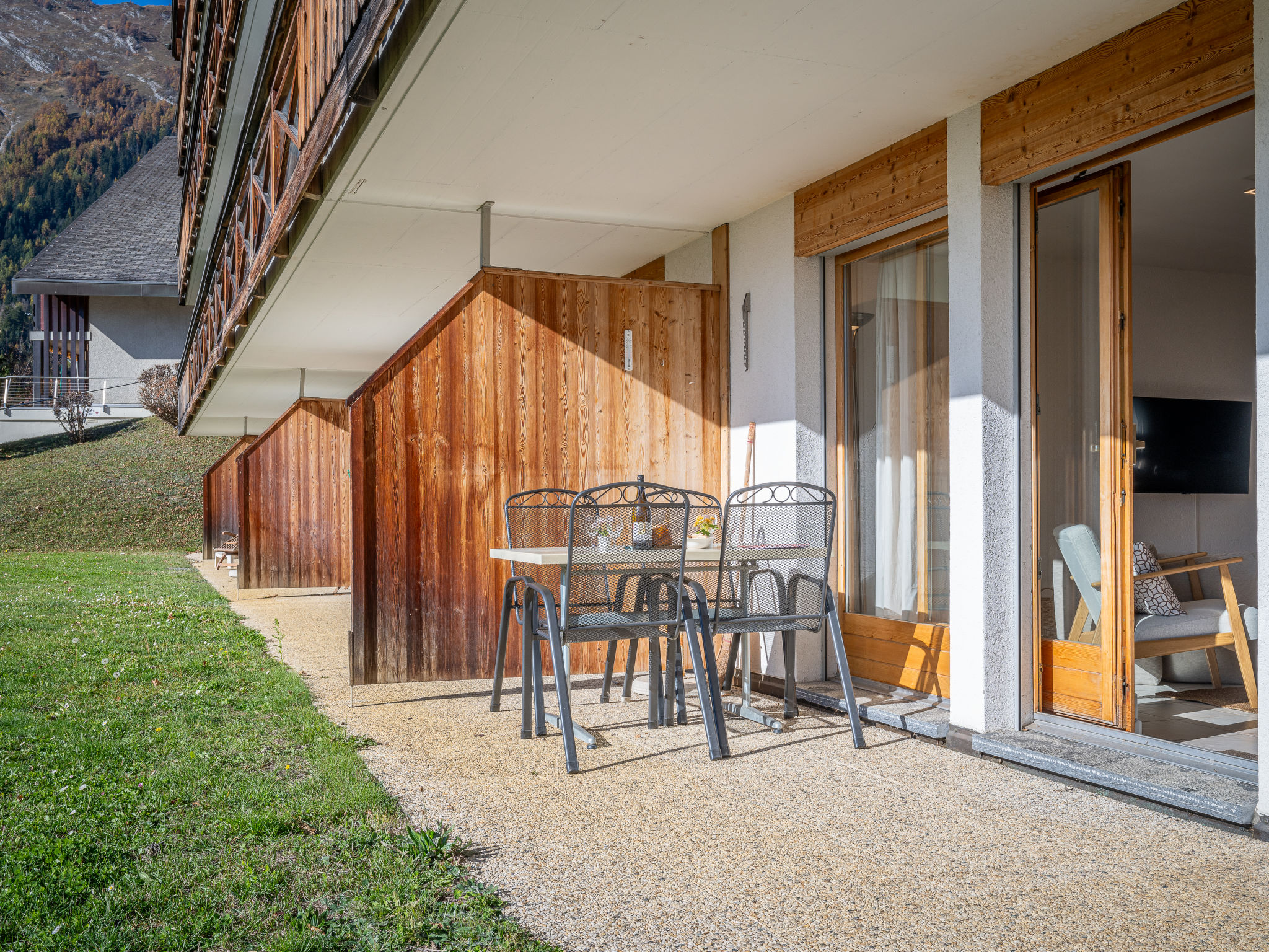 "Seya 15", 2-Zimmer-Wohnung 48 m2, im Erdgeschoss, Südlage. Hell, zweckmässig und komfortabel eingerichtet: Eingang. Wohn-/Esszimmer mit 1 Diwanbett (140 cm, Länge 200 cm), Kabel-TV. Ausgang zur Terrasse, Richtung Südosten. 1 Zimmer mit 1 franz. Bett (160 cm, Länge 200 cm). Ausgang zur Terrasse, Richtung Osten. Küche (4 Glaskeramikplatten, Toaster, Wasserkocher, Mikrowelle, elektrische Kaffeemaschine, Kapseln für die Kaffeemaschine (Nespresso) extra, Racletteofen, Fondue Set (Käse)). Bad/WC. Grosse Terrasse 39 m2, Südlage. Balkonmöbel, Liegestühle (2). Schöne Sicht auf die Berge. Zur Verfügung: Haartrockner. Internet (Wireless LAN, gratis). Garage Nr. 15 (1 Auto), Höhe 260 cm, Breite 250 cm. Bitte beachten: Nichtraucher-Unterkunft.