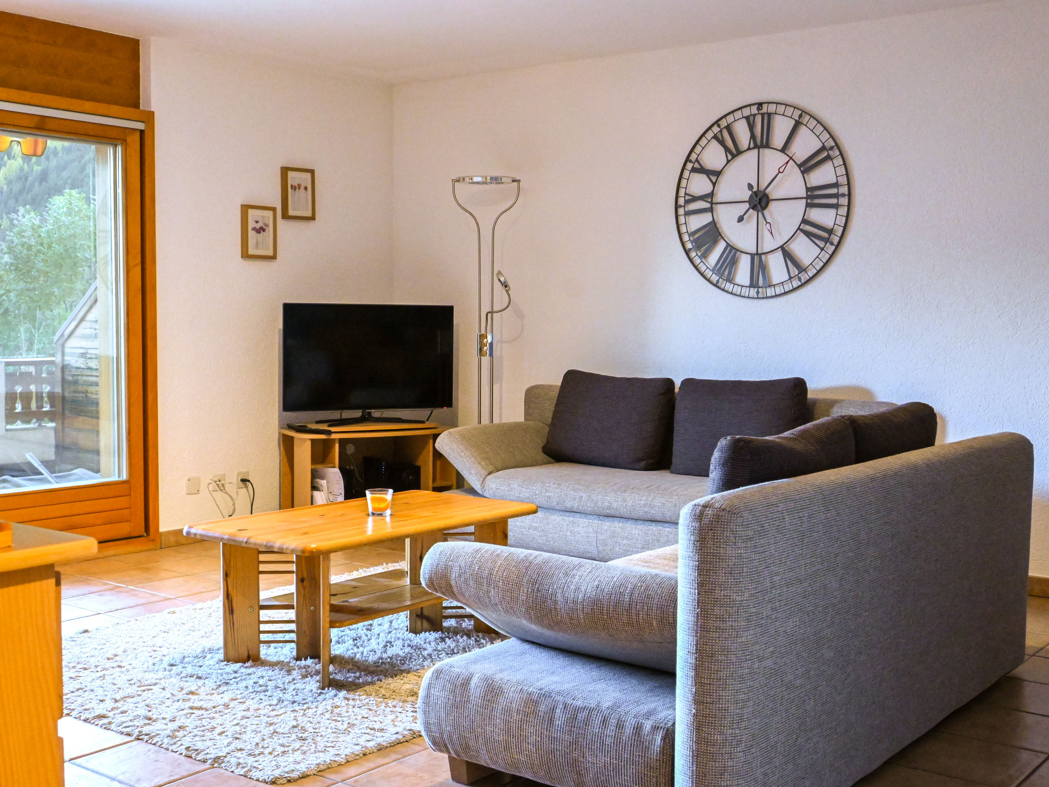 "Caroubier 2", 2-Zimmer-Wohnung 60 m2 im 1. Stock, Südlage. Komfortabel und schön eingerichtet: offener Eingang mit 1 Wandklappbett (95 cm, Länge 200 cm). Wohn-/Esszimmer mit offenem Kamin, Kabel-TV und DVD. Ausgang zum Balkon, Richtung Süden. 1 Zimmer mit 1 Doppelbett (2 x 80 cm, Länge 200 cm). Ausgang zum Balkon, Richtung Süden. Offene Küche (Backofen, Geschirrspüler, 4 Glaskeramikplatten, Mikrowelle, elektrische Kaffeemaschine, Kapseln für die Kaffeemaschine (Delizio) extra, Racletteofen, Fondue Set (Chinoise, Käse)) mit Esstisch. Bad/WC. Grosser Balkon 26 m2, Südlage. Balkonmöbel, Gartengrill, Liegestühle. Schöne Sicht auf die Berge. Zur Verfügung: Bügeleisen, Haartrockner. Internet (WLAN, gratis). Parkplatz Nr. 2 devant le box n°2 (überdacht, 1 Auto), Garage Nr. 2 (1 Auto), Höhe 210 cm, Breite 290 cm. Bitte beachten: Nichtraucher-Unterkunft. Maximal 1 Haustier/Hund erlaubt. Anstelle eines abgeschlossenen Schlafzimmers befinden sich manche Schlafplätze in einem offenen Bereich (Galerie, Nische etc.).