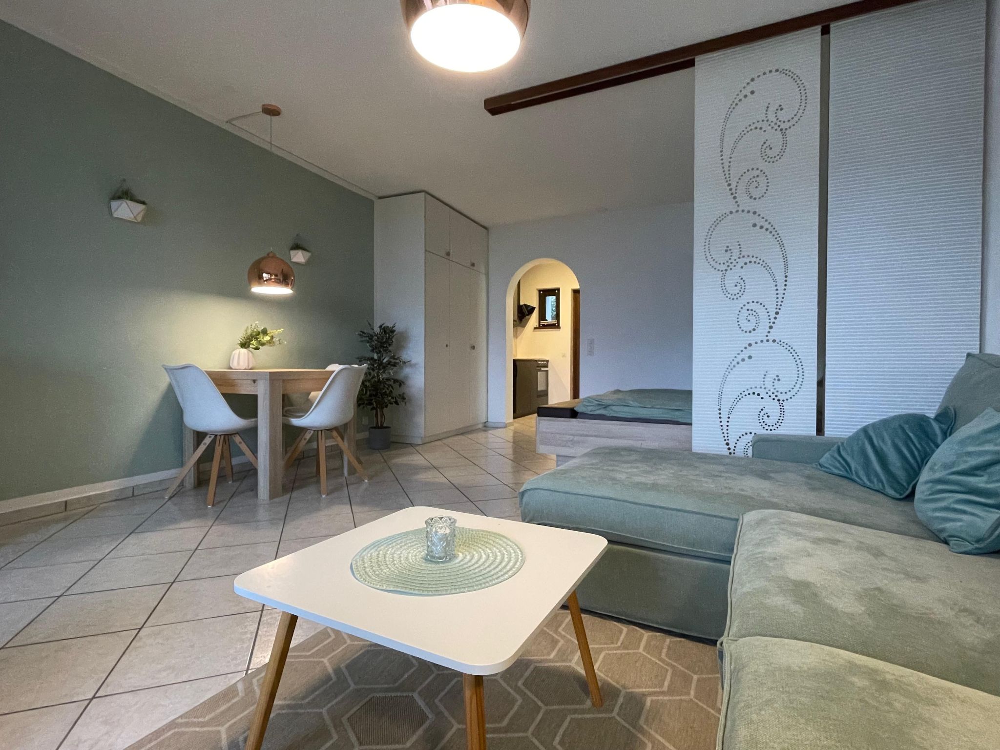 1-Zimmer Wohnung 45qm, kombinierter Wohn- und Schlafbereich mit zwei Betten, Sofa, Smart-TV mit Radio. Terrasse mit Seeblick.