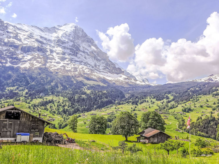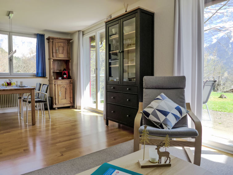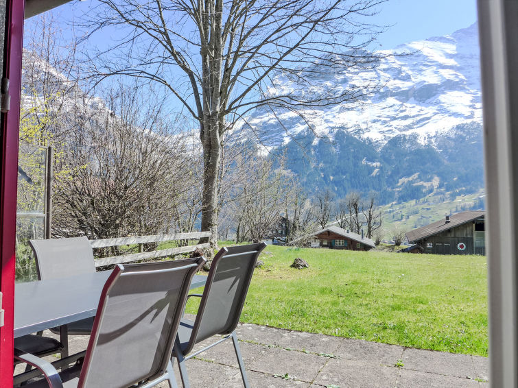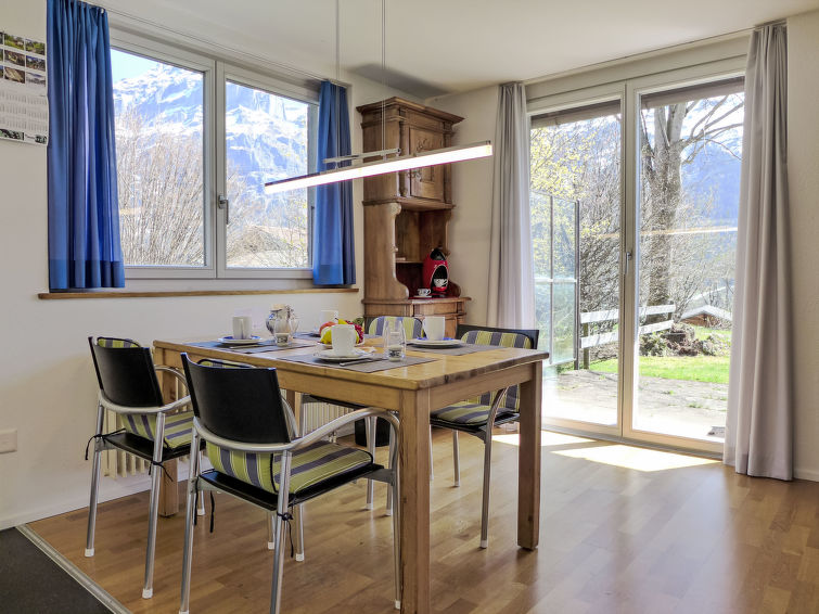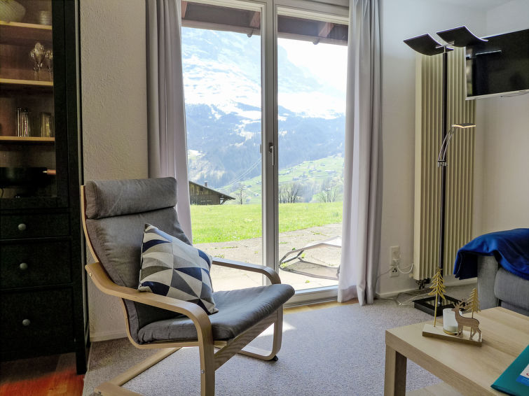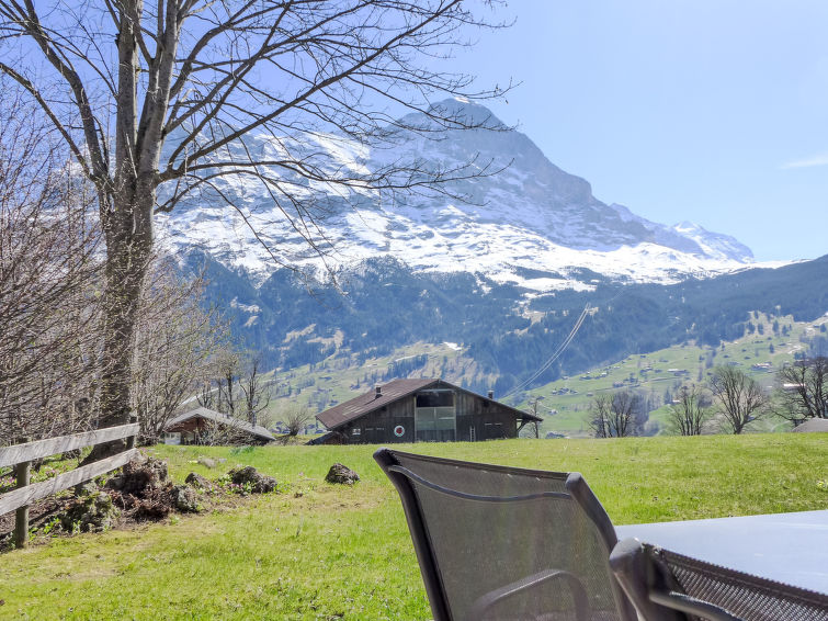 2-Zimmer-Wohnung 64 m2, im Erdgeschoss, Südlage. Zweckmässig und gemütlich eingerichtet: Wohn-/Schlafzimmer mit 1 Doppeldiwanbett (140 cm, Länge 200 cm), Sat-TV (Flachbildschirm), Radio. Ausgang zur Terrasse. 1 Zimmer mit 1 Doppelbett (2 x 90 cm, Länge 200 cm). Offene Küche (4 Kochplatten, Backofen, Geschirrspüler, Toaster, Wasserkocher, elektrische Kaffeemaschine, Kapseln für die Kaffeemaschine (Dolce Gusto) extra, Racletteofen, Fondue Set (Käse)). Bad, sep. WC. Grosse Terrasse, Südlage. Terrassenmöbel. Herrliche Sicht auf die Berge, das Tal und Eigernordwand. Zur Verfügung: Haartrockner. Internet (Wireless LAN, gratis). Parkplatz beim Haus. Bitte beachten: Nichtraucher-Unterkunft. Feuerlöscher.