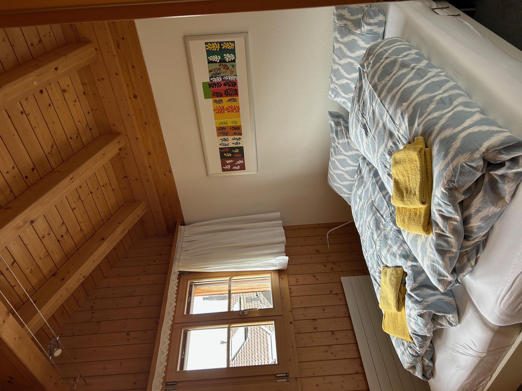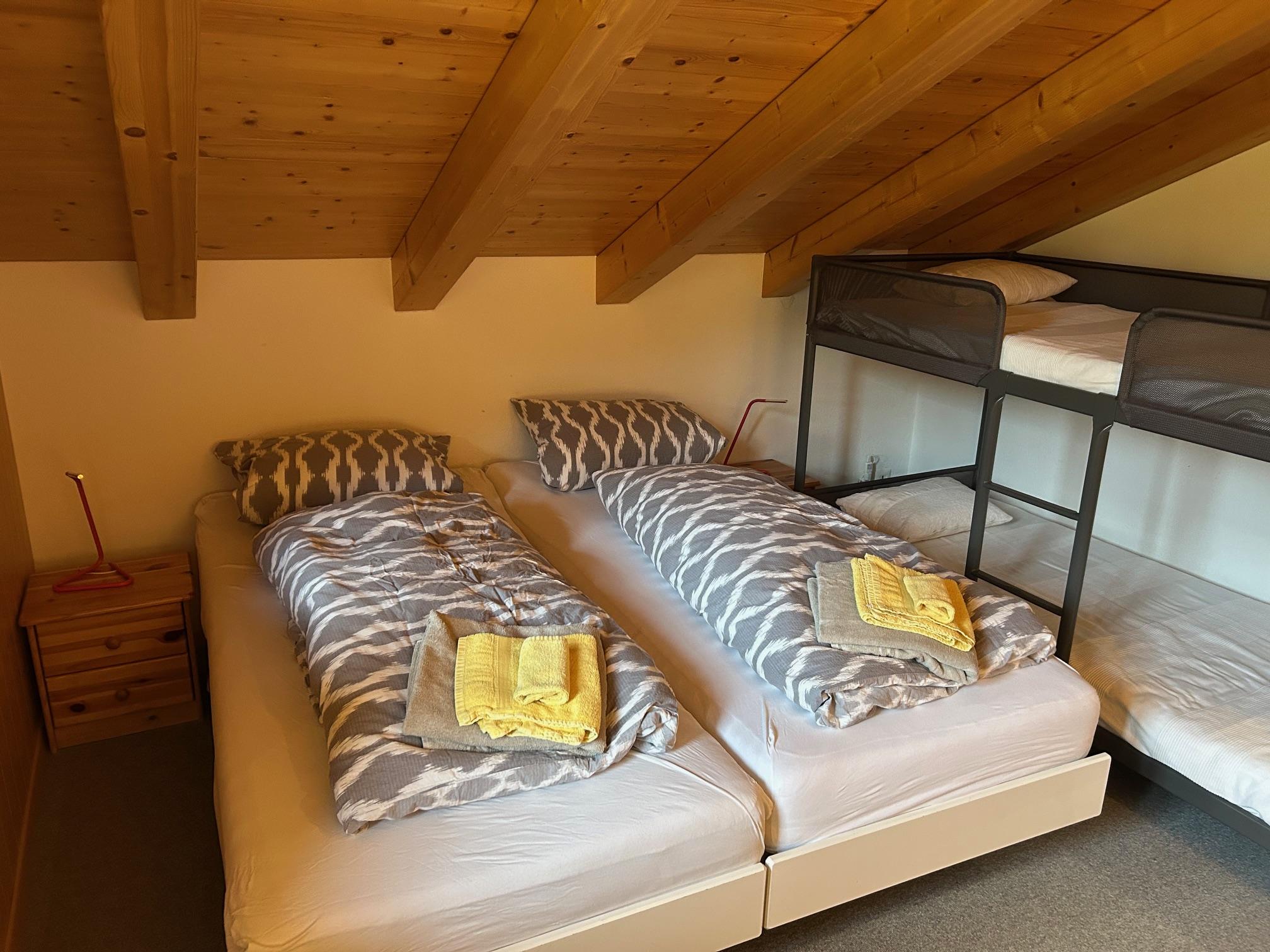 3-Zimmerwohnung (75m2) im 2. Stock, Chalet mit 6 Wohnungen. Bad/WC. 2 Schlafzimmer und Galerie mit insgesamt 5 Betten. Duvets nordisch, Bettwäsche vorhanden. Küche mit Backofen, Mikrowelle, Kühlschrank, Geschirrspüler. Wohn-Esszimmer mit Cheminée, Kabel-TV, DVD-Player, Radio, Telefon, WLAN. Balkon mit Gartenmöbeln, Garage, Waschmaschine, Skiraum, Zentralheizung. Haustiere sind nicht erlaubt.