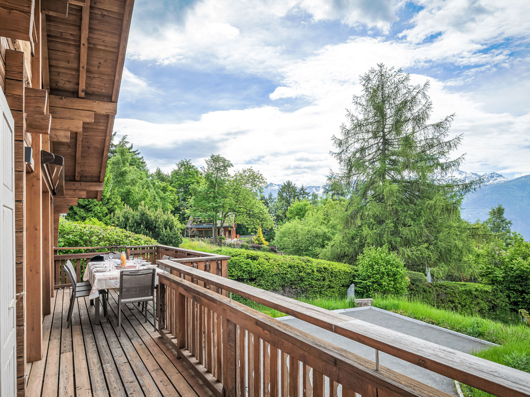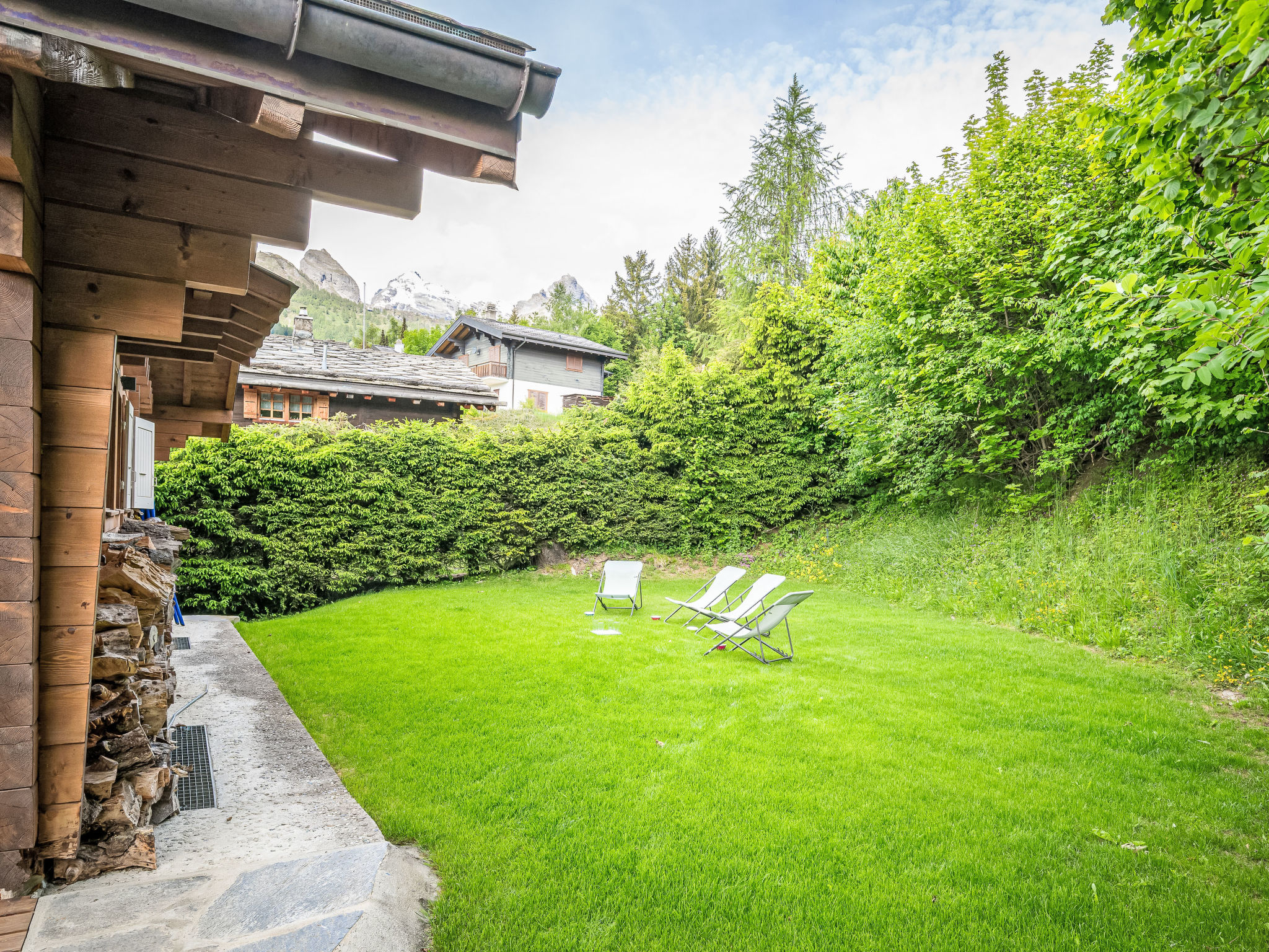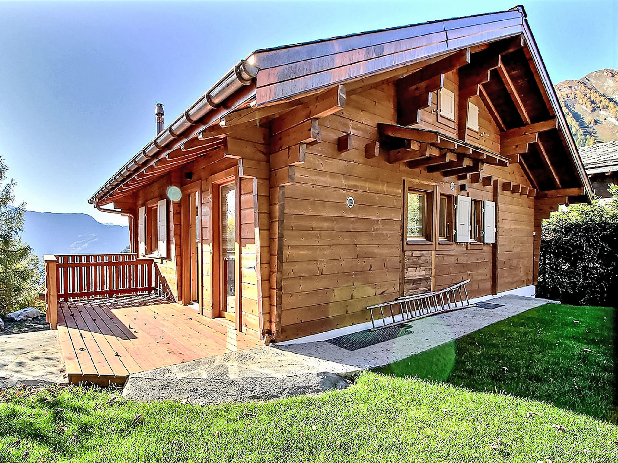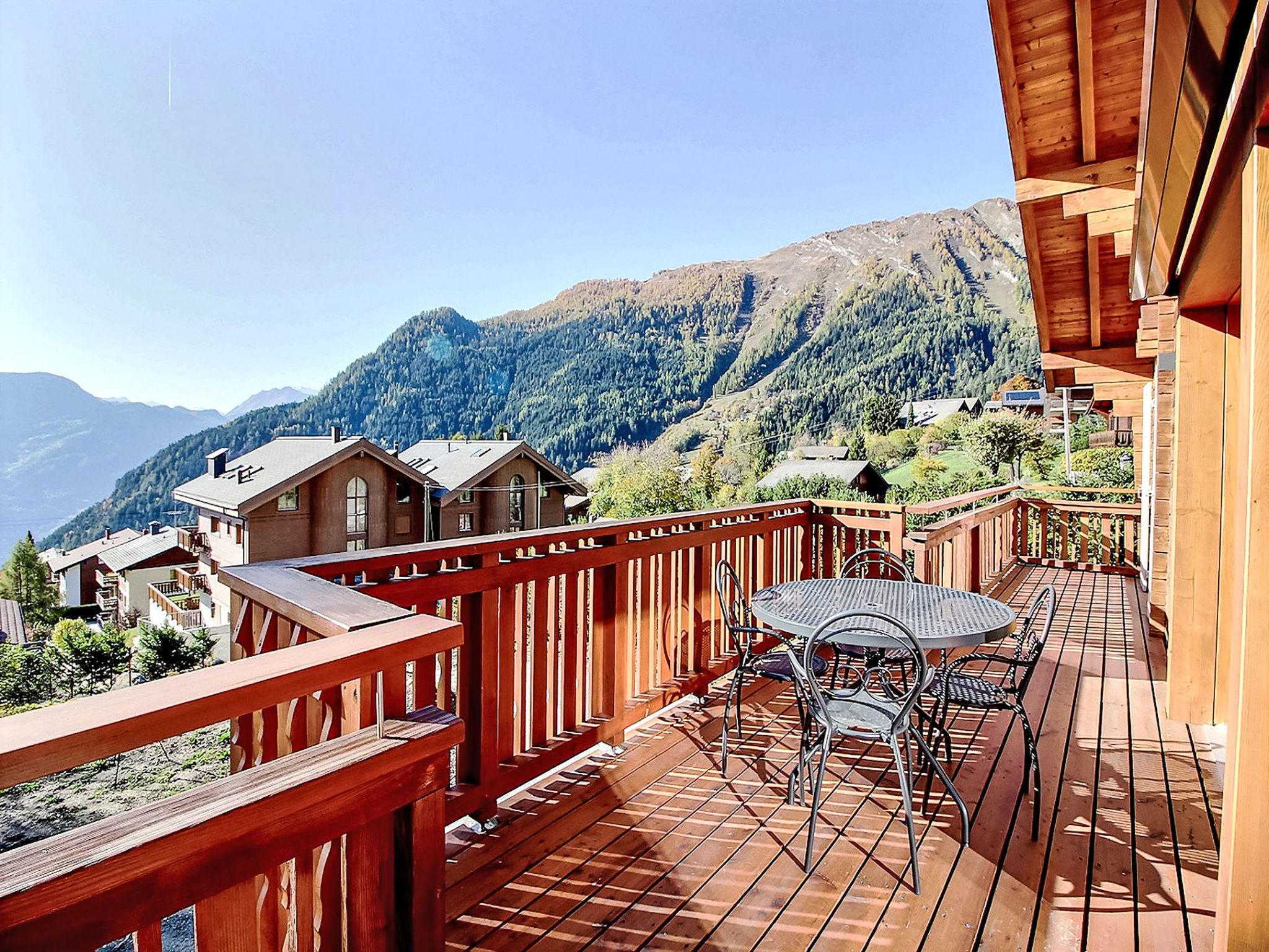 "L'Eden", 5-Zimmer-Chalet 150 m2 auf 3 Stockwerken, Südlage. Hell, renoviert im Jahre 2019, komfortabel und modern eingerichtet: Wohn-/Esszimmer mit Schwedenofen, Kabel-TV, Radio und CD. Ausgang zum Garten, zum Balkon. 1 Zimmer mit 1 franz. Bett (160 cm, Länge 200 cm), Bad/Dusche/WC und Kabel-TV. Ausgang zum Balkon. Offene Küche (Backofen, Geschirrspüler, 4 Induktionskochplatten, Wasserkocher, Mikrowelle, Tiefkühler, elektrische Kaffeemaschine, Kapseln für die Kaffeemaschine (Nespresso) extra, Racletteofen, Kochinsel, Fondue Set (Käse)). Sep. WC. Unteres Geschoss: 1 Zimmer mit 1 franz. Bett (160 cm, Länge 200 cm). Ausgang zur Terrasse. 1 Zimmer mit 1 franz. Bett (160 cm, Länge 200 cm). Ausgang zur Terrasse. Dusche/WC. Dachgeschoss: (steile Treppe) abgeschrägte, offene Galerie mit 2 Betten (90 cm, Länge 200 cm). Grosser Balkon, Südlage, kleine Terrasse, Ostlage, grosse Terrasse, Südlage, Garten 350 m2, Nordlage. Balkonmöbel, Gartengrill (mobil), Liegestühle (3). Sehr schöne Sicht auf die Berge, das Tal und die Landschaft. Zur Verfügung: Waschmaschine, Wäschetrockner, Haartrockner. Internet (Wireless LAN, gratis). Parkplatz (4 Autos), Garage, Höhe 210 cm, Breite 250 cm. Bitte beachten: Nichtraucher-Haus.
