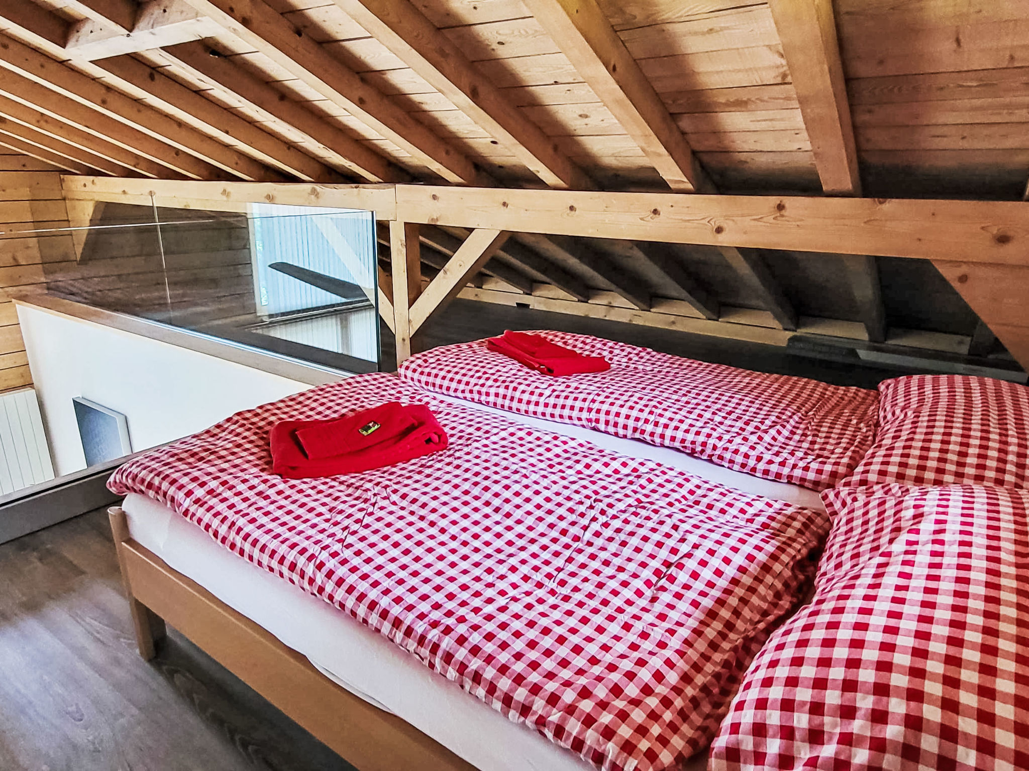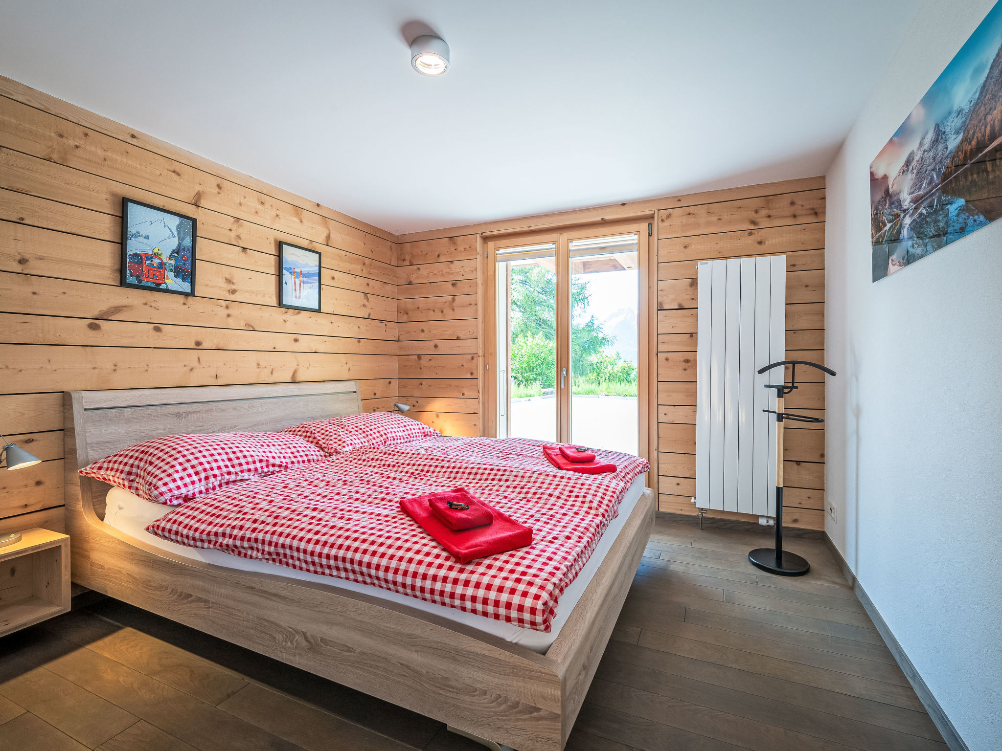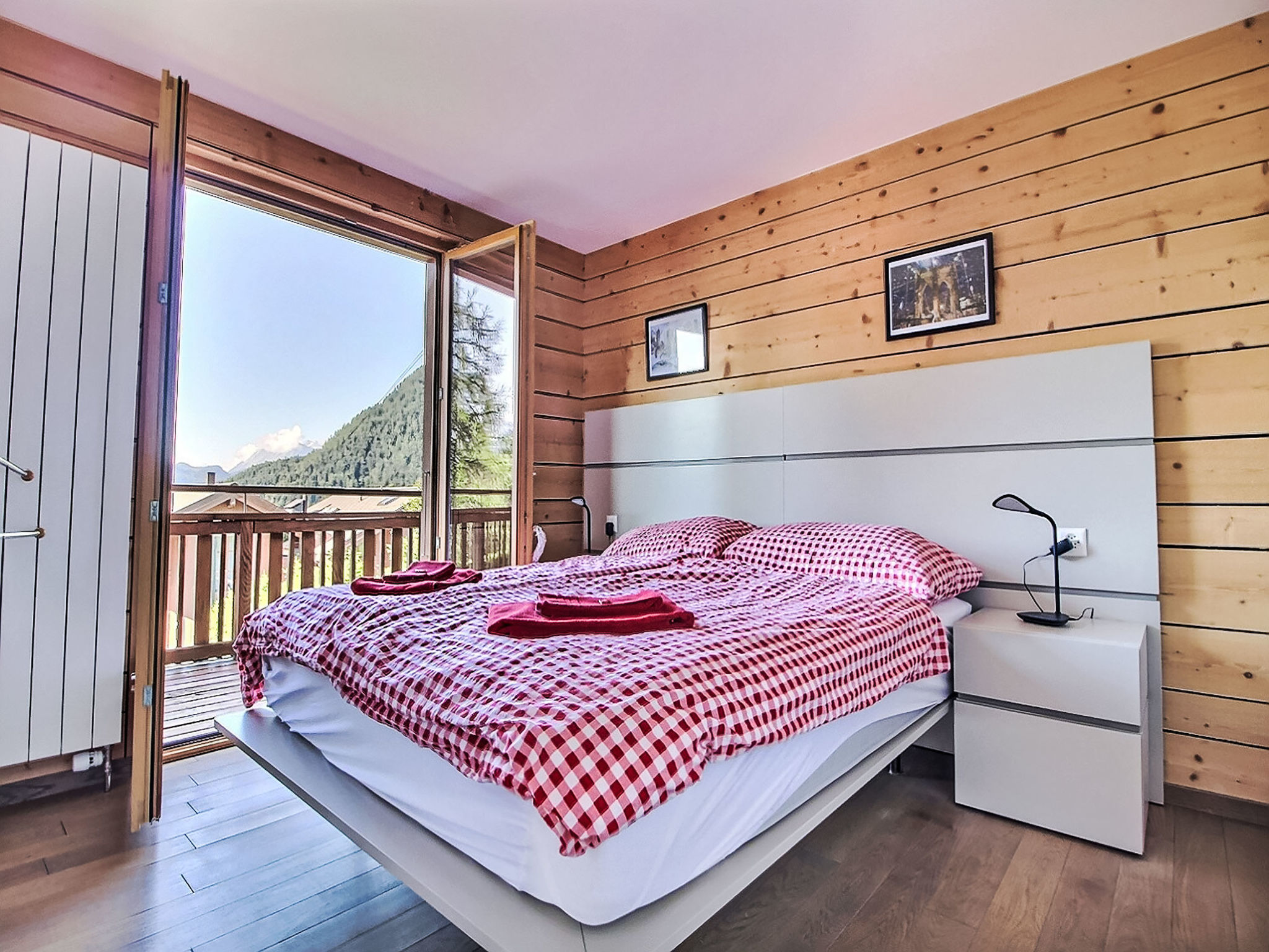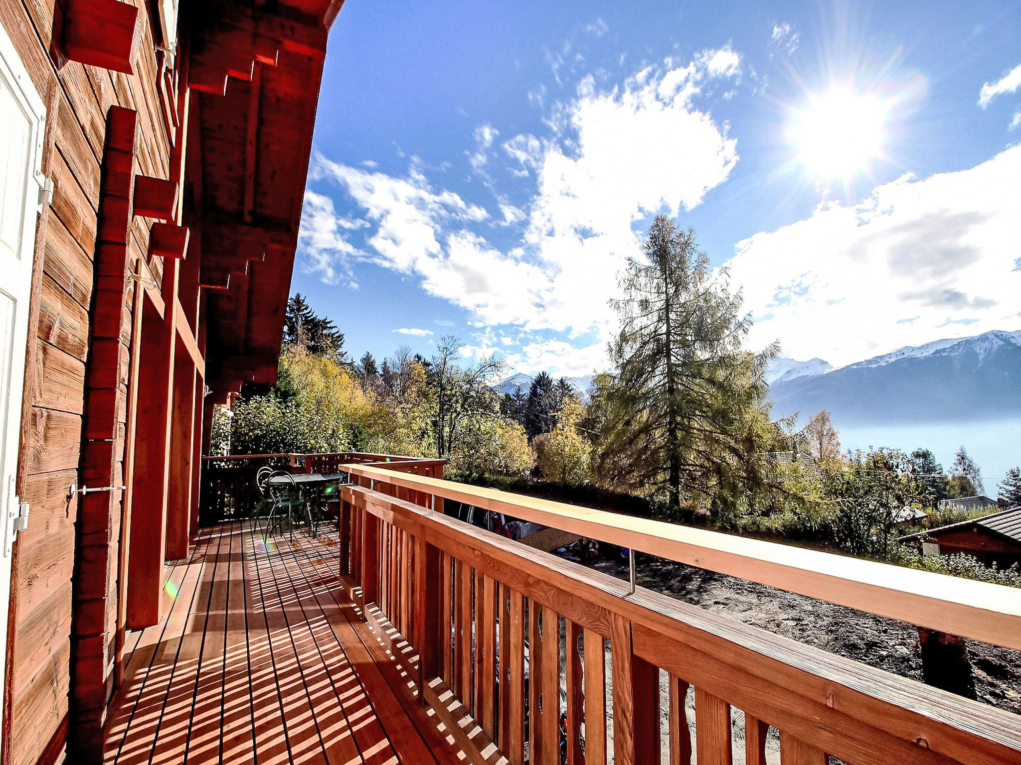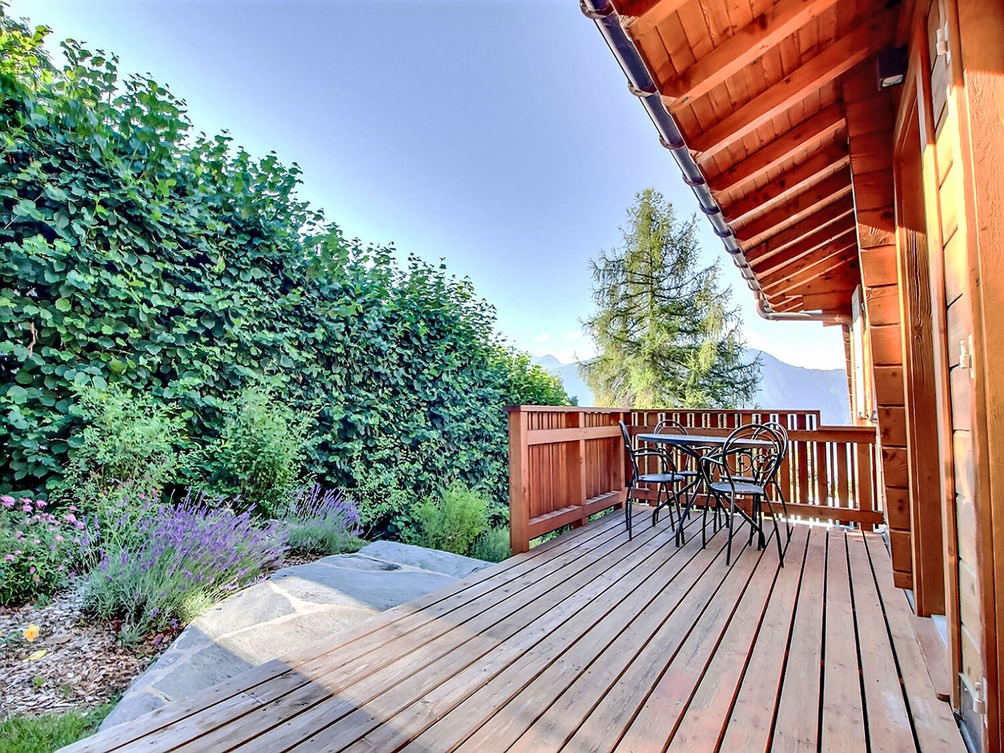 "L'Eden", 5-Zimmer-Chalet 150 m2 auf 3 Stockwerken, Südlage. Hell, renoviert im Jahre 2019, komfortabel und modern eingerichtet: Wohn-/Esszimmer mit Schwedenofen, Kabel-TV, Radio und CD. Ausgang zum Garten, zum Balkon. 1 Zimmer mit 1 franz. Bett (160 cm, Länge 200 cm), Bad/Dusche/WC und Kabel-TV. Ausgang zum Balkon. Offene Küche (Backofen, Geschirrspüler, 4 Induktionskochplatten, Wasserkocher, Mikrowelle, Tiefkühler, elektrische Kaffeemaschine, Kapseln für die Kaffeemaschine (Nespresso) extra, Racletteofen, Kochinsel, Fondue Set (Käse)). Sep. WC. Unteres Geschoss: 1 Zimmer mit 1 franz. Bett (160 cm, Länge 200 cm). Ausgang zur Terrasse. 1 Zimmer mit 1 franz. Bett (160 cm, Länge 200 cm). Ausgang zur Terrasse. Dusche/WC. Dachgeschoss: (steile Treppe) abgeschrägte, offene Galerie mit 2 Betten (90 cm, Länge 200 cm). Grosser Balkon, Südlage, kleine Terrasse, Ostlage, grosse Terrasse, Südlage, Garten 350 m2, Nordlage. Balkonmöbel, Gartengrill (mobil), Liegestühle (3). Sehr schöne Sicht auf die Berge, das Tal und die Landschaft. Zur Verfügung: Waschmaschine, Wäschetrockner, Haartrockner. Internet (Wireless LAN, gratis). Parkplatz (4 Autos), Garage, Höhe 210 cm, Breite 250 cm. Bitte beachten: Nichtraucher-Haus.