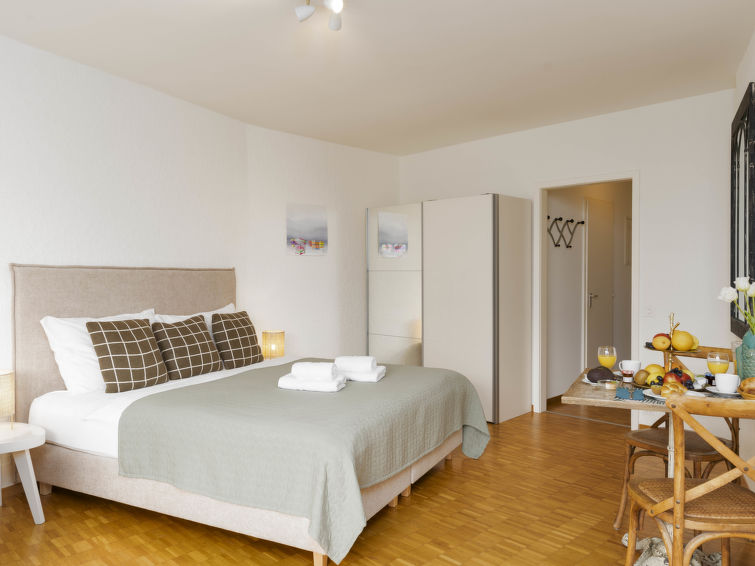 "Double Room Modern", 1-Zimmer-Wohnung 35 m2 im 2. Stock, Südlage. Renoviert: Wohn-/Esszimmer mit 1 Doppelbett (1 x 160 cm, Länge 200 cm), Sat-TV und Radio. Kochnische (Backofen, elektrische Kaffeemaschine, Kapseln für die Kaffeemaschine (Nespresso) extra). Bad/WC. Ölheizung. Balkon, Südlage. Herrliche Sicht auf den See, die Berge und die Ortschaft. Zur Verfügung: Internet (Wireless LAN, gratis). Bitte beachten: Nichtraucher-Unterkunft. Maximal 1 Haustier/Hund erlaubt. NL-00004955