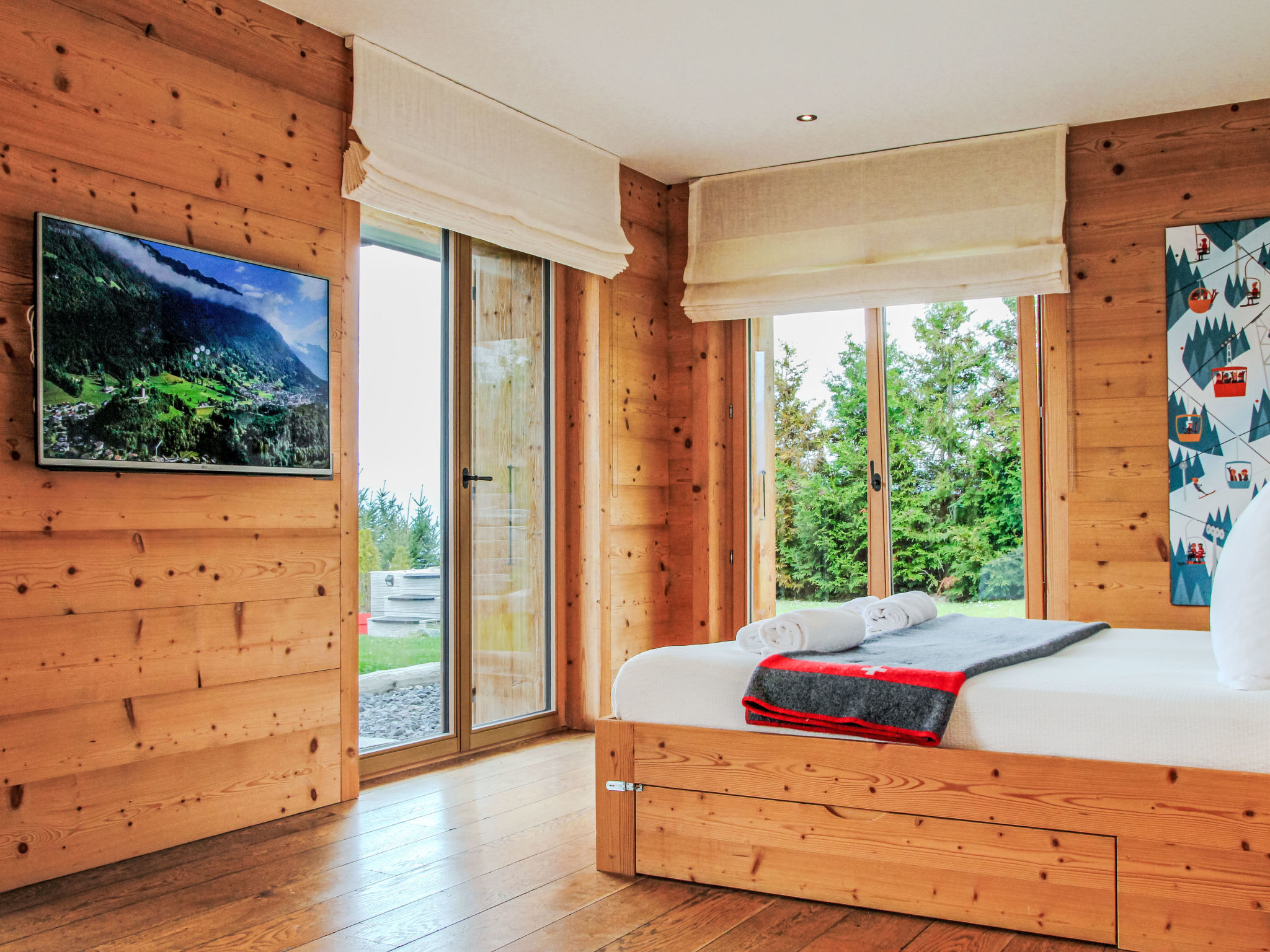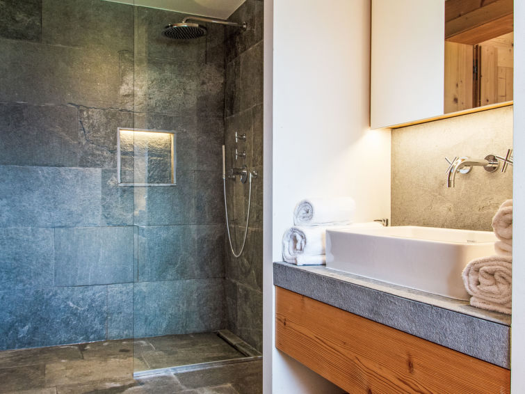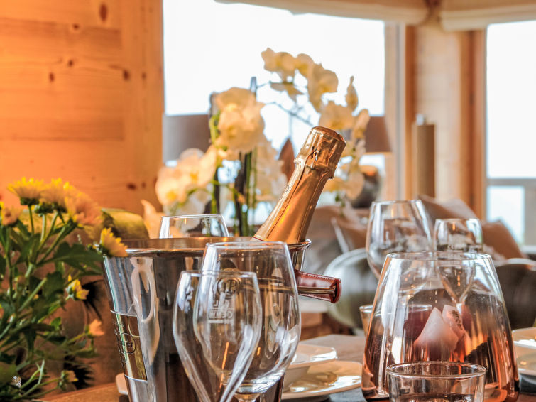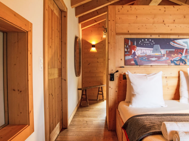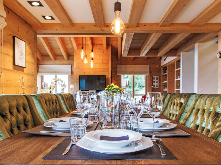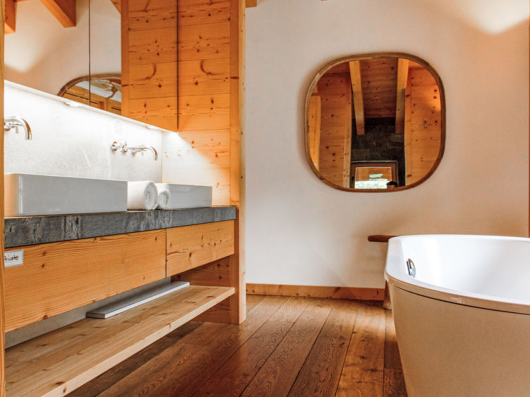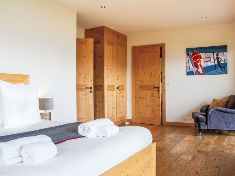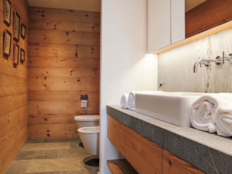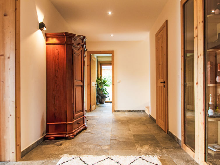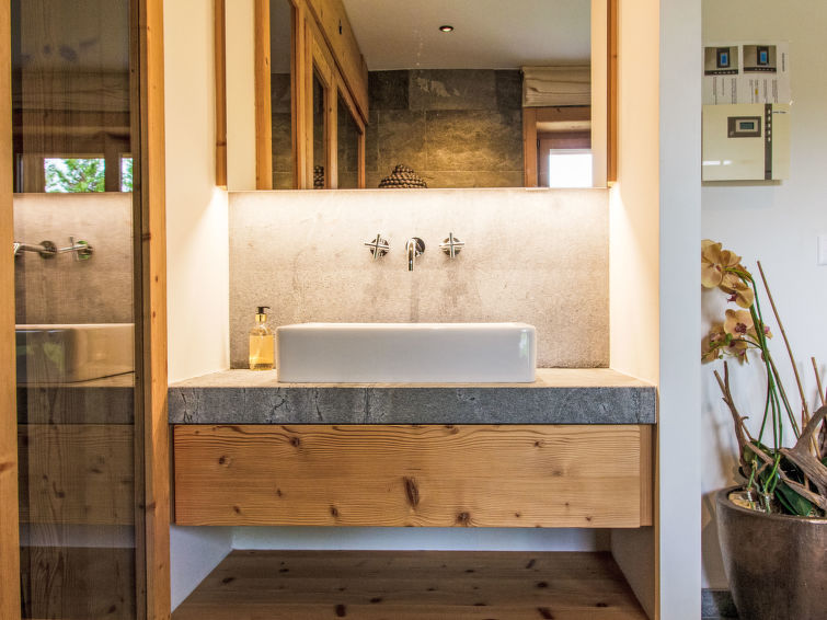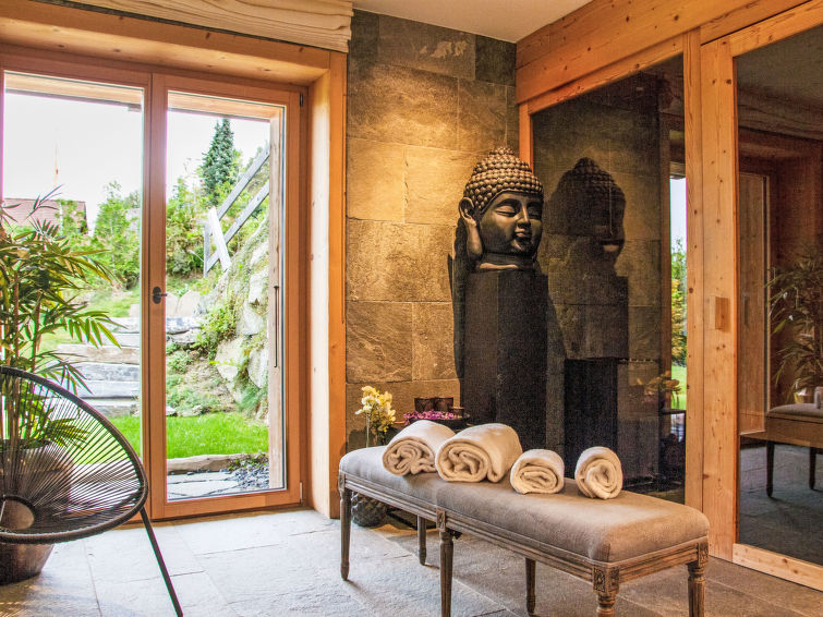"Chalet Gerritsen", 6-Zimmer-Chalet 280 m2 auf 3 Stockwerken, Nordwestlage. Geräumig und hell, modern und luxuriös eingerichtet: Eingang mit sep. WC. Grosses Wohn-/Esszimmer mit offenem Kamin, Kabel-TV, Stereoanlage und Heimkino. Ausgang zur Terrasse, Richtung Norden und Richtung Westen. Grosse, offene Küche (Backofen, Geschirrspüler, 5 Flammen, Toaster, Wasserkocher, Mikrowelle, Tiefkühler, elektrische Kaffeemaschine, Racletteofen, Kochinsel, Fondue Set (Käse)). Ausgang zur Terrasse. Fussbodenheizung. Unteres Geschoss: 1 Zimmer mit 1 franz. Bett (180 cm, Länge 200 cm), Bad/Bidet/WC und Kabel-TV. Ausgang zum Garten. 1 Zimmer mit 1 x 2 Etagenbetten (90 cm, Länge 200 cm), Kabel-TV. Ausgang zum Garten. 1 Zimmer mit 1 franz. Bett (180 cm, Länge 200 cm), Dusche/WC. Ausgang zum Garten. Dusche/WC, Sauna. Obergeschoss: offenes Büro. 1 Zimmer mit 1 franz. Bett (180 cm, Länge 200 cm), Bad/Dusche/WC, Doppelwaschbecken und Kabel-TV. Ausgang zum Balkon, Richtung Norden und Richtung Süden. Parkettboden. Grosse Terrasse, Nordlage und Westlage, grosser Garten. Terrassenmöbel, Gartengrill, Liegestühle (2). Herrliche Sicht auf die Berge und das Tal. Zur Verfügung: Waschmaschine, Wäschetrockner, Kinderhochstuhl, Babybett, Haartrockner. Internet (WLAN, gratis). Parkplatz (2 Autos), im Winter in 50 m. Bitte beachten: Nichtraucher-Unterkunft. Maximal 1 Haustier/Hund erlaubt.