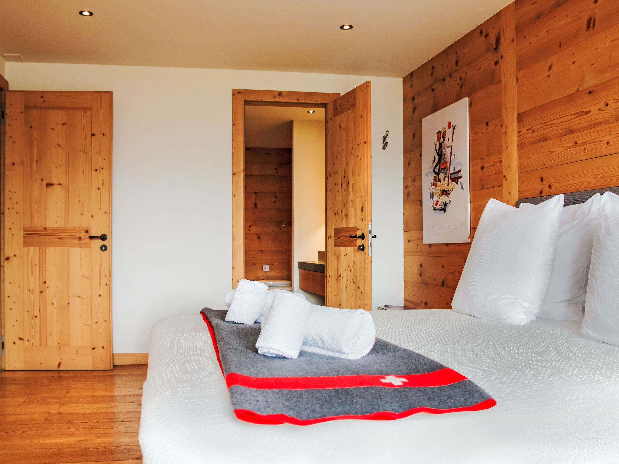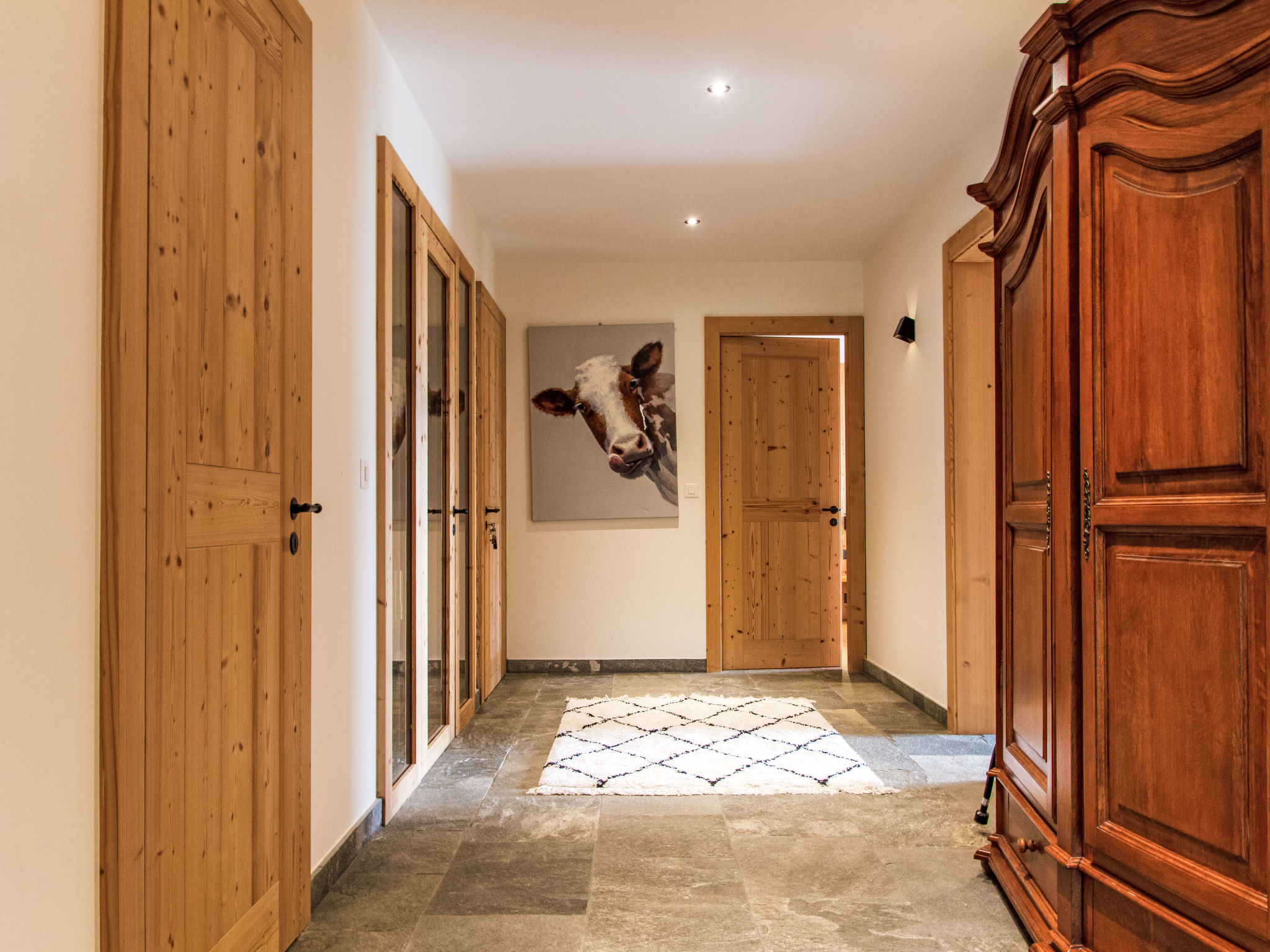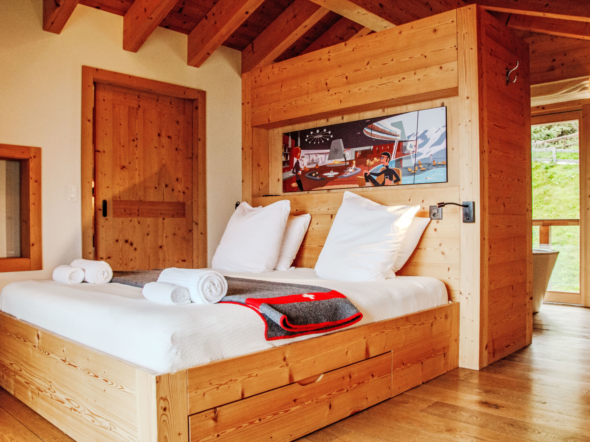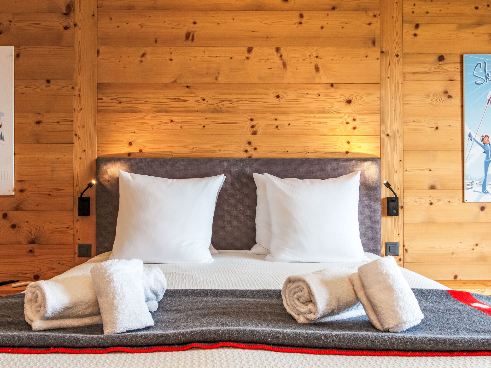 "Chalet Gerritsen", 6-Zimmer-Chalet 280 m2 auf 3 Stockwerken, Nordwestlage. Geräumig und hell, modern und luxuriös eingerichtet: Eingang mit sep. WC. Grosses Wohn-/Esszimmer mit offenem Kamin, Kabel-TV, Stereoanlage und Heimkino. Ausgang zur Terrasse, Richtung Norden und Richtung Westen. Grosse, offene Küche (Backofen, Geschirrspüler, 5 Flammen, Toaster, Wasserkocher, Mikrowelle, Tiefkühler, elektrische Kaffeemaschine, Racletteofen, Kochinsel, Fondue Set (Käse)). Ausgang zur Terrasse. Fussbodenheizung. Unteres Geschoss: 1 Zimmer mit 1 franz. Bett (180 cm, Länge 200 cm), Bad/Bidet/WC und Kabel-TV. Ausgang zum Garten. 1 Zimmer mit 1 x 2 Etagenbetten (90 cm, Länge 200 cm), Kabel-TV. Ausgang zum Garten. 1 Zimmer mit 1 franz. Bett (180 cm, Länge 200 cm), Dusche/WC. Ausgang zum Garten. Dusche/WC, Sauna. Obergeschoss: offenes Büro. 1 Zimmer mit 1 franz. Bett (180 cm, Länge 200 cm), Bad/Dusche/WC, Doppelwaschbecken und Kabel-TV. Ausgang zum Balkon, Richtung Norden und Richtung Süden. Parkettboden. Grosse Terrasse, Nordlage und Westlage, grosser Garten. Terrassenmöbel, Gartengrill, Liegestühle (2). Herrliche Sicht auf die Berge und das Tal. Zur Verfügung: Waschmaschine, Wäschetrockner, Kinderhochstuhl, Babybett, Haartrockner. Internet (WLAN, gratis). Parkplatz (2 Autos), im Winter in 50 m. Bitte beachten: Nichtraucher-Unterkunft. Maximal 1 Haustier/Hund erlaubt.