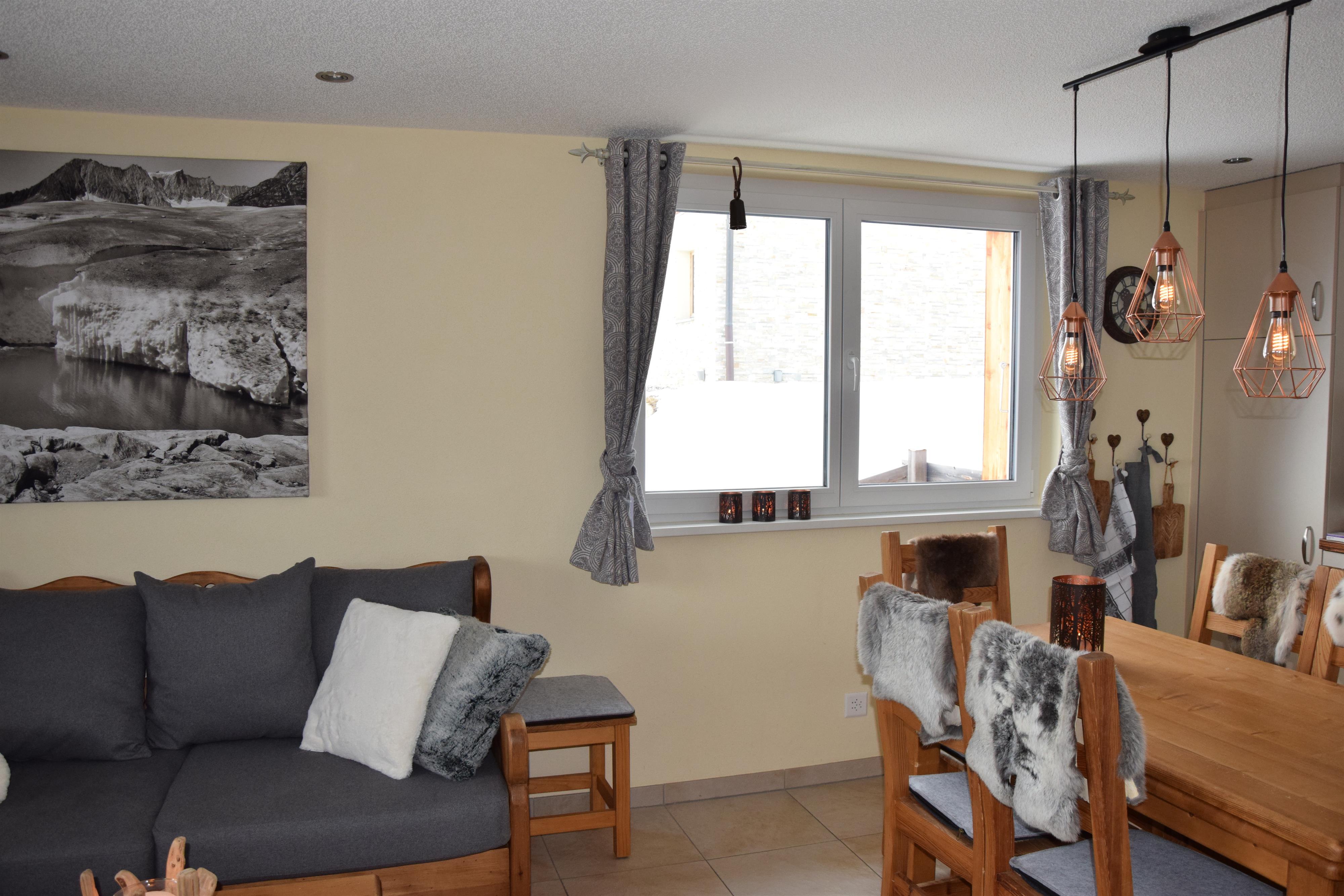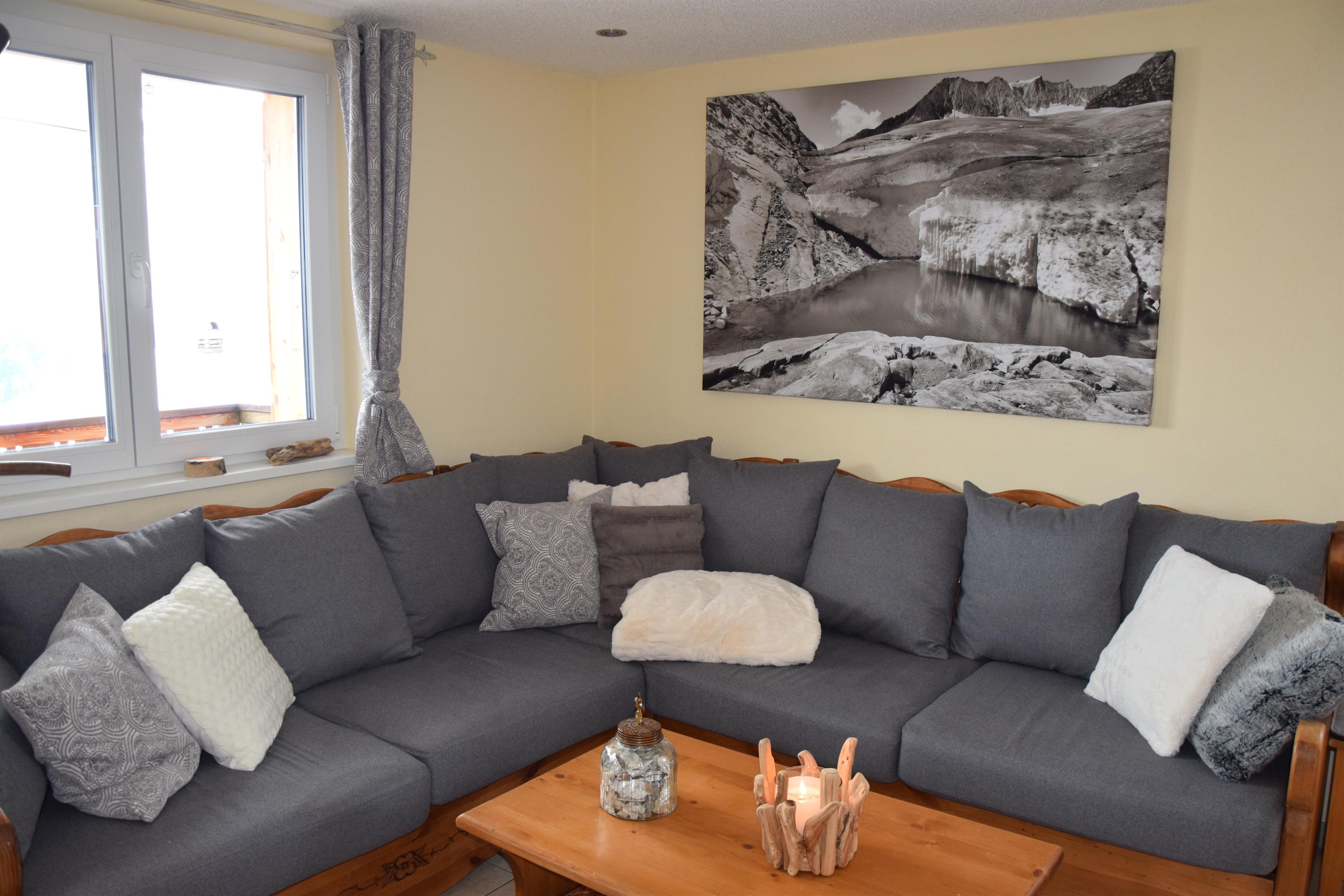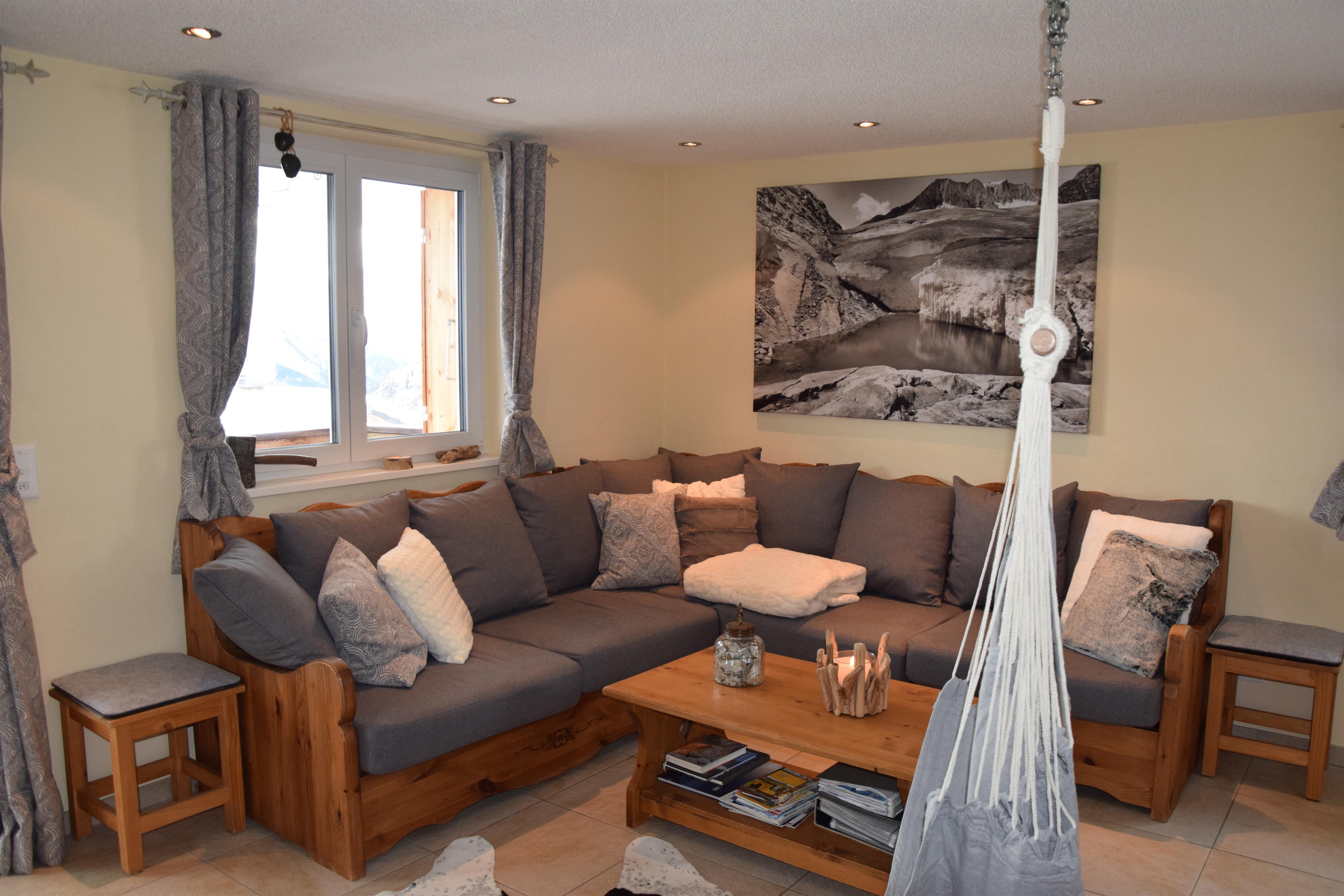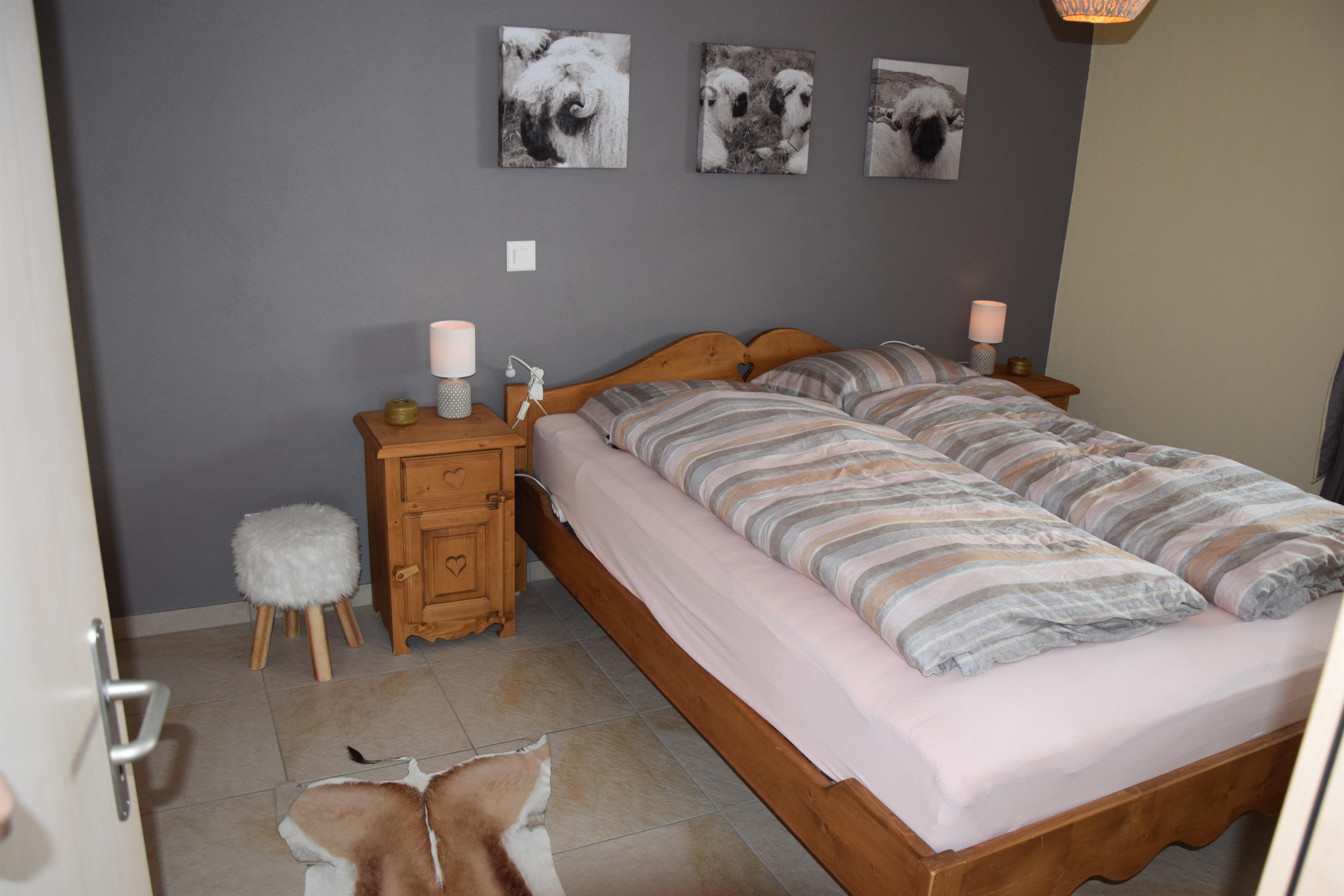 Sehr stilvolle 4.5 Zimmerwohnung mit 8 Betten in neuwertigem Chalet. 3 Schlafzimmer: Ein Schlafzimmer mit Doppelbett, ein Schlafzimmer mit 2 Etagenbetten und 1 Schlafzimmer mit 1 Etagenbett. (Etagenbetten auch für Erwachsene geeignet)