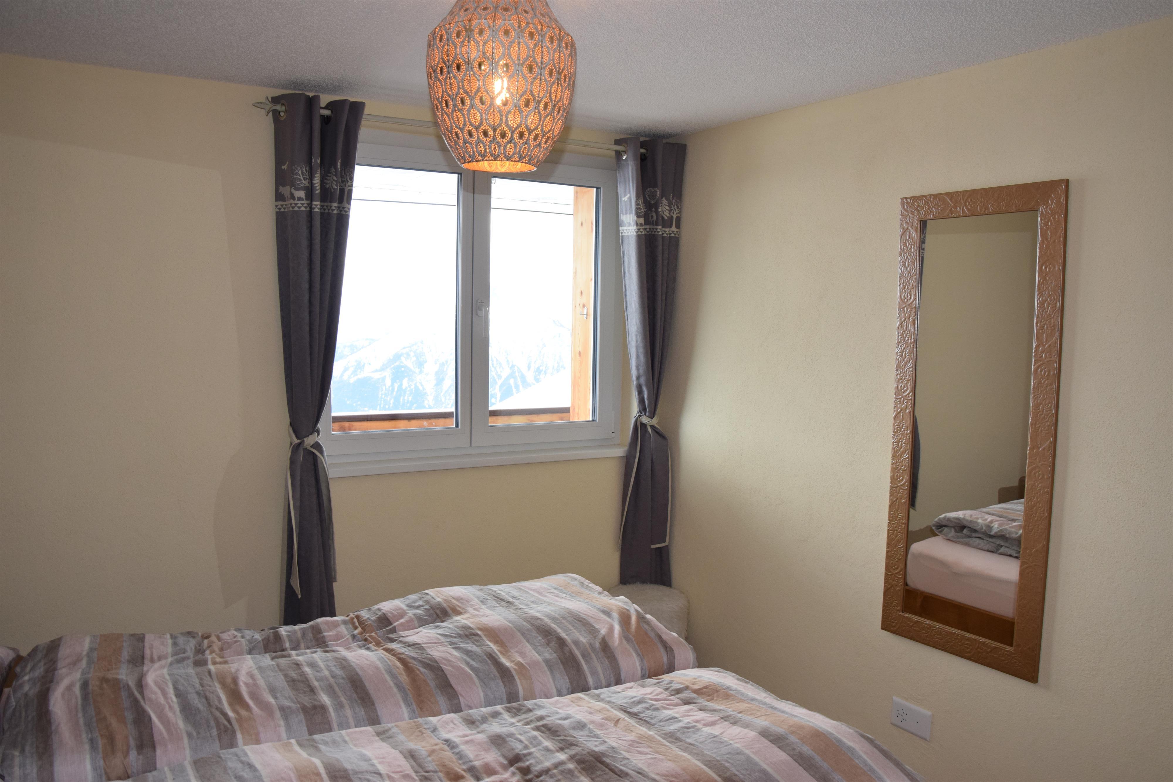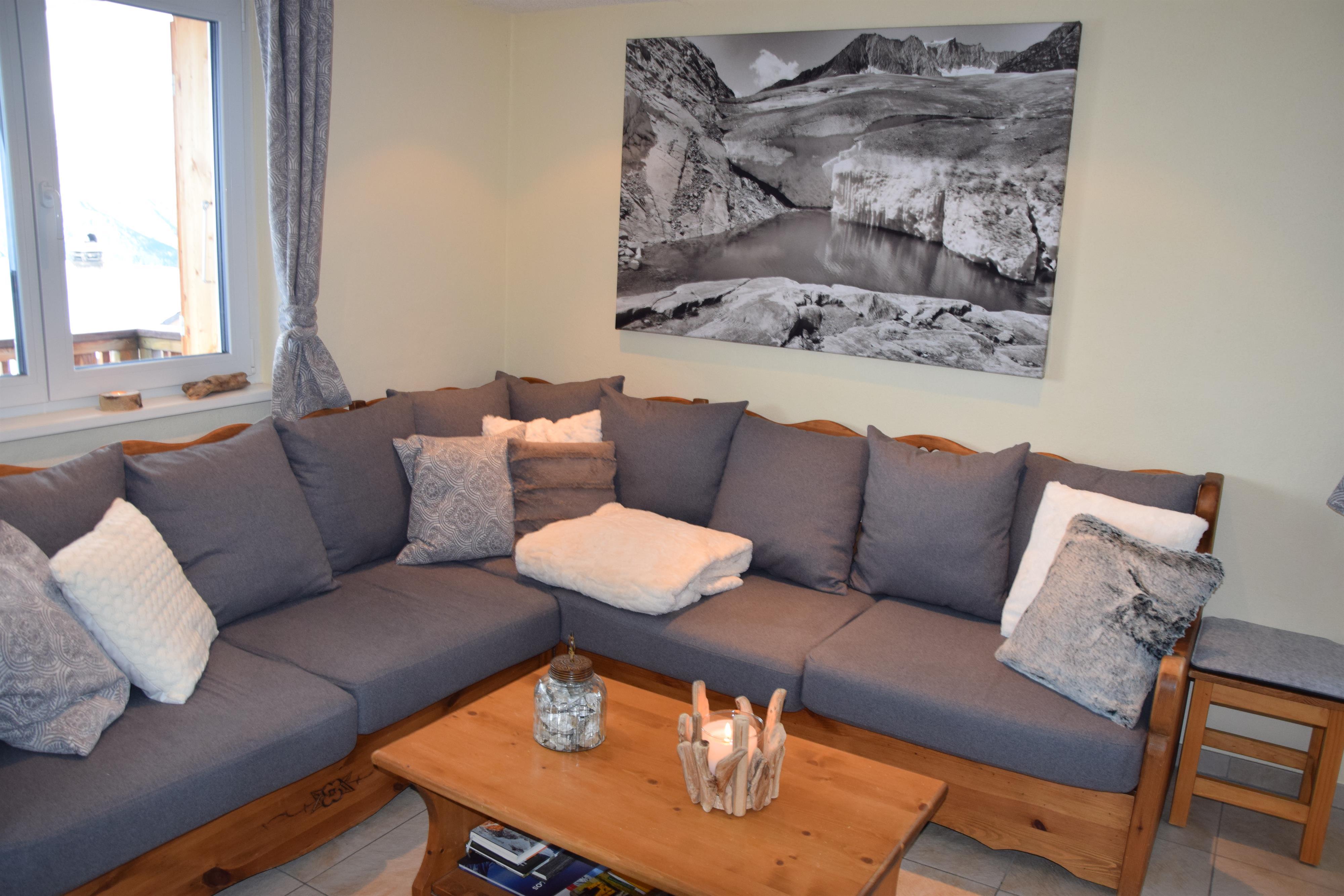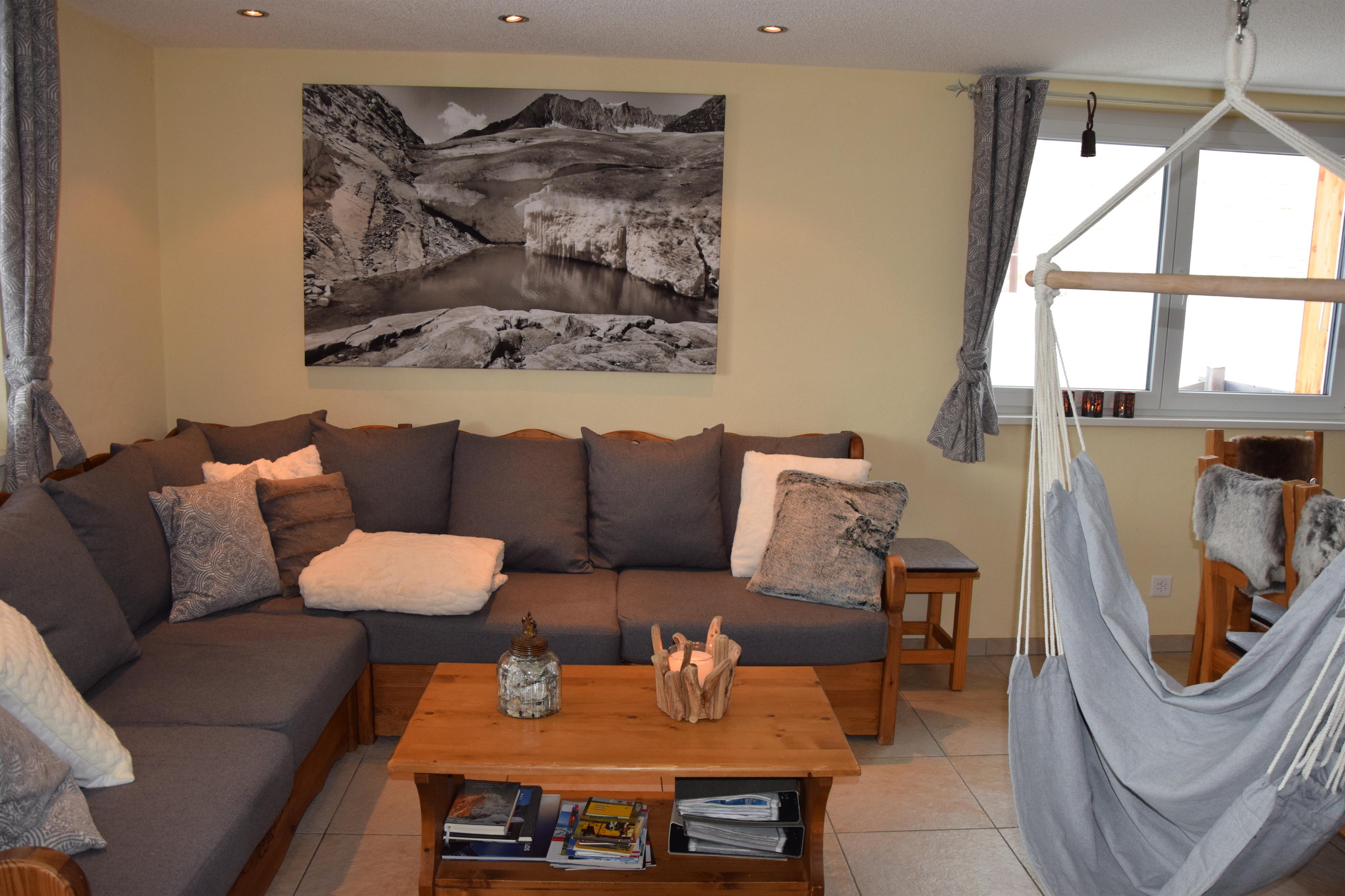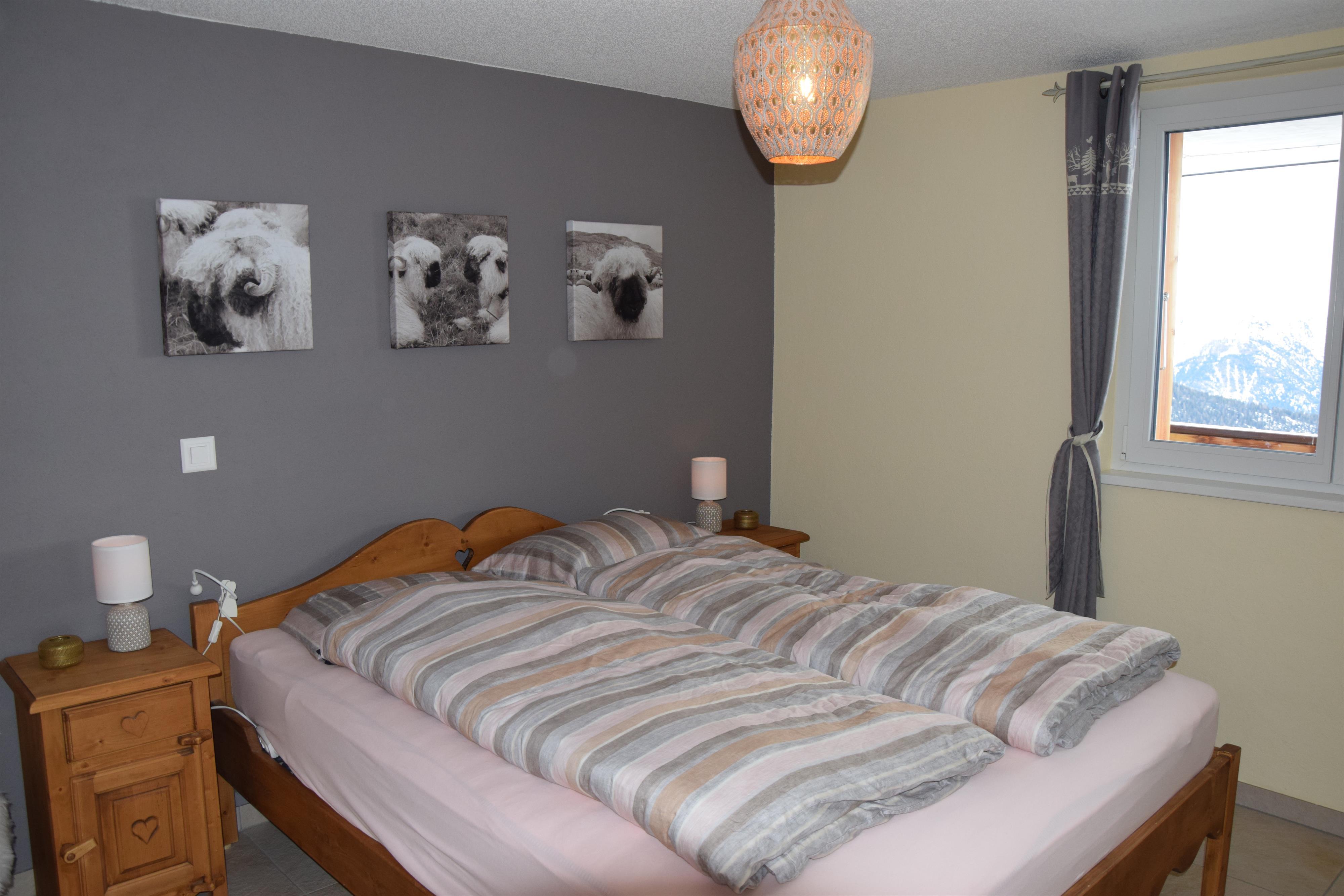 Sehr stilvolle 4.5 Zimmerwohnung mit 8 Betten in neuwertigem Chalet. 3 Schlafzimmer: Ein Schlafzimmer mit Doppelbett, ein Schlafzimmer mit 2 Etagenbetten und 1 Schlafzimmer mit 1 Etagenbett. (Etagenbetten auch für Erwachsene geeignet)
