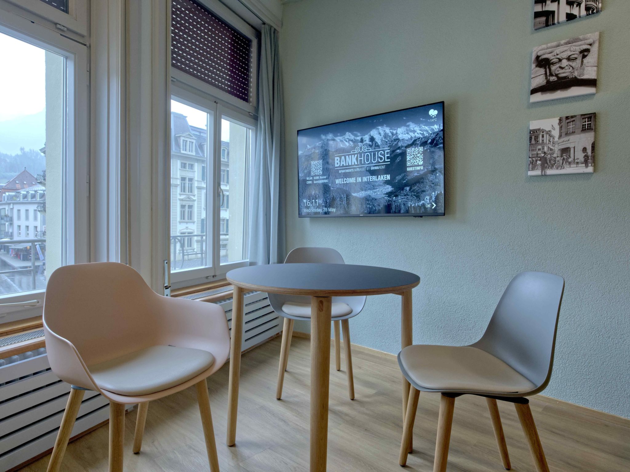 Das historische Gebäude, einst ein imposantes Bankhaus, befindet sich inmitten des pulsierenden Zentrums von Interlaken und ist nur wenige Schritte vom Bahnhof Interlaken West entfernt. Die Busstation ist nur wenige Meter vom Eingang entfernt.