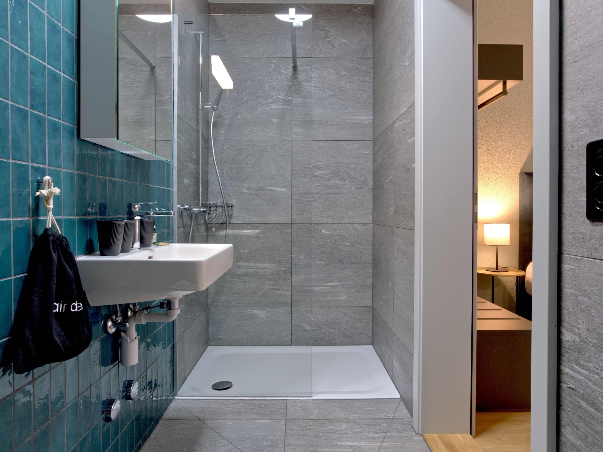 Das Badezimmer ist mit einer eleganten Dusche und einem WC ausgestattet. Die modernen Fliesen und die hochwertige Ausstattung verleihen dem Raum eine angenehme Atmosphäre.