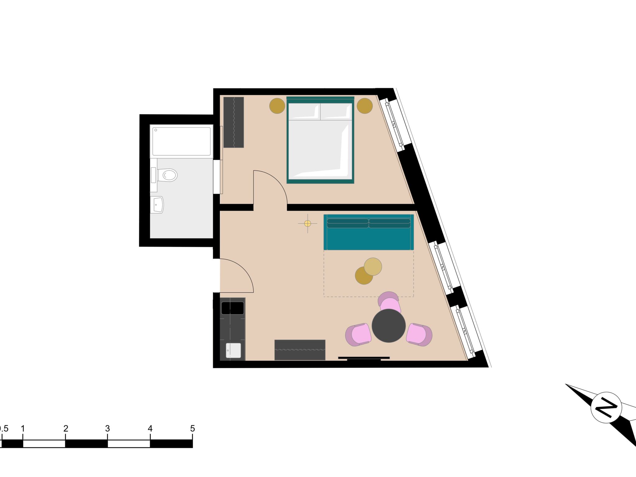 Das Apartment besticht durch seine Helligkeit, die durch die großen Fenster und die ausgewählte Farbgestaltung noch verstärkt wird. Die geschmackvolle und hochwertige Einrichtung sorgt für eine perfekte Mischung aus Funktionalität und Wohlfühlcharakter.