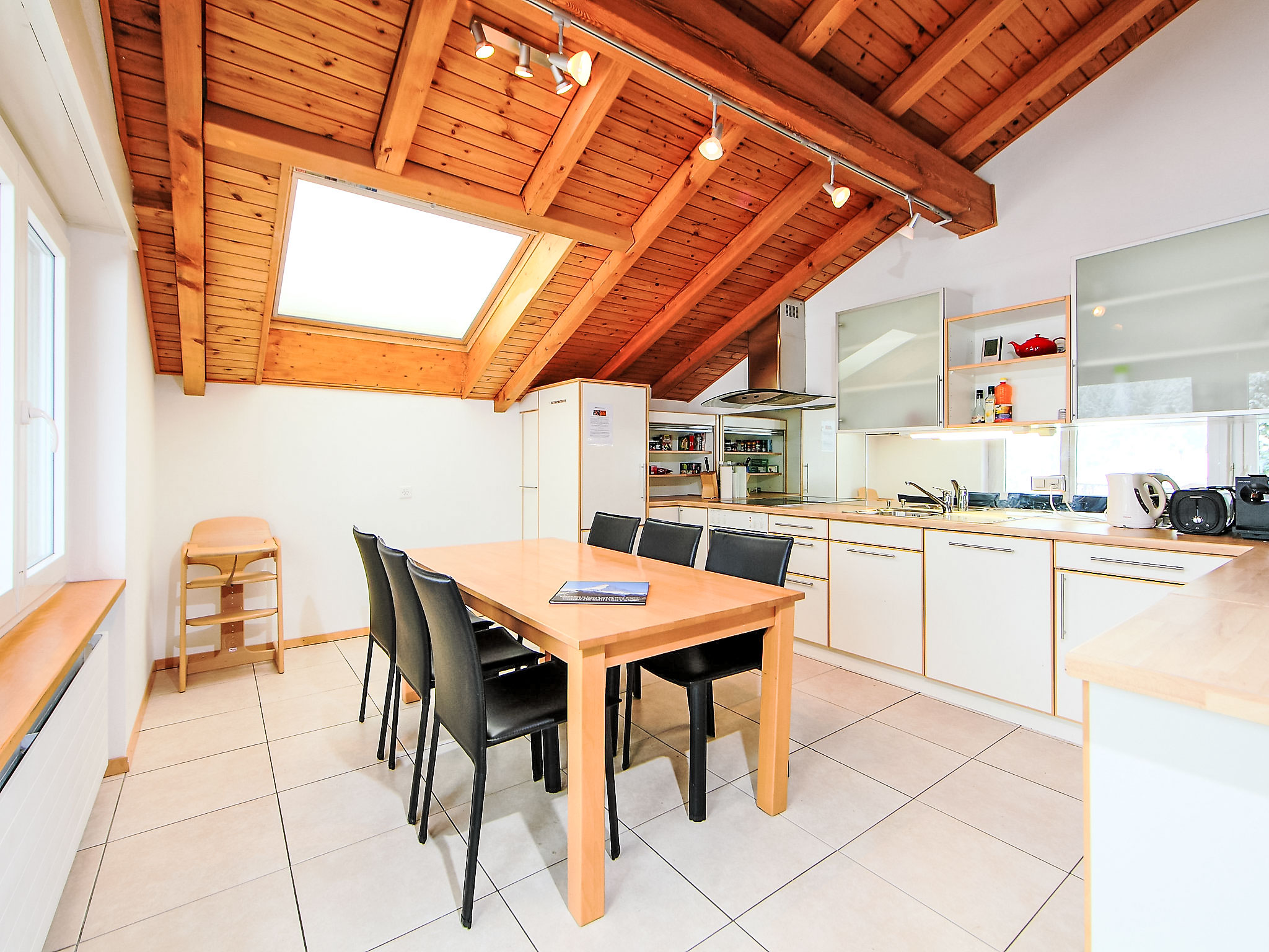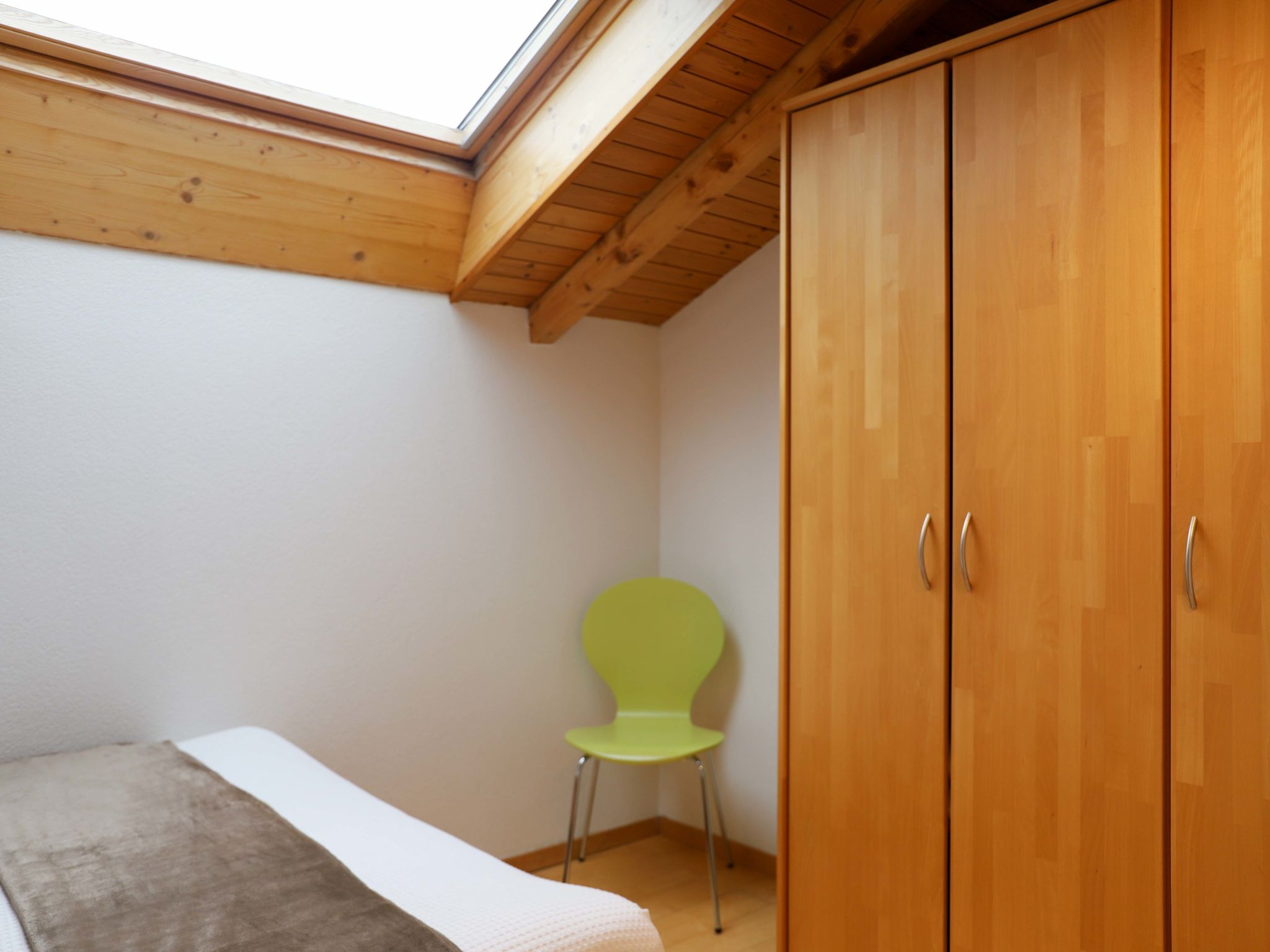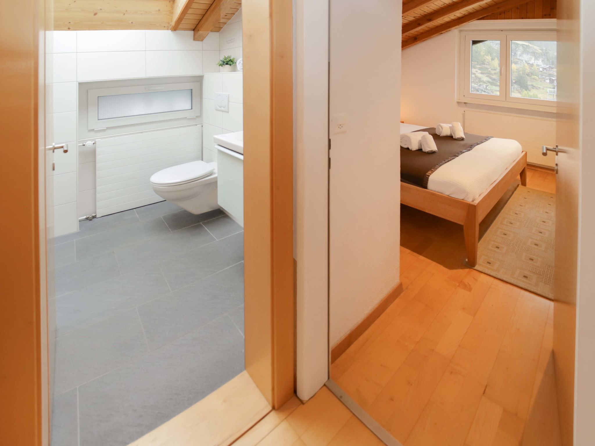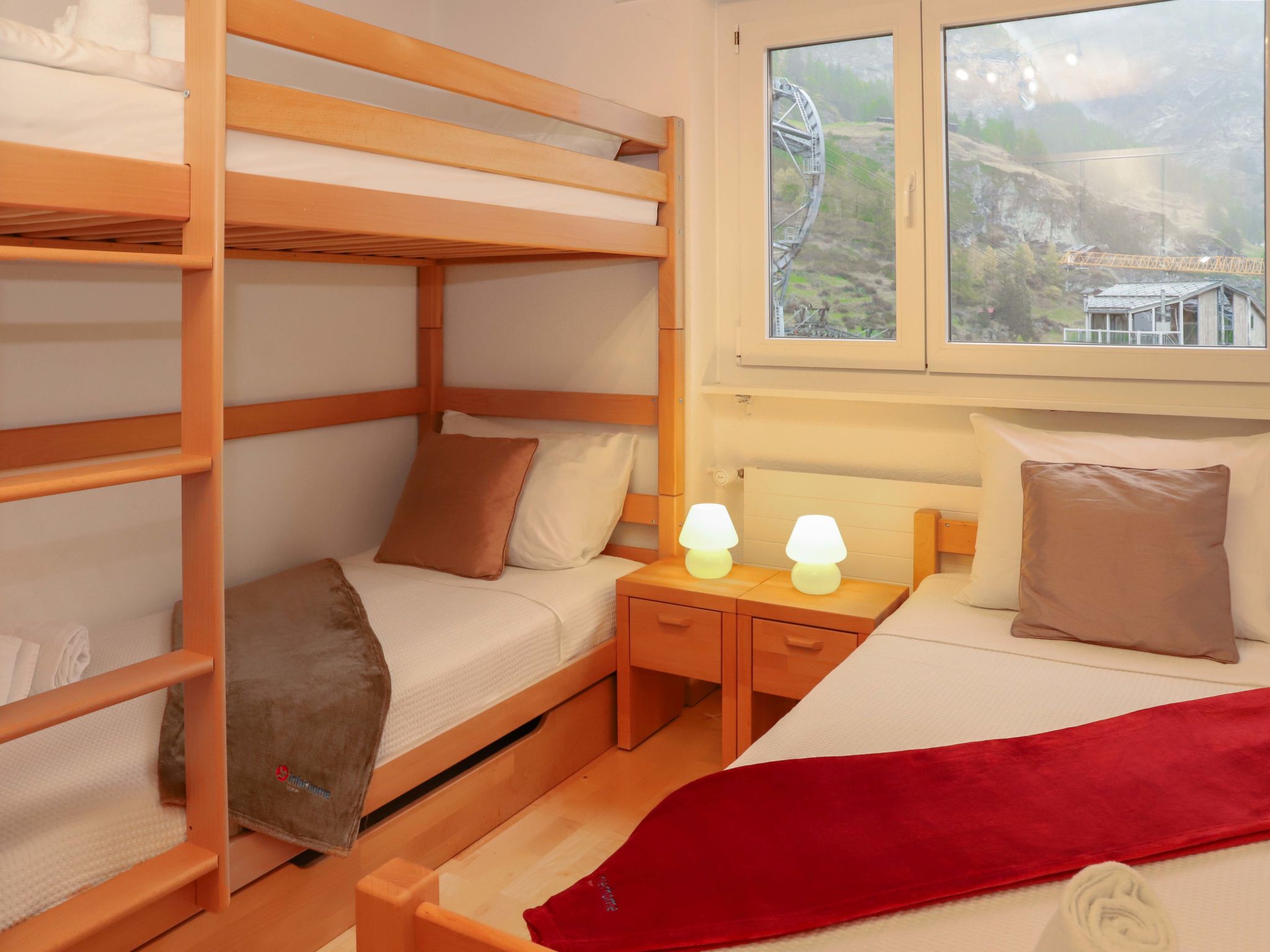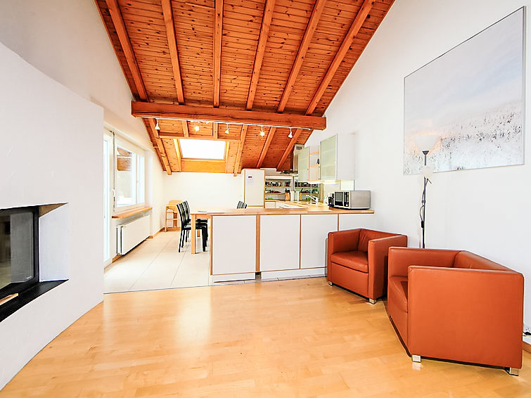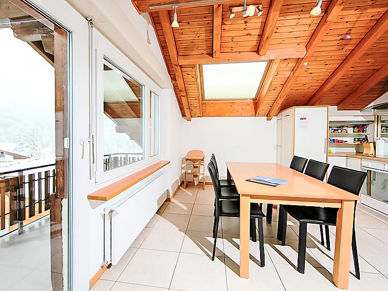 4-Zimmer-Attikawohnung 116 m2 im 3. Stock. Hell, schön und modern eingerichtet: offenes Wohnzimmer mit TV. Ausgang zum Balkon. 1 Zimmer mit 1 Doppelbett (2 x 90 cm, Länge 200 cm). 1 Zimmer mit 1 Doppelbett (1 x 150 cm, Länge 200 cm). 1 Zimmer mit 1 Bett (90 cm, Länge 200 cm), 1 x 2 Etagenbetten (90 cm, Länge 200 cm). Grosse, offene Küche (Backofen, Geschirrspüler, 3 Glaskeramikplatten, Toaster, Wasserkocher, Tiefkühler, elektrische Kaffeemaschine, Racletteofen, Fondue Set (Käse)) mit Esstisch. Bad/WC, Dusche/WC. Balkon, Südlage. Balkonmöbel. Panoramasicht auf das Matterhorn. Zur Verfügung: Haartrockner. Internet (WLAN, gratis). Bitte beachten: Nichtraucher-Unterkunft.
