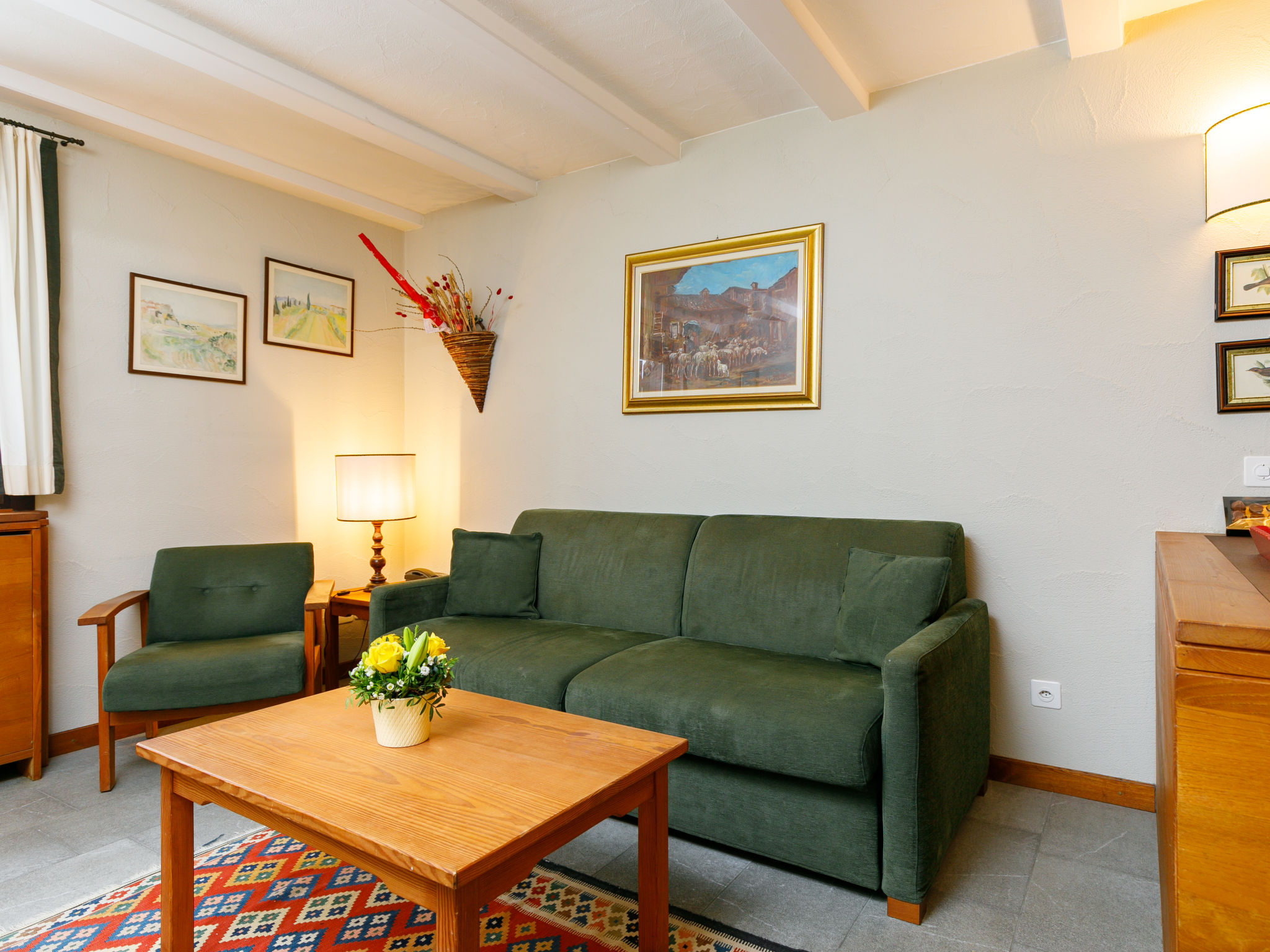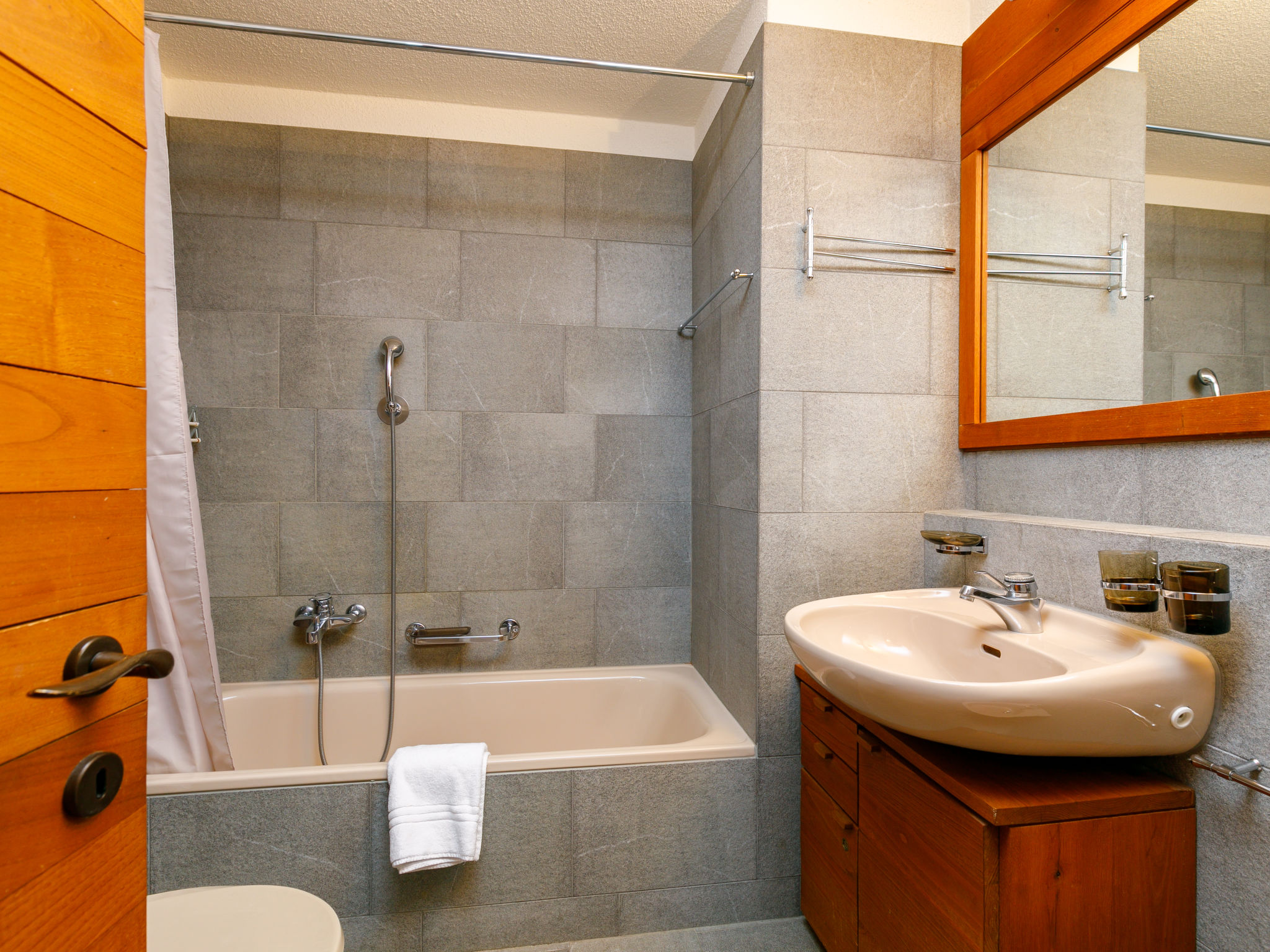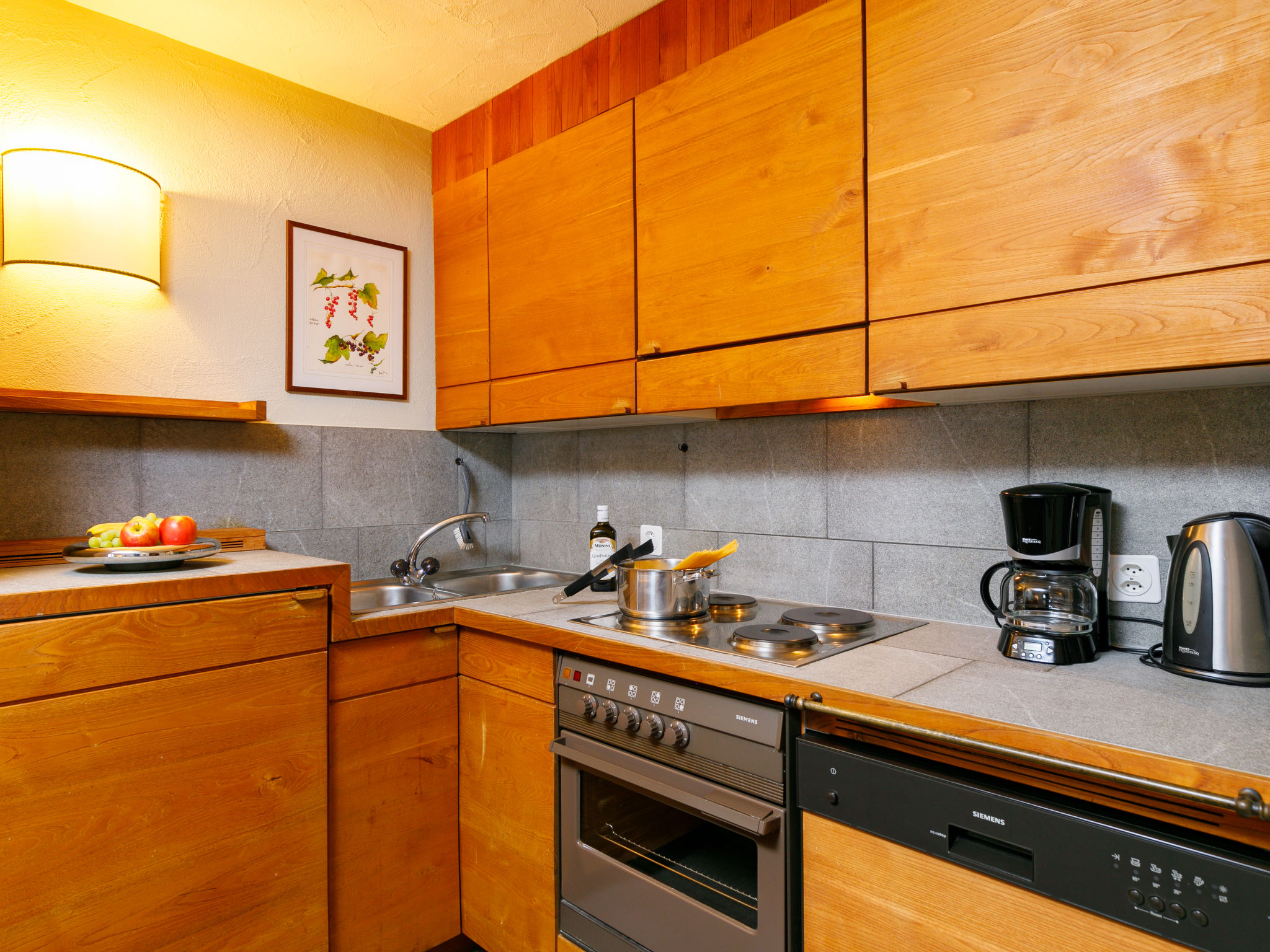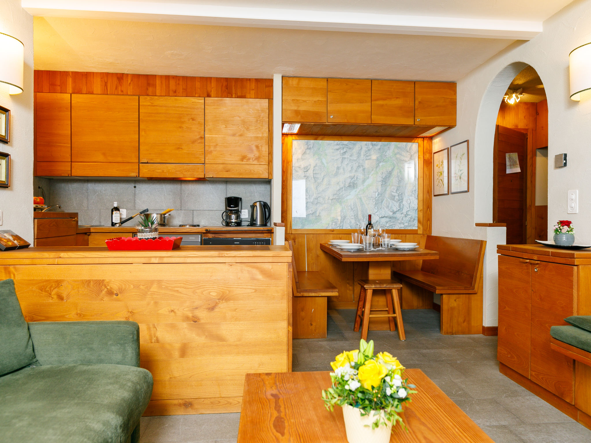 "Residenza Chesa Margun 34-2", 2-Zimmer-Wohnung 47 m2, Nordlage. Vollständig renoviert, komfortabel und gemütlich eingerichtet: Wohn-/Esszimmer mit 1 Doppeldiwanbett, TV und Radio. 1 Zimmer mit 2 Betten. Kochnische (Backofen, Geschirrspüler). Bad/WC. CH44664