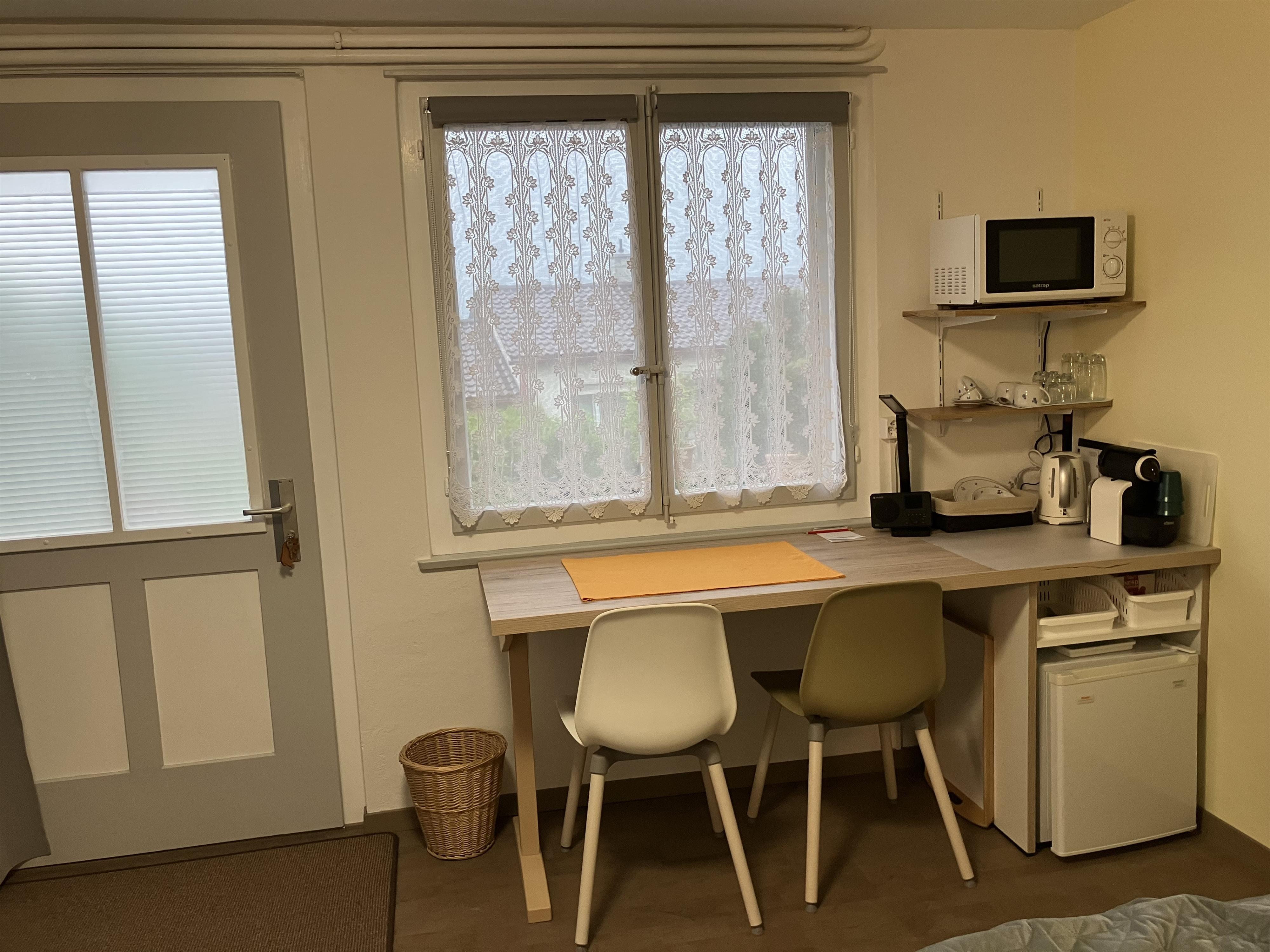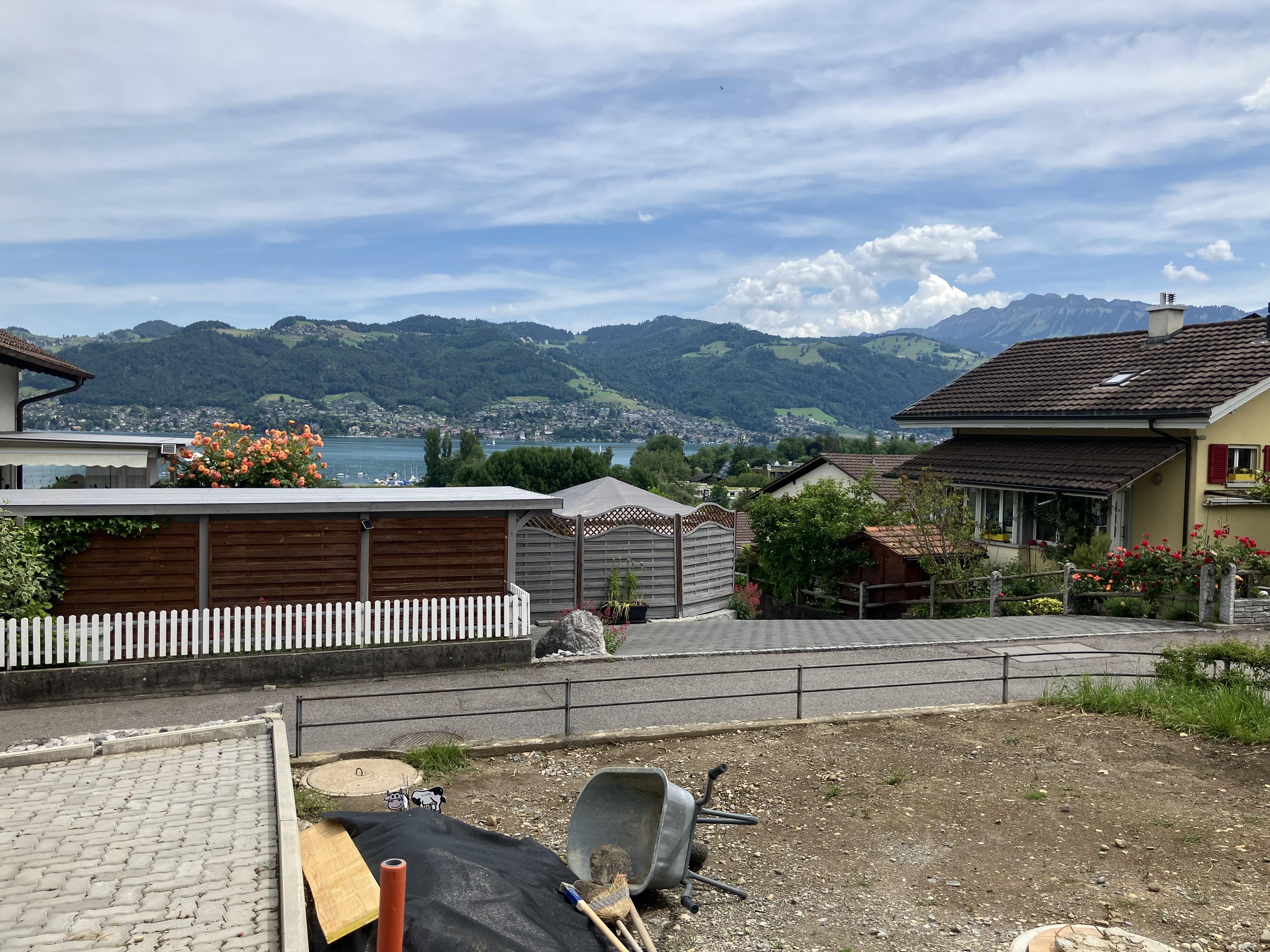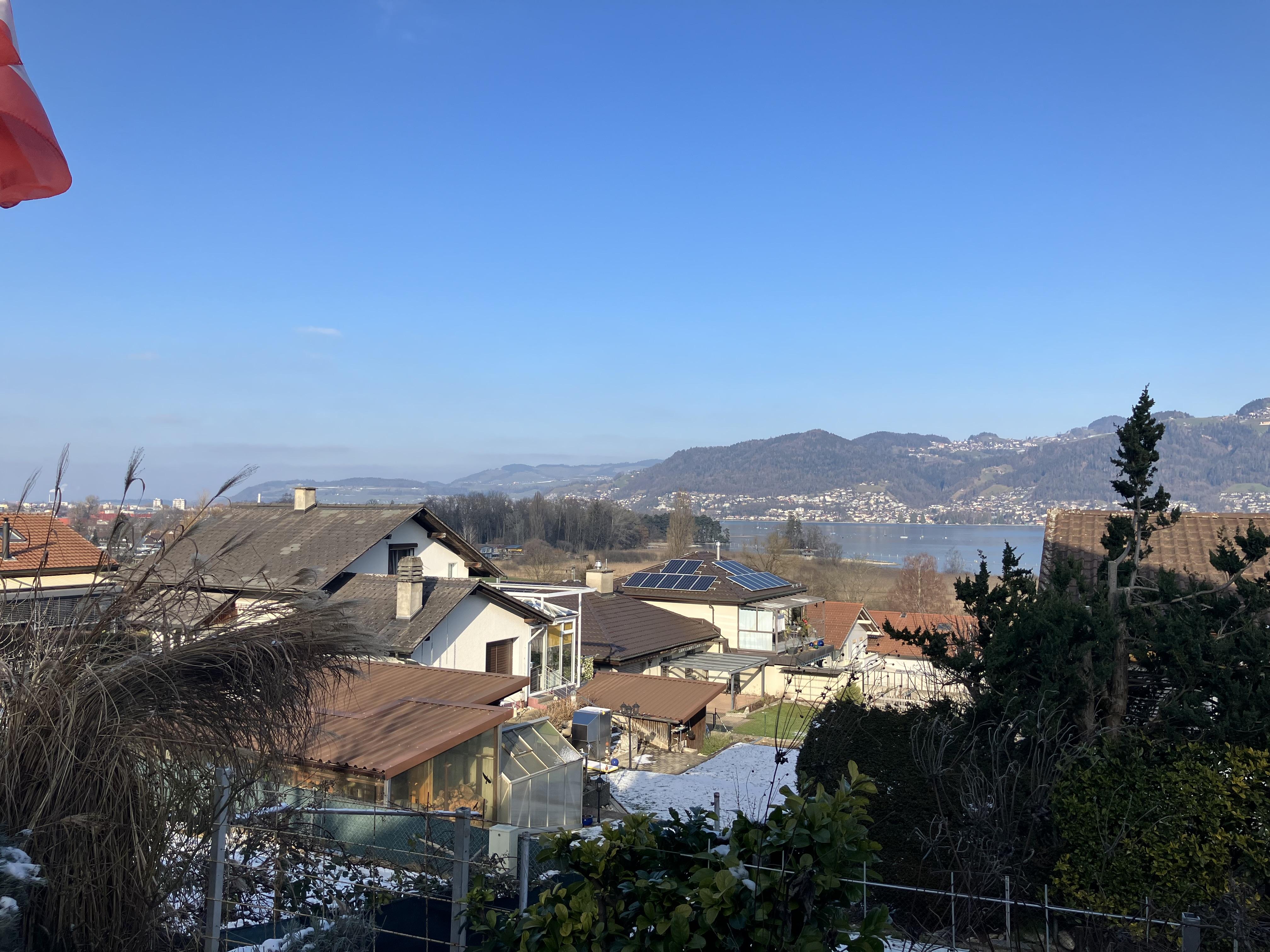 Ein Zimmer im Erdgeschoss eines Einfamilienhauses mit eigenem Eingang und Parkplatz. Den Gästen steht ein Aussensitzplatz mit Sicht auf See und Berge zur Verfügung.