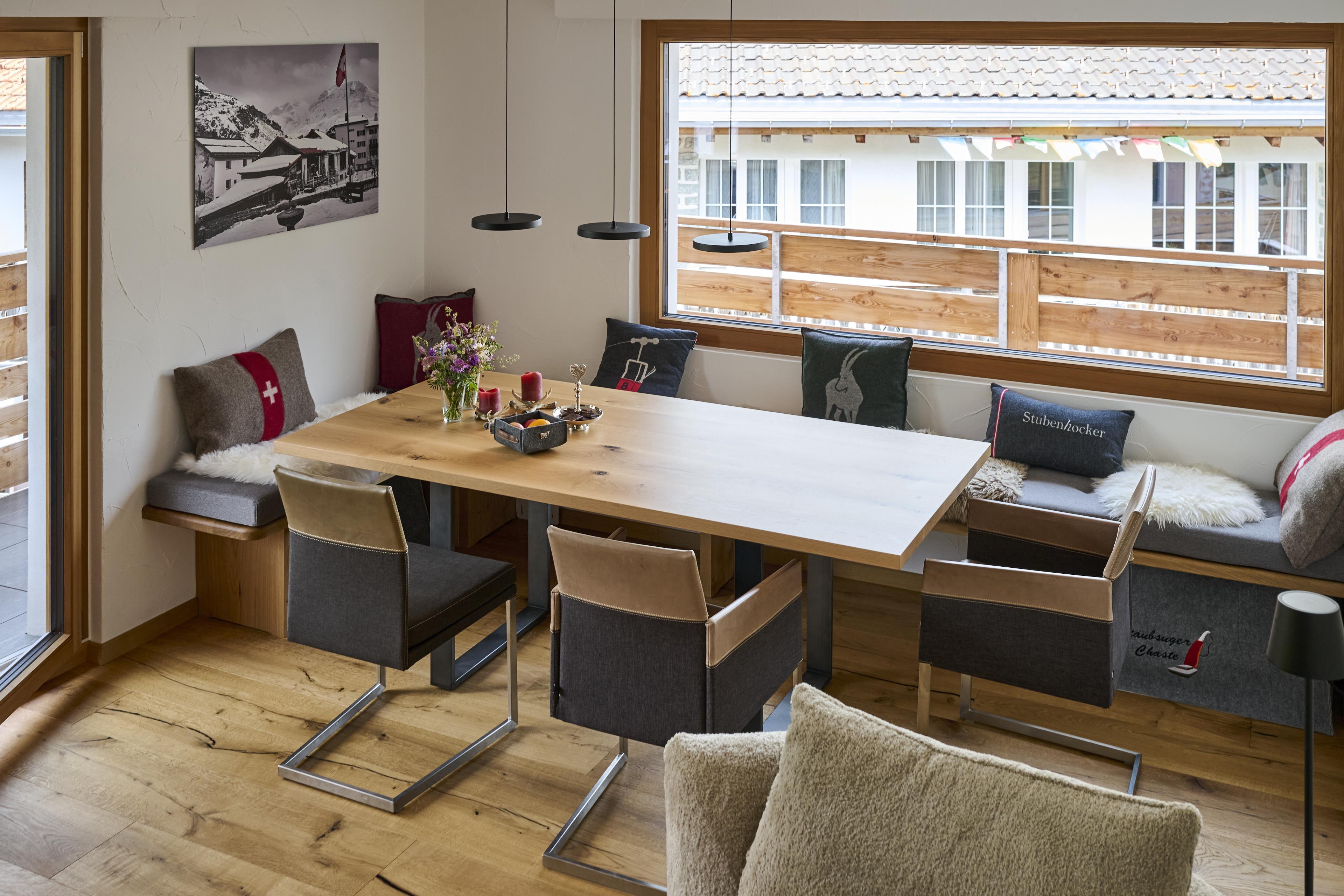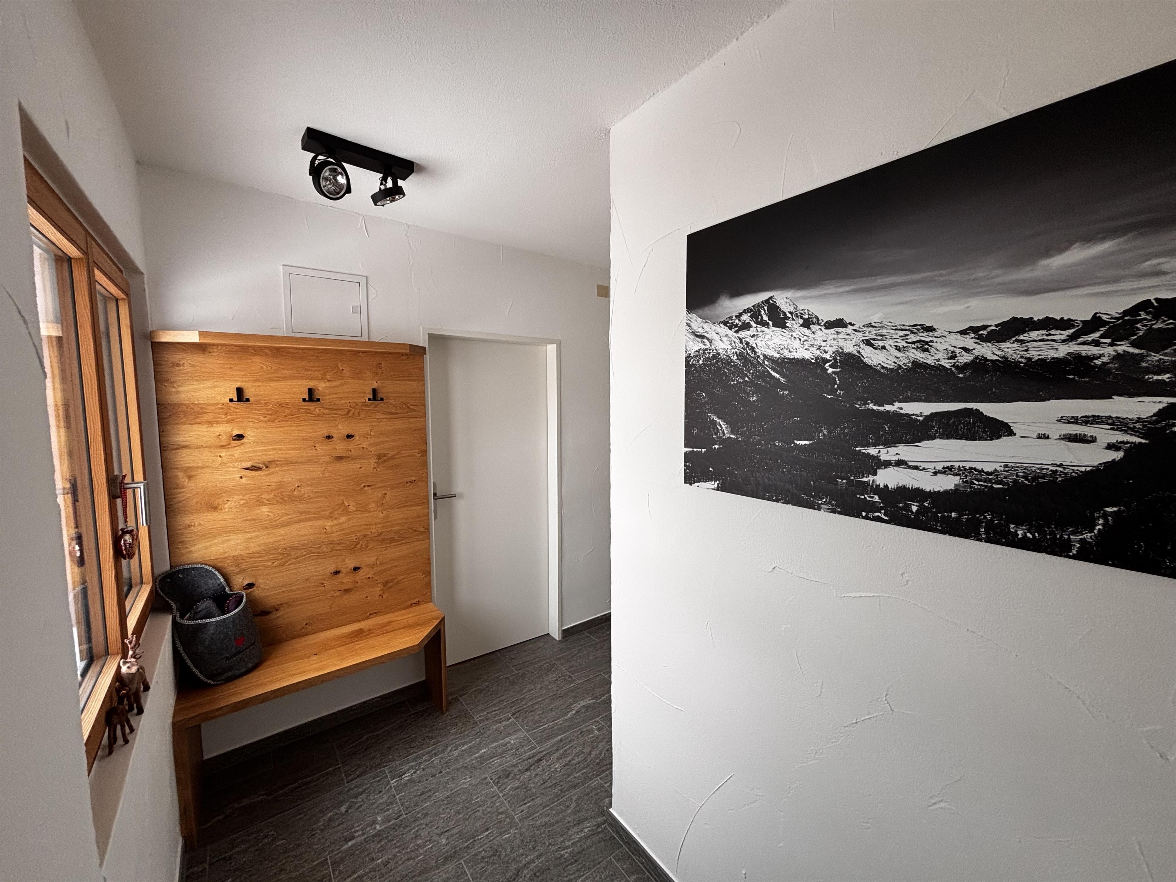 3-Zimmer-Wohnung mit grossem Balkon (52 m²) in einem Mehrfamilienhaus. Zugang: Treppe neben dem Volg hinauf, dann links der Hauseingang. Die Wohnung verfügt über zwei Schlafzimmer mit Doppelbetten. Bettwäsche, Küchentücher und Frottierwäsche sind vorhanden. Auch Besteck, ein Fondueset und ein Racletteset stehen vor Ort zur Verfügung. Die Küche ist ins Wohnzimmer integriert. Nichtraucherwohnung. Haustiere sind nicht erlaubt. Waschmaschine und Tumbler befinden sich im Skiraum. Gratis WLAN ist vorhanden.