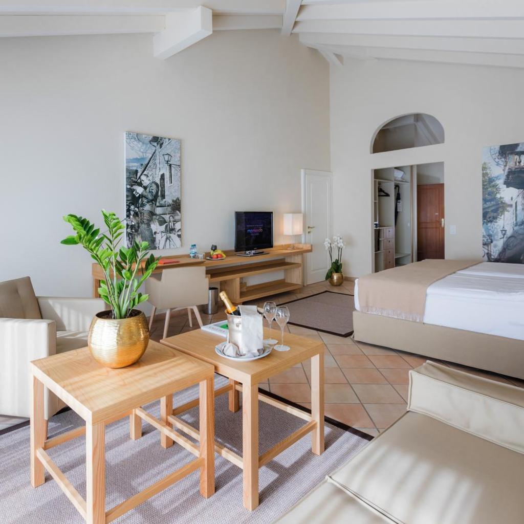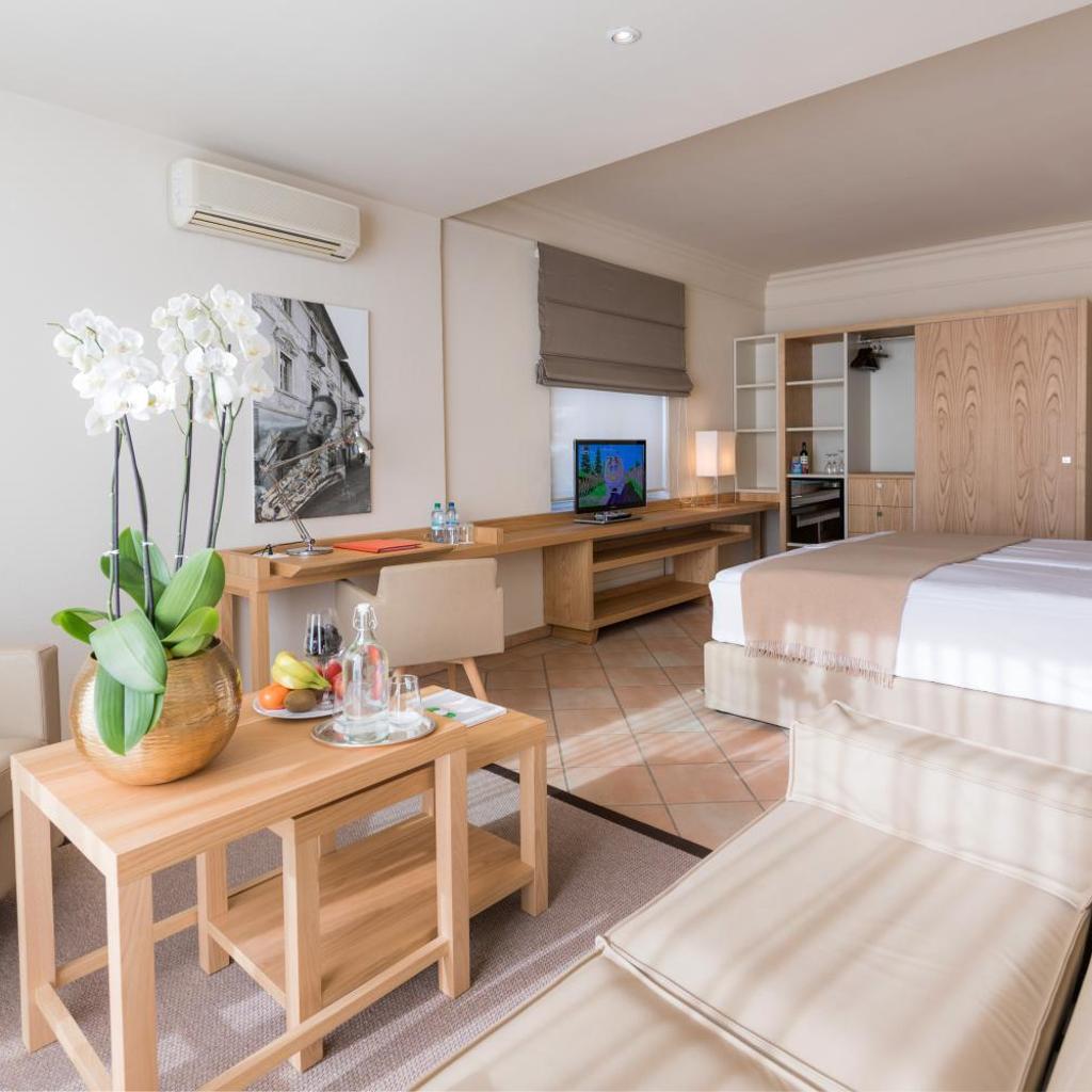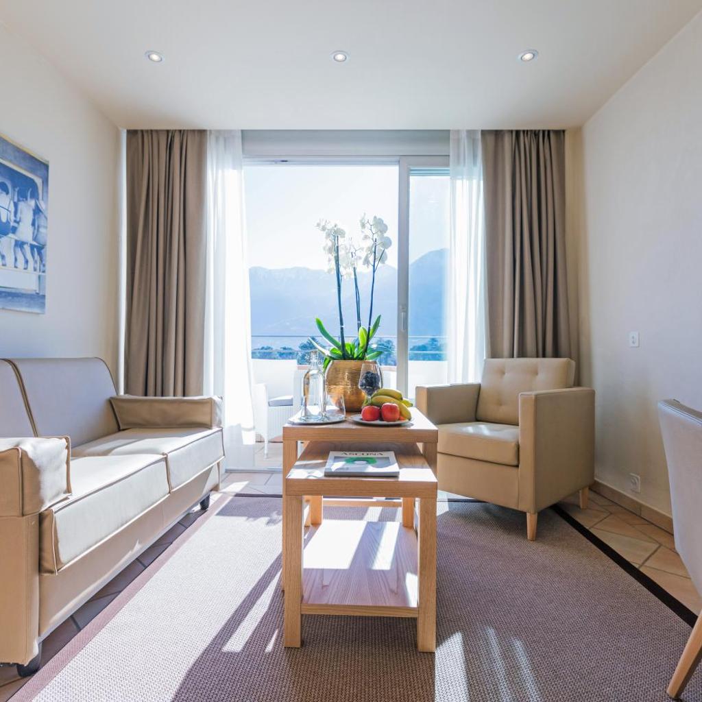 Die geräumigen, klassischen und klimatisierten Zimmer und Suiten der Unterkunft sind mit einem Marmorbad, einem Flachbild-Sat-TV und einer Minibar ausgestattet. Die meisten Zimmer bieten zudem einen Balkon mit Blick auf die umliegenden Berge.
