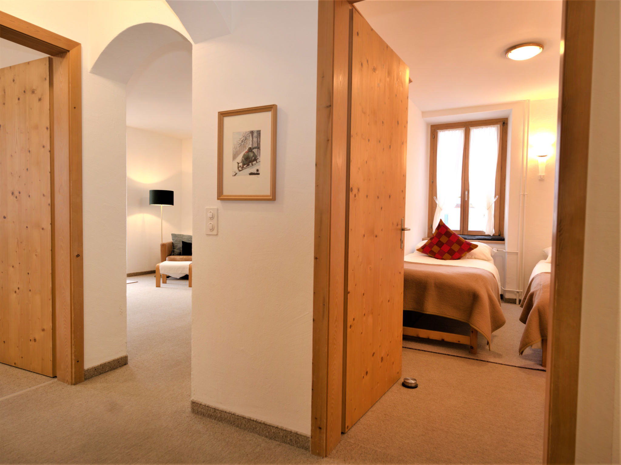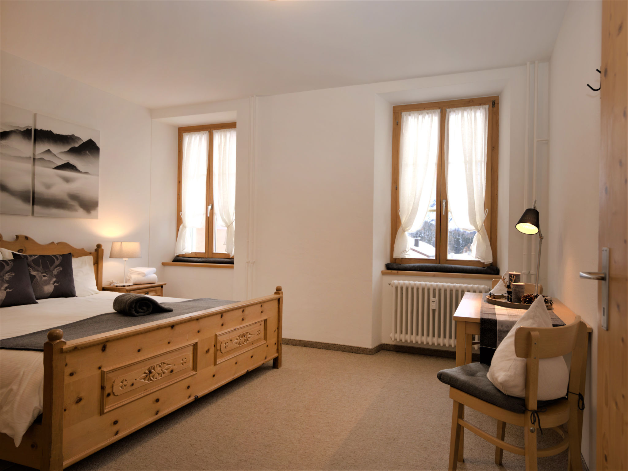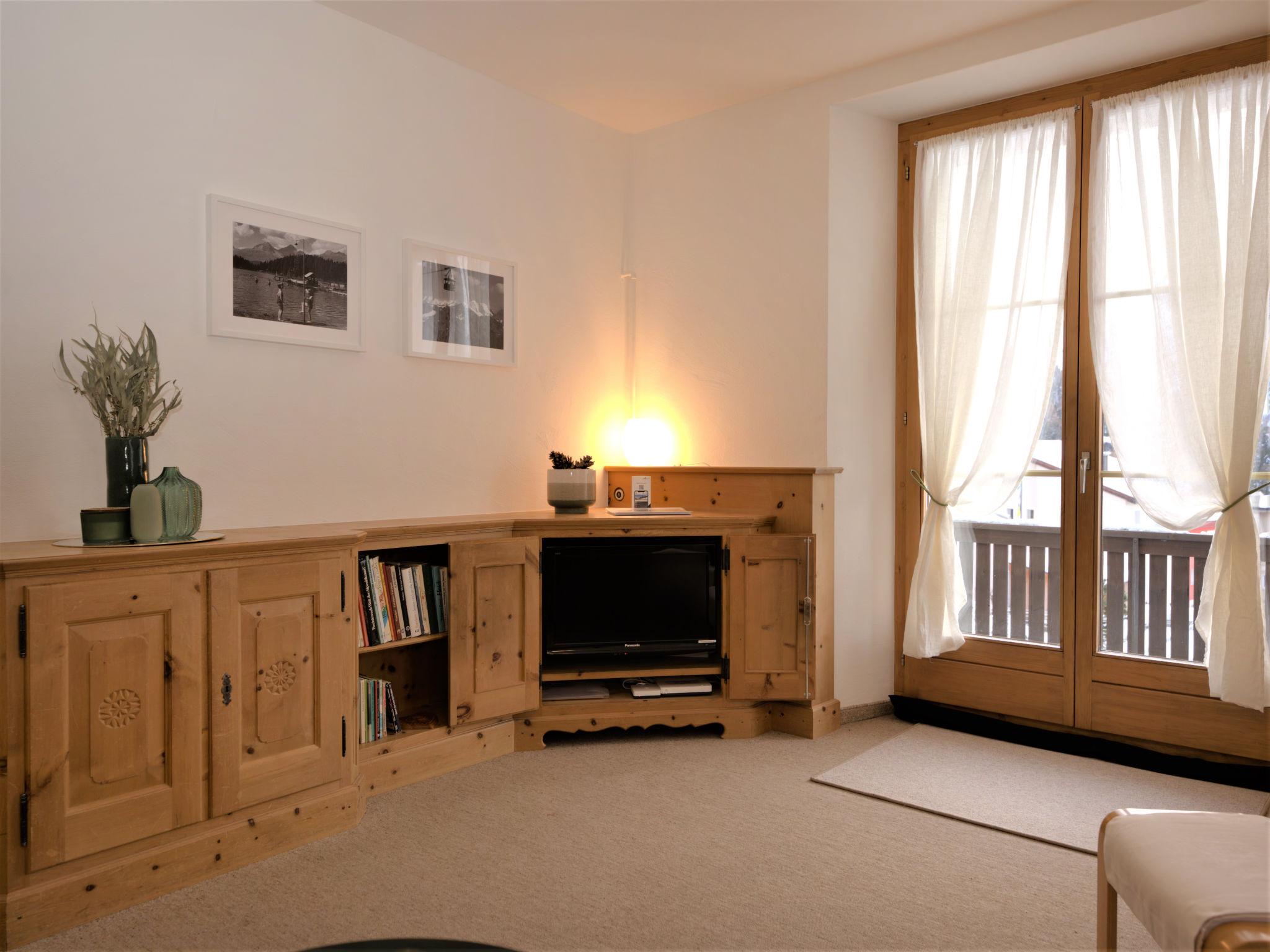 "Chesa Corvatsch", 3-Zimmer-Wohnung 67 m2, im Erdgeschoss. Schön und gemütlich eingerichtet: Wohnzimmer mit TV und E-Heizofen. Ausgang zum Balkon, Richtung Südwesten. 1 Doppelzimmer mit 1 Doppelbett (2 x 85 cm, Länge 190 cm). 1 Zimmer mit 2 Betten (100 cm, Länge 200 cm). Küche (Backofen, Geschirrspüler, 4 Glaskeramikplatten, Toaster, Wasserkocher, Mikrowelle, elektrische Kaffeemaschine, Kapseln für die Kaffeemaschine (Nespresso) extra, Fondue Set (Chinoise, Käse)) mit Esstisch. Sitzbad/WC. Heizung. Teppichboden. Kleiner Balkon. Terrassenmöbel. Schöne Fernsicht auf die Berge. Zur Verfügung: Bügeleisen, Haartrockner. Internet (Wireless LAN, gratis). Garage, Höhe 205 cm, Breite 200 cm. Bitte beachten: Nichtraucher-Unterkunft.