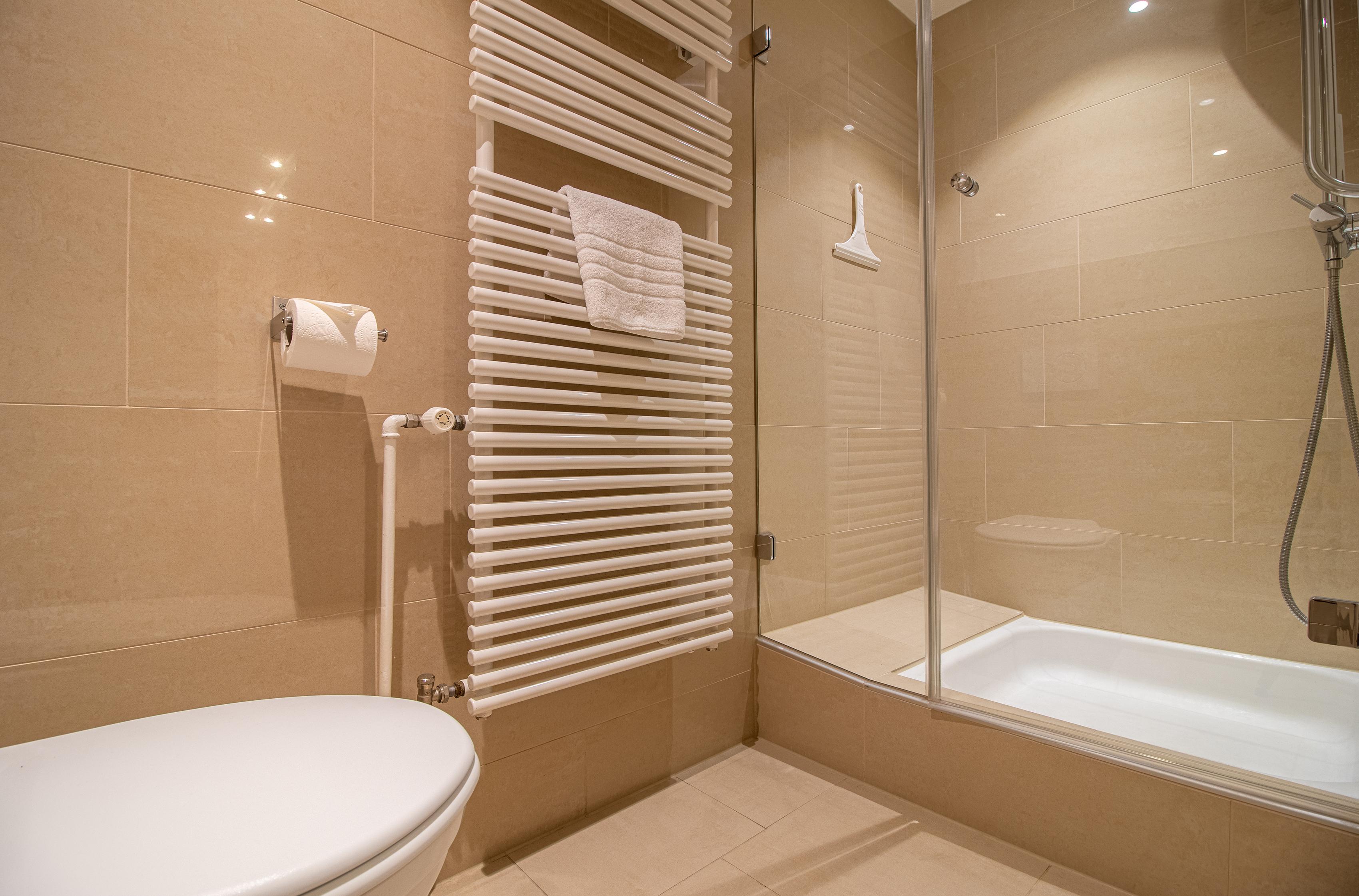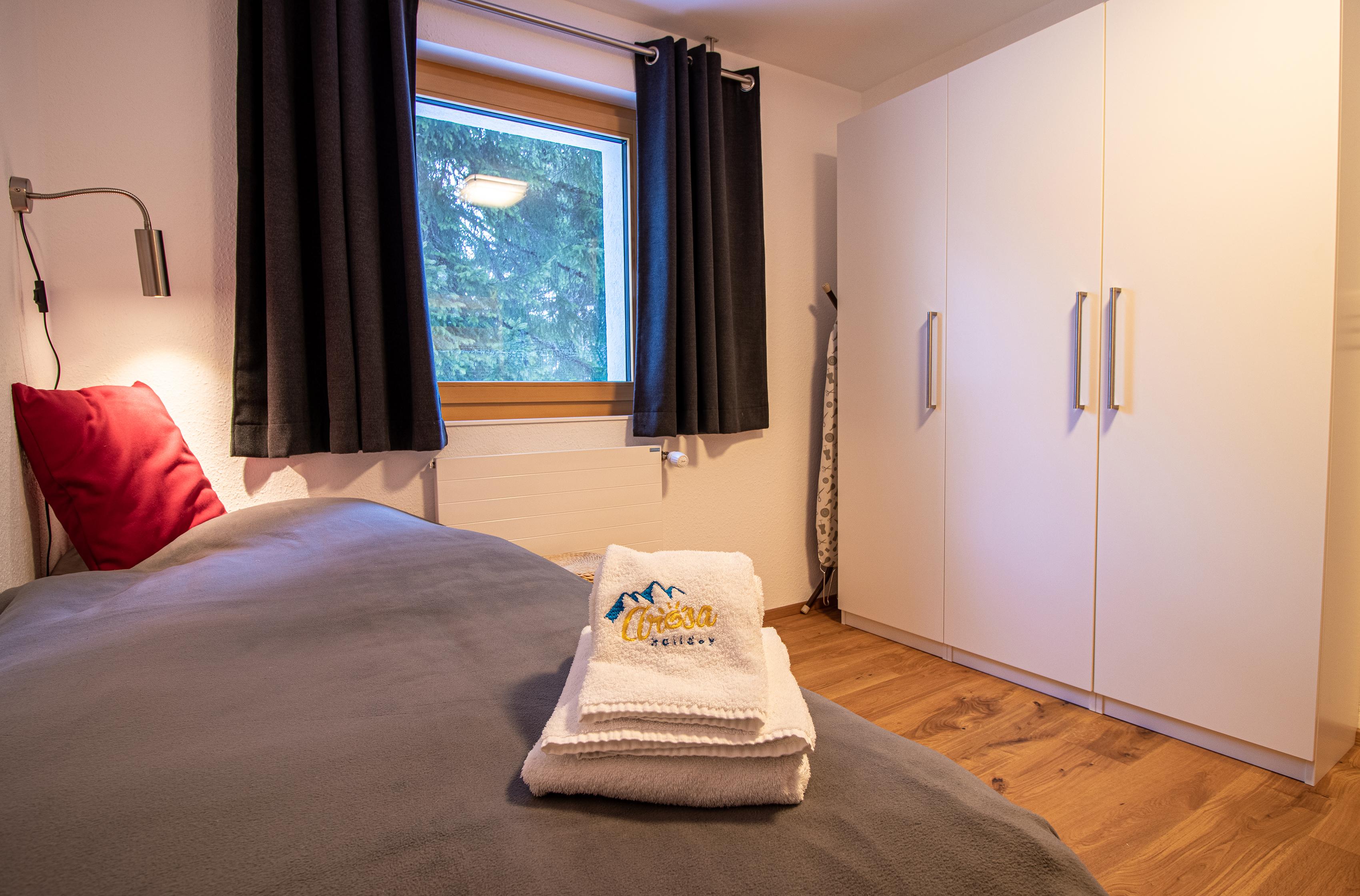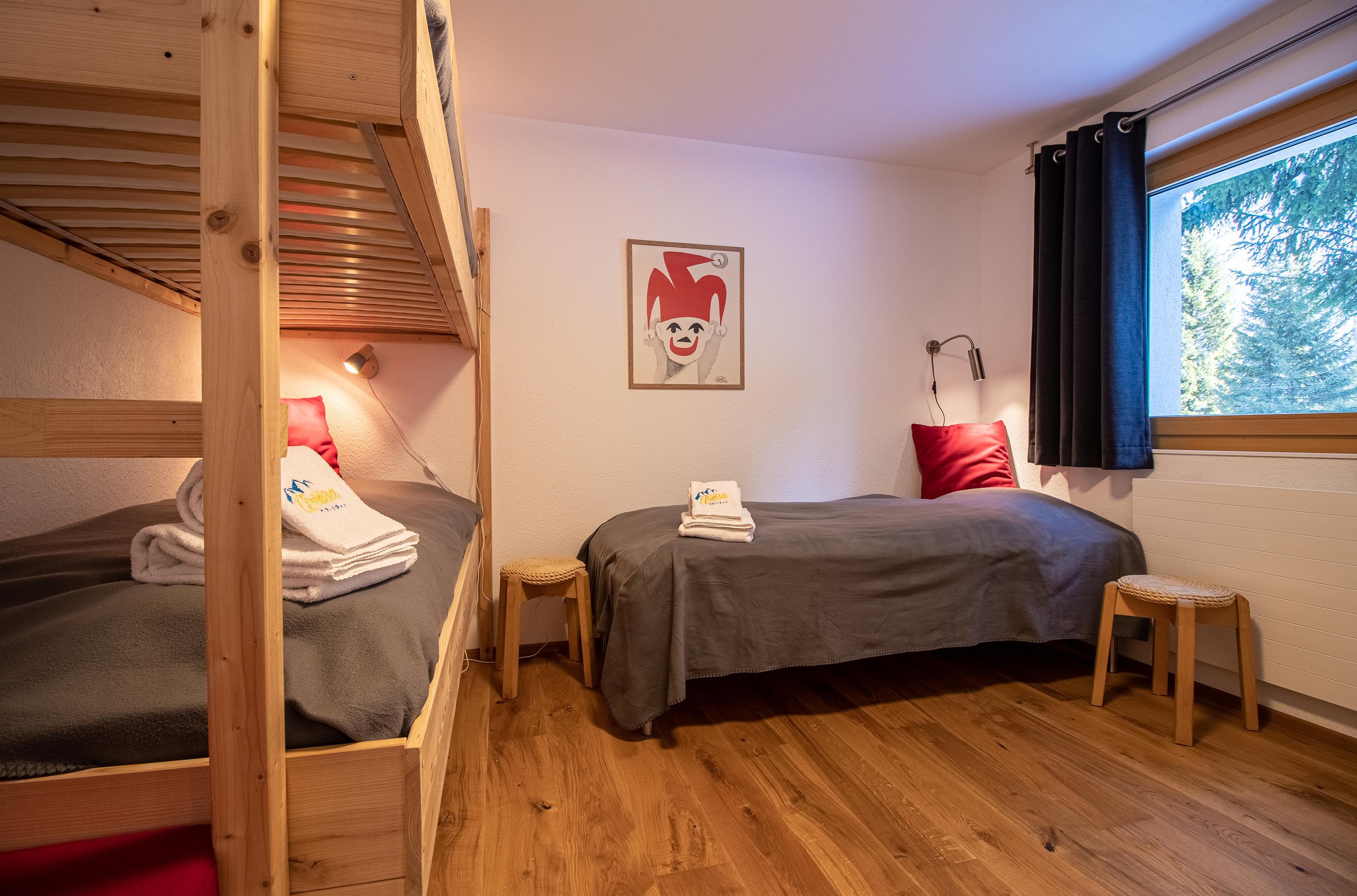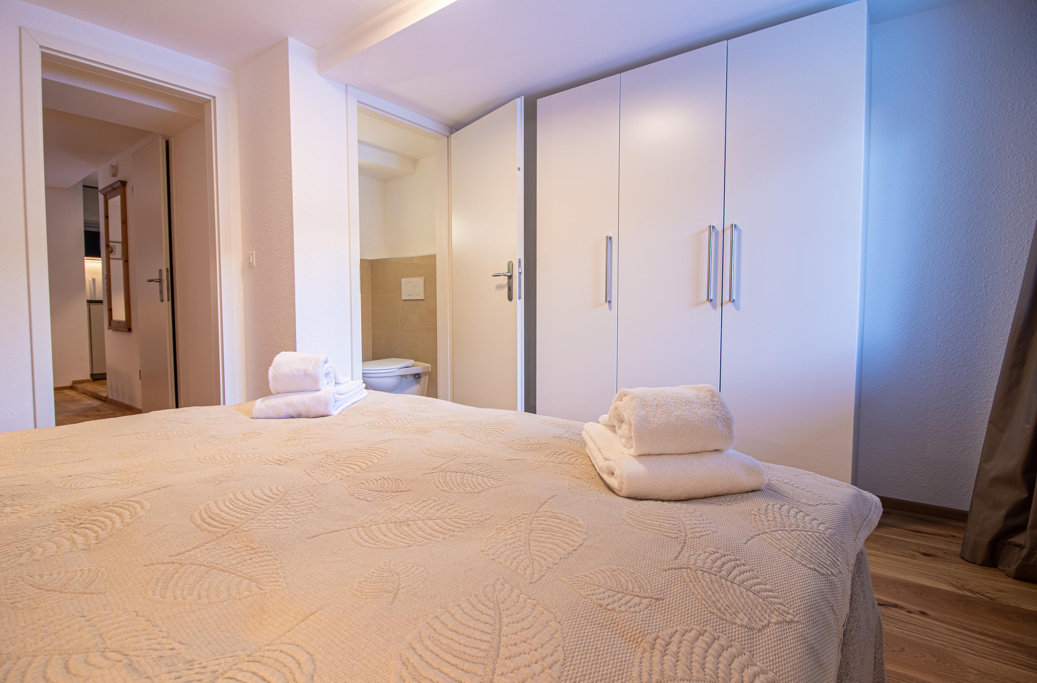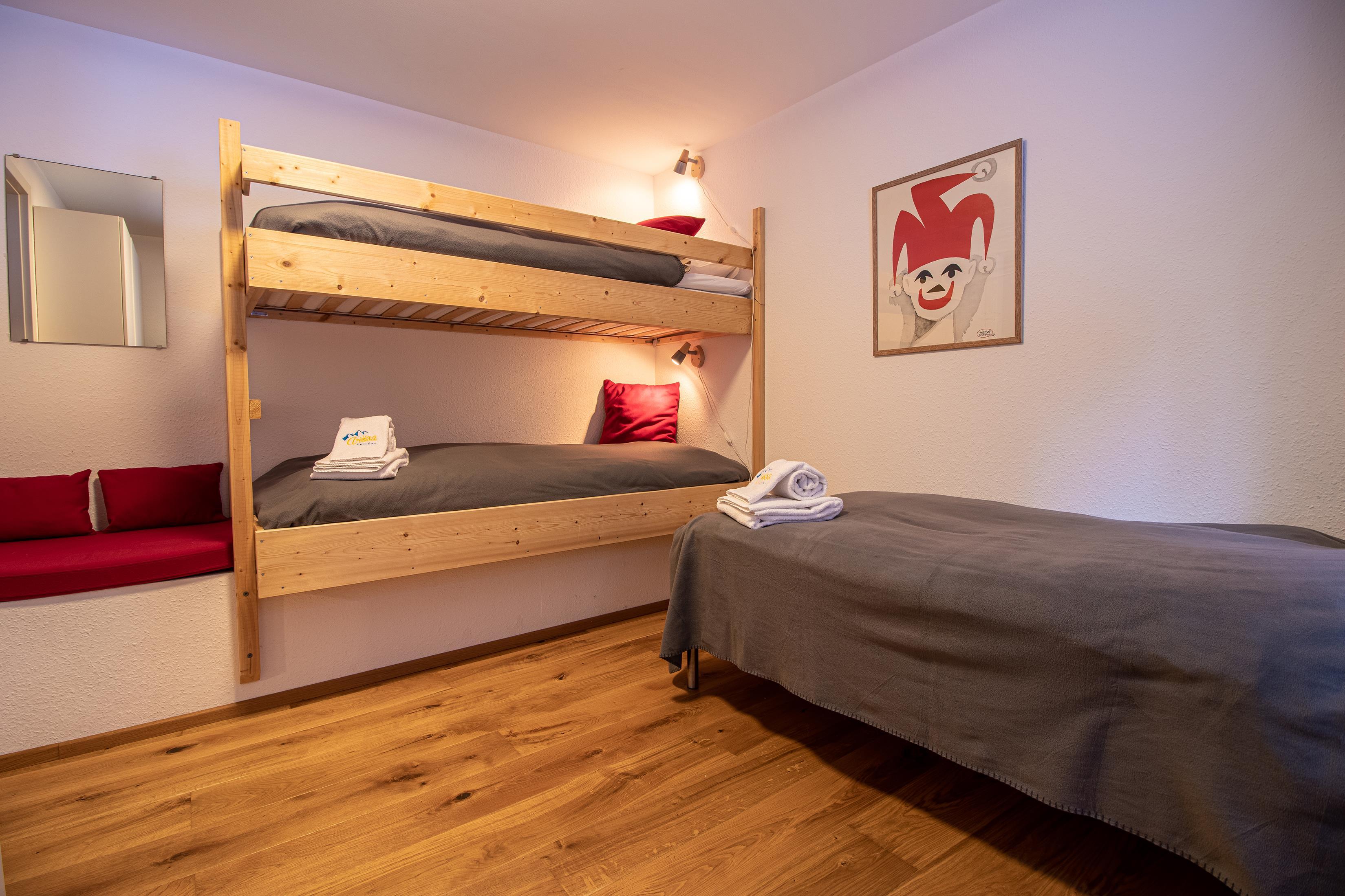 Die Wohnung hat 2 Schlafzimmer. Das Hauptschlafzimmer hat ein kleines Bad und ein Doppelbett. Das zweite Schlafzimmer hat ein Einzelbett und ein Etagenbett.